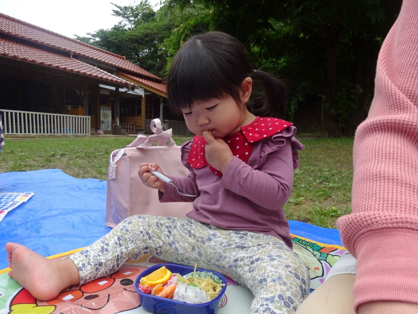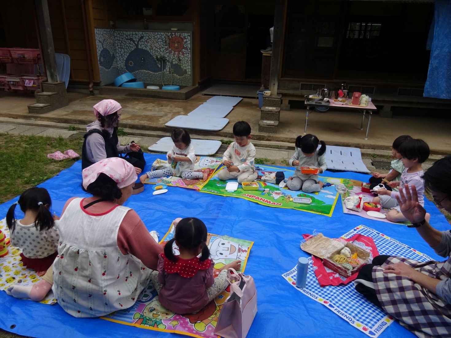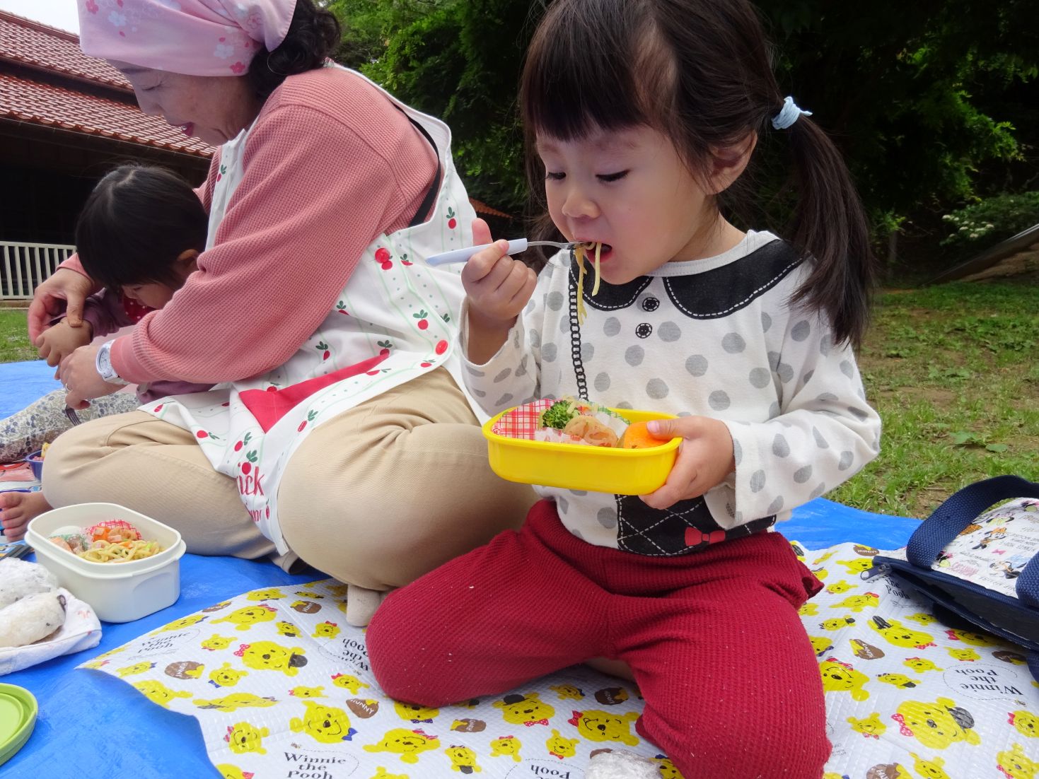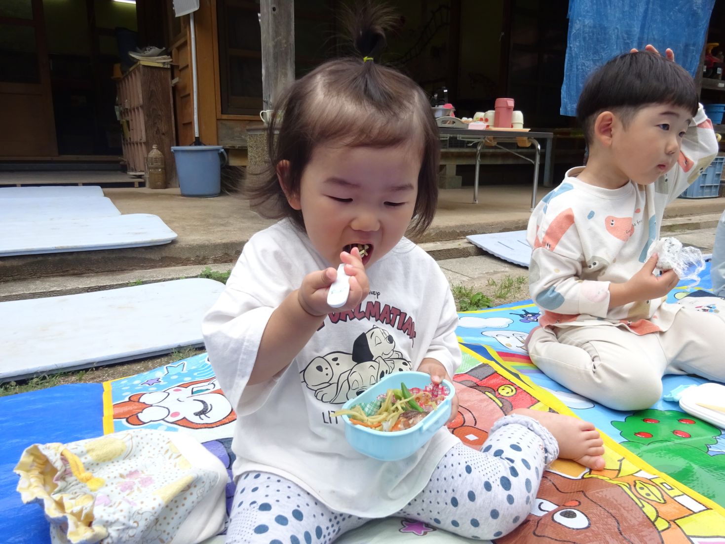 手品ショーが終わると給食弁当の時間です。空のお弁当箱に今日の給食メニューを詰めて所庭へ出ます。心地よい天候の中、笑顔いっぱいで同じ弁当を見せ合いながら楽しくいただきました。