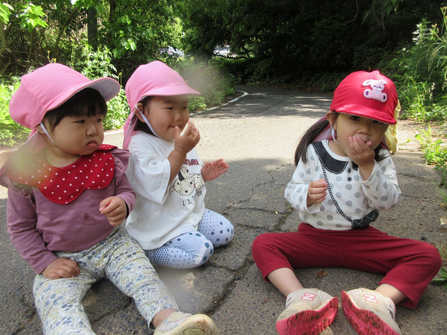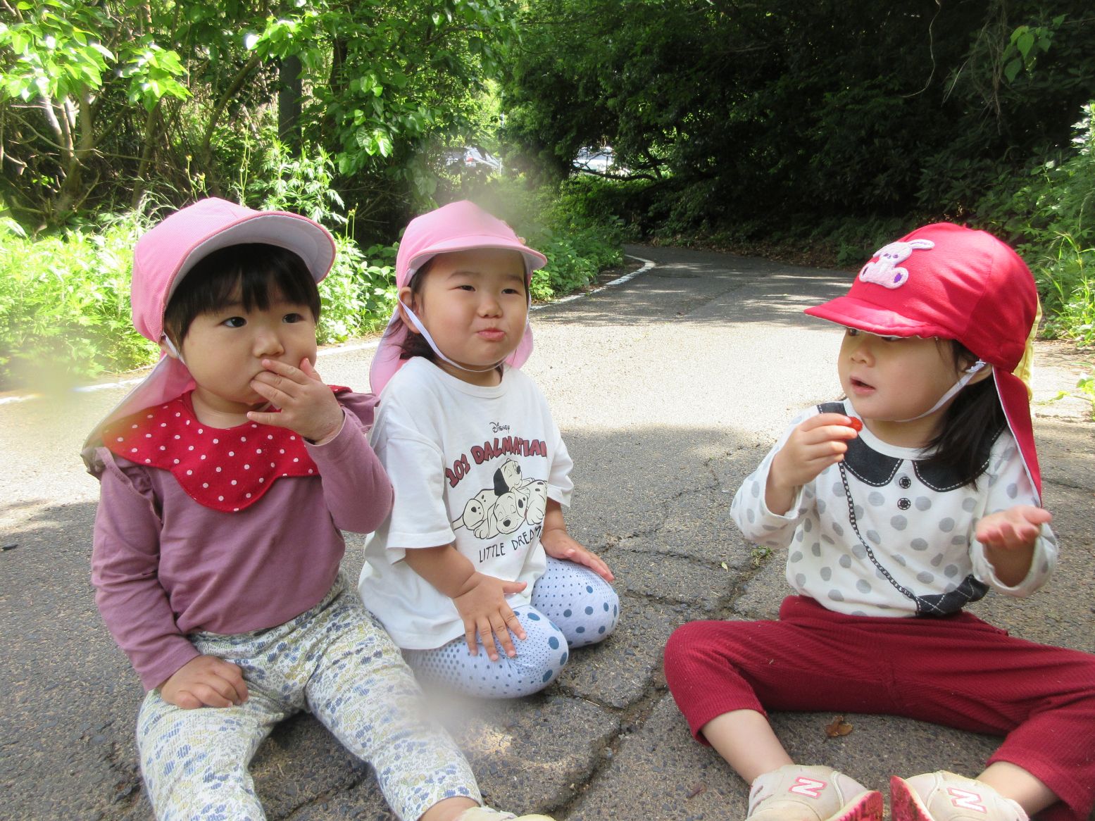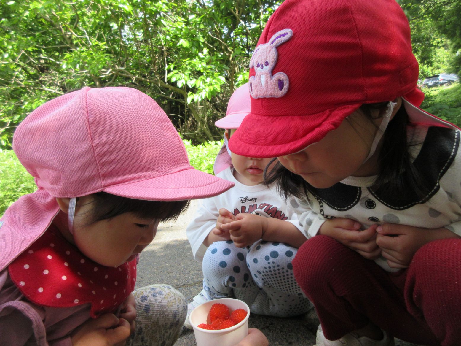 4月のお散歩時に野いちごの花を見つけたので、そろそろ赤くなっているかな?と探しに行ってみました。「あっ、あったー」「おっきー」と思ってよく見ると、それは“ヘビイチゴ”でした。残念!! それでも少し歩くと、求めていた“野いちご”を発見!! 流水で洗って食べると、とても甘くて美味しかったです。「草刈りをされていなくて、良かったね」と話しました。