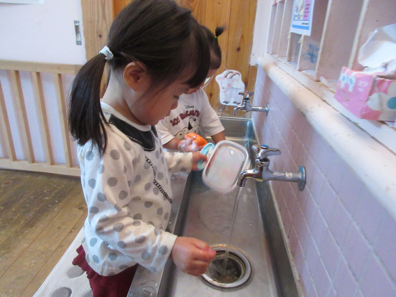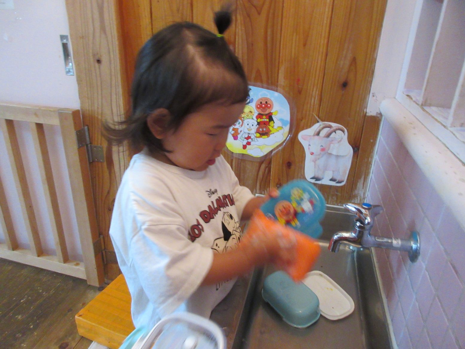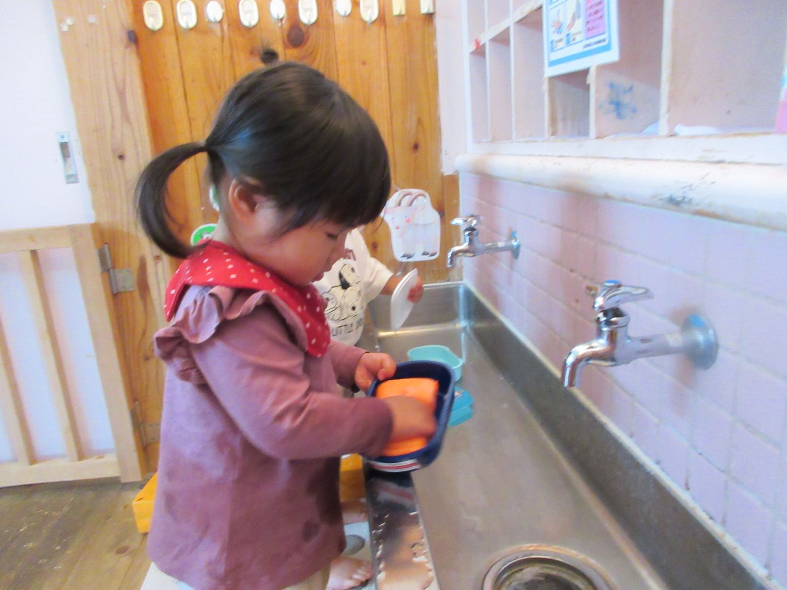 今日は、お楽しみ会で“お弁当給食”でした。食べ終わった後は、お弁当箱を自分で洗うことにも挑戦しました。