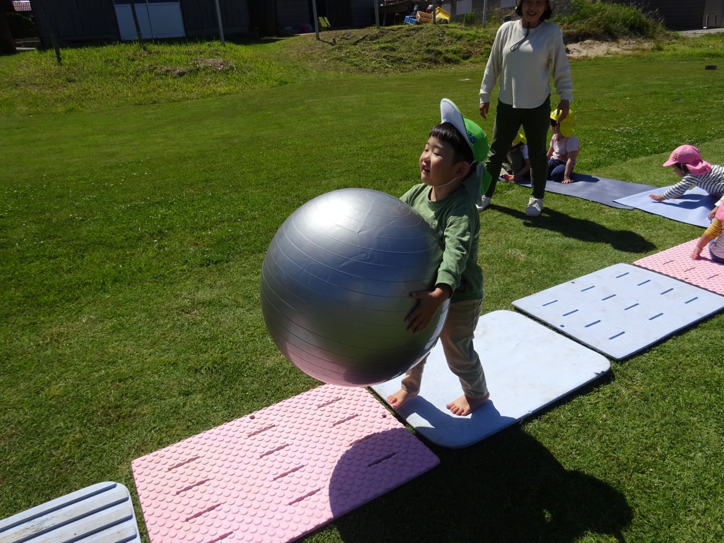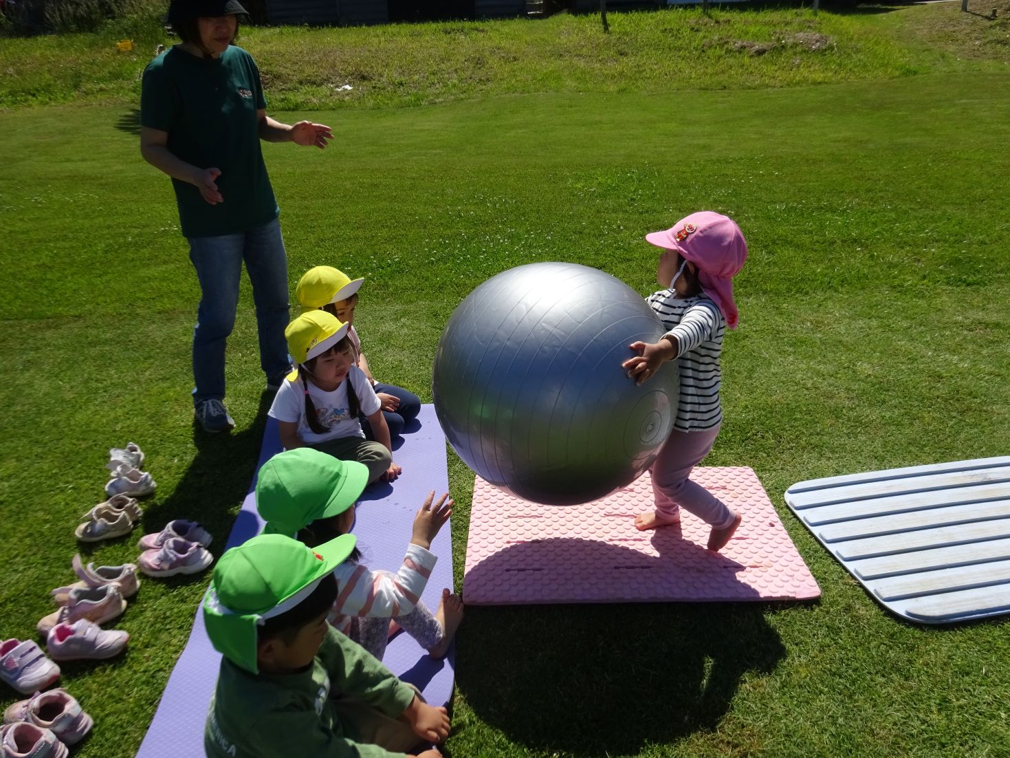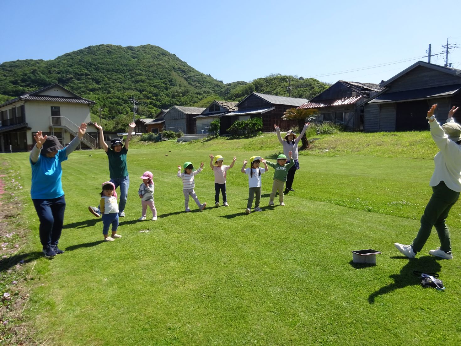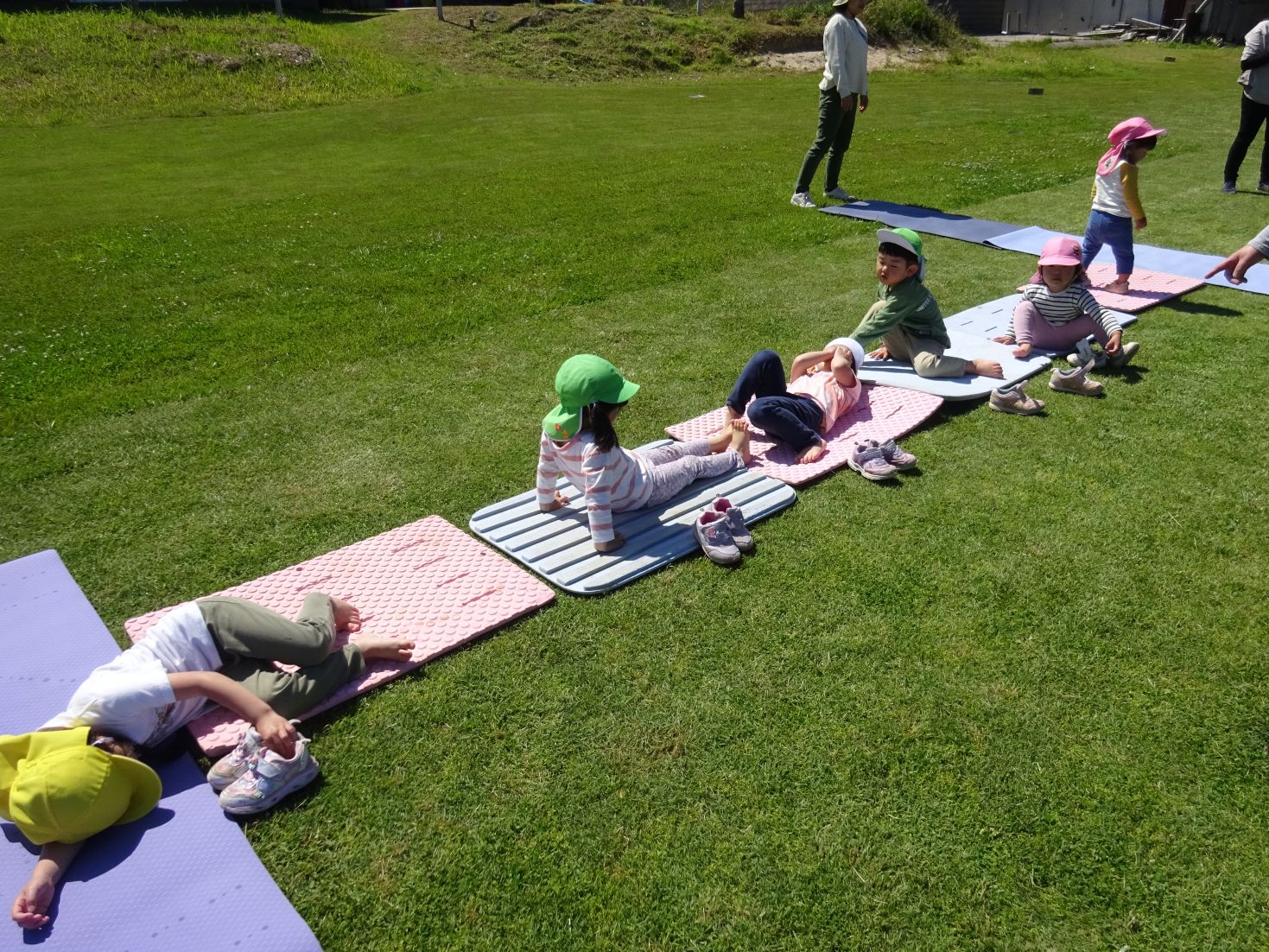 5月の“わくわくチャレンジ集会”のテーマは【全身】。今月最後の集会を小波海水浴の芝生の上で行った後、芝生の上や水辺での遊びを楽しみました。