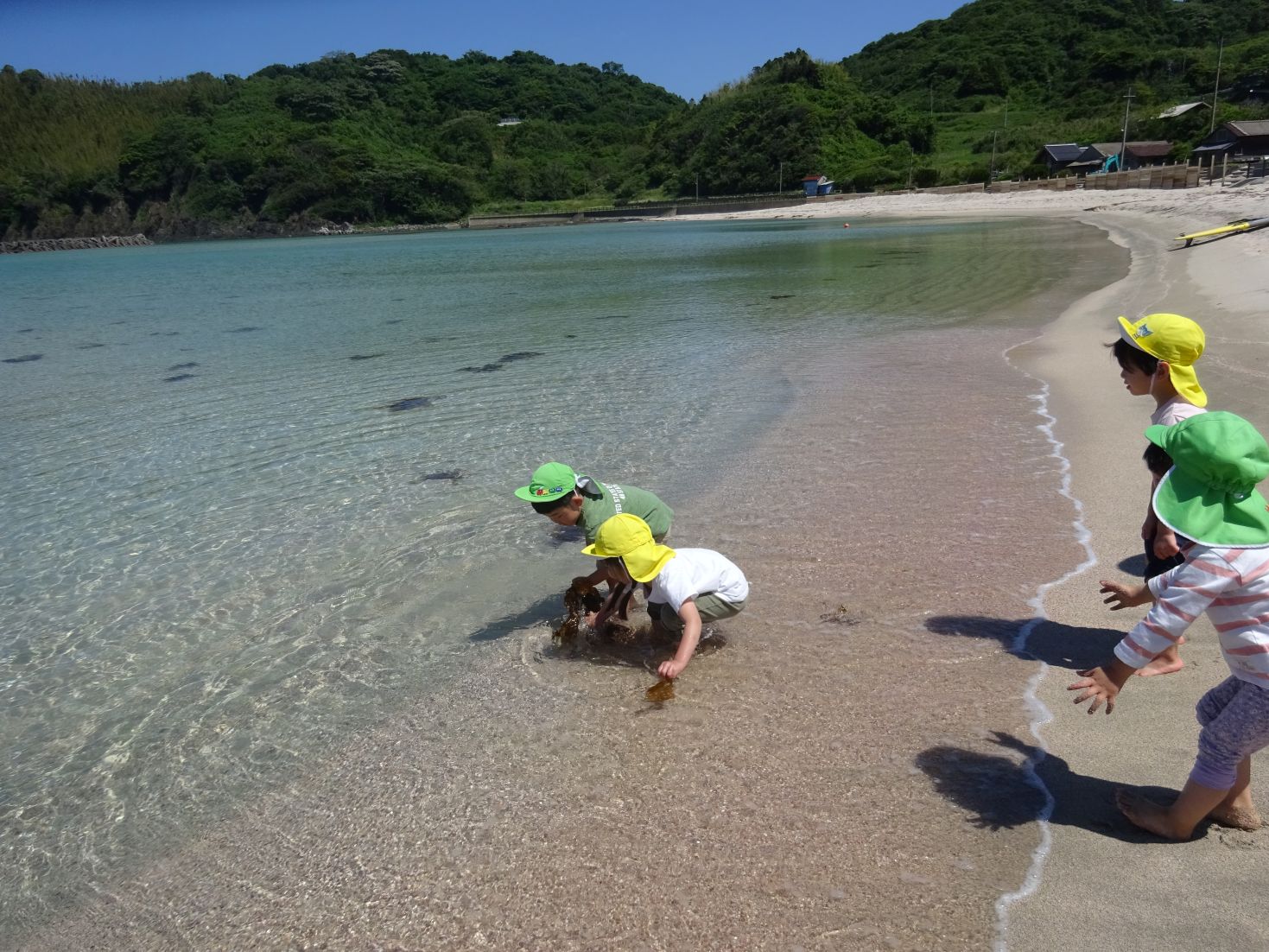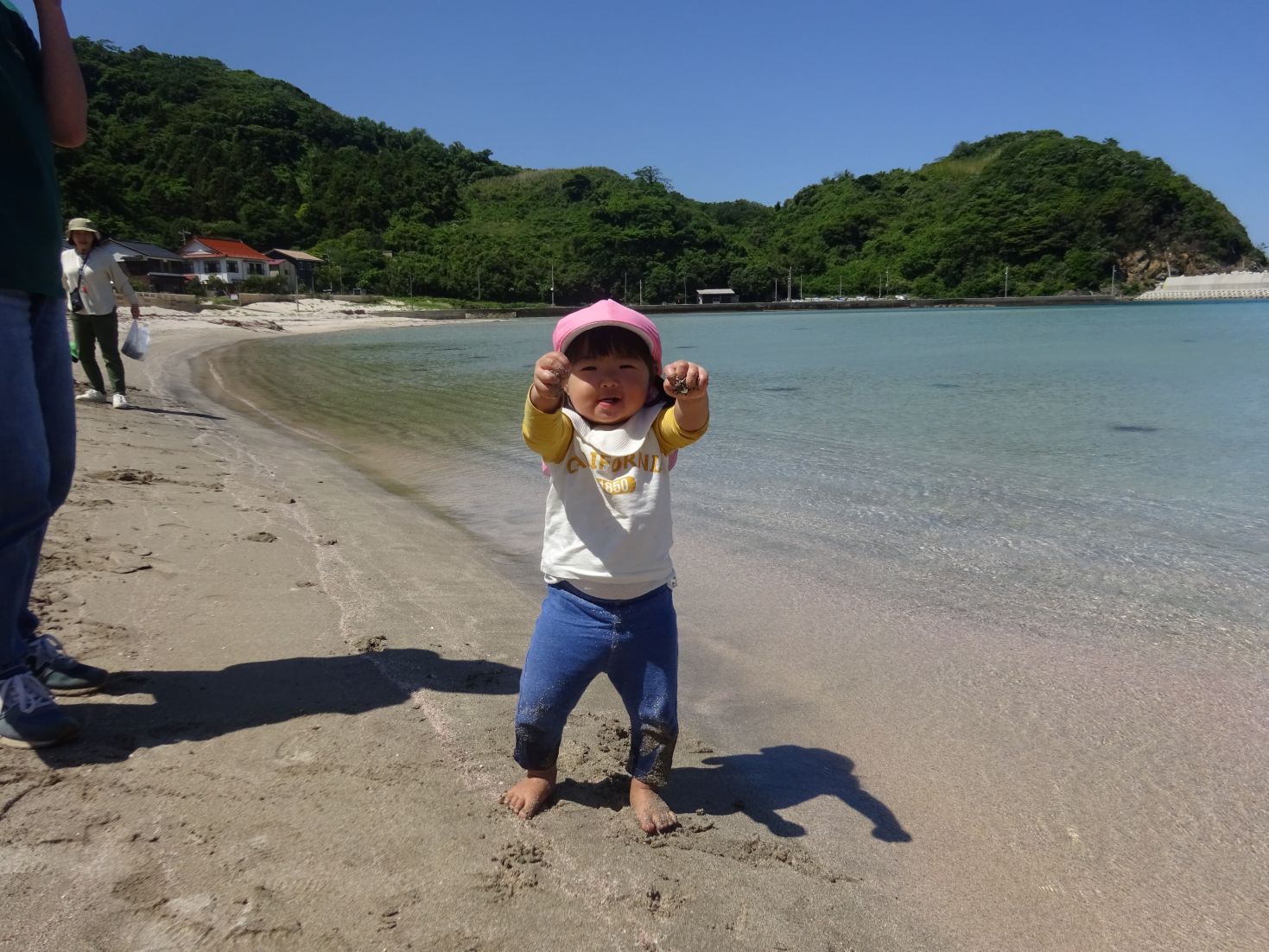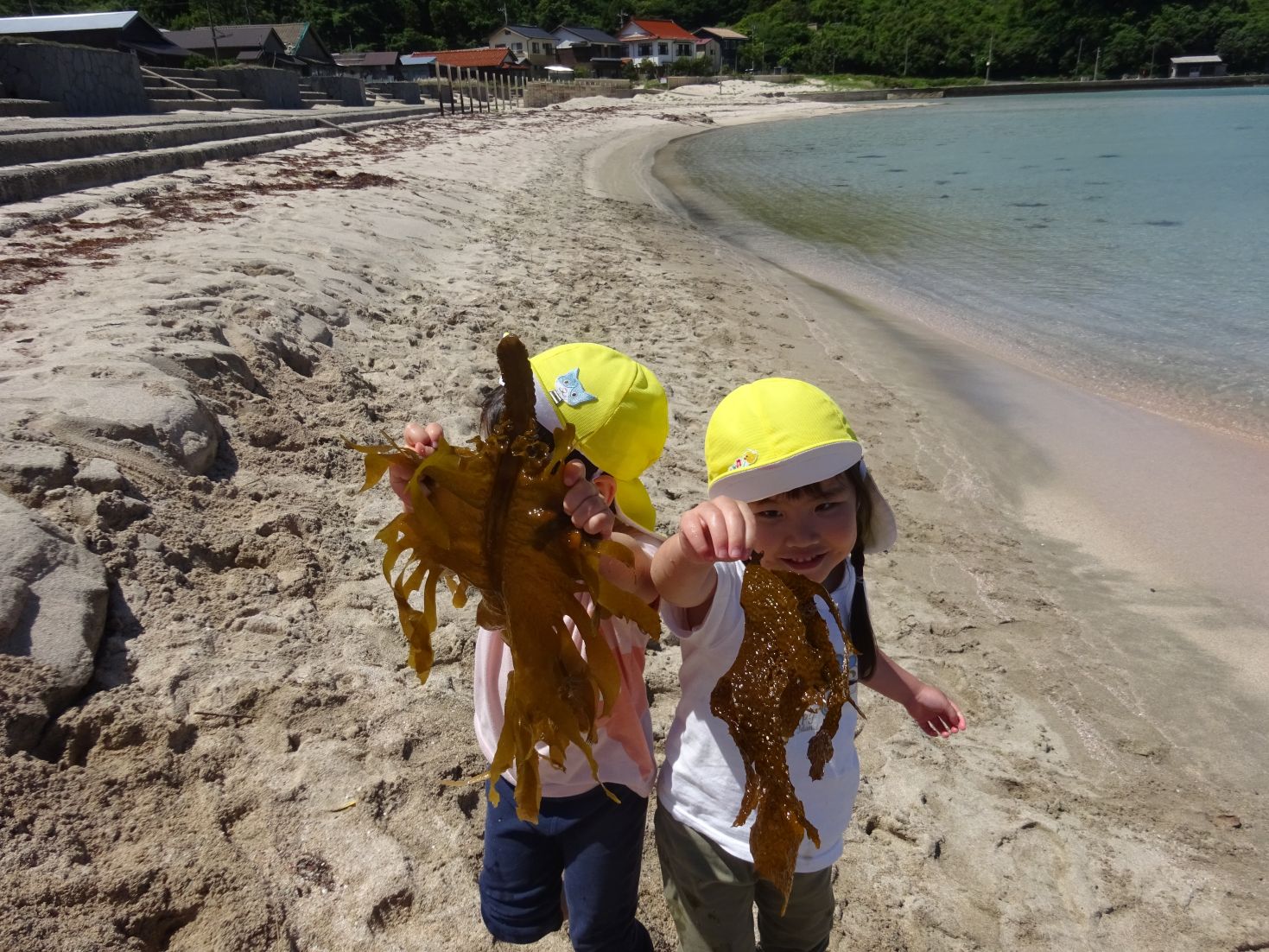 雲ひとつ無い青空と透き通る海の色とのコントラストがとてもきれい。このような素敵な環境で遊ぶことが出来、幸せなひとときでした。こども達は波の動きに合わせて、近付いたり離れたり、そのうちに〈わかめ〉を発見!「もってかえる~」と喜んですくっていました。今夜の晩御飯かな?