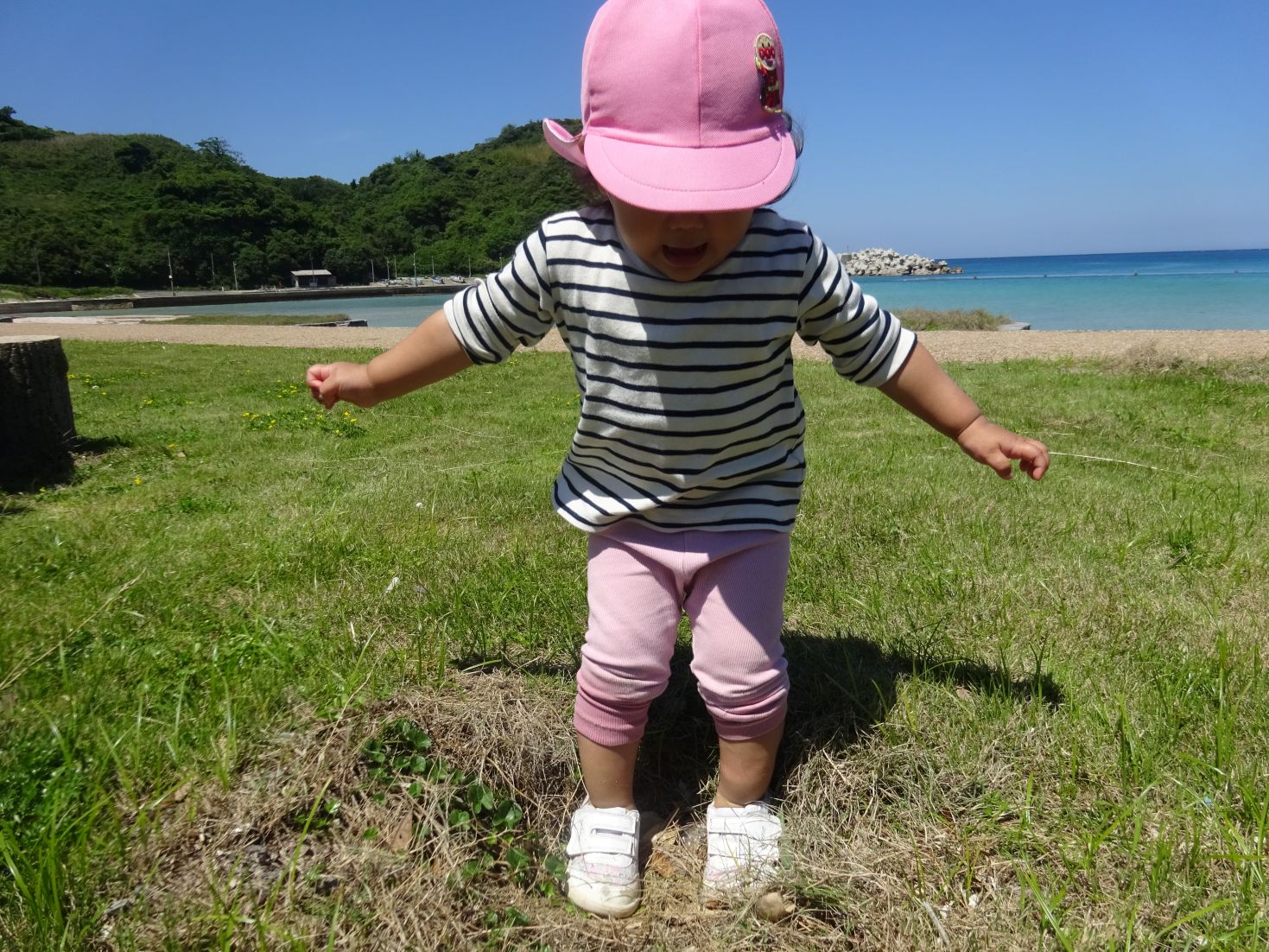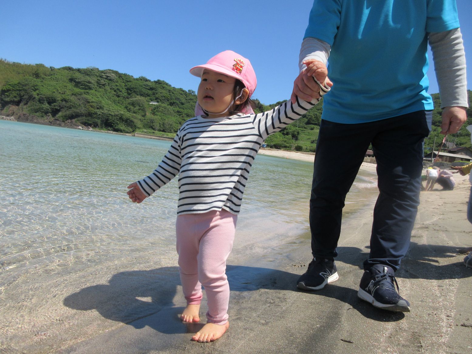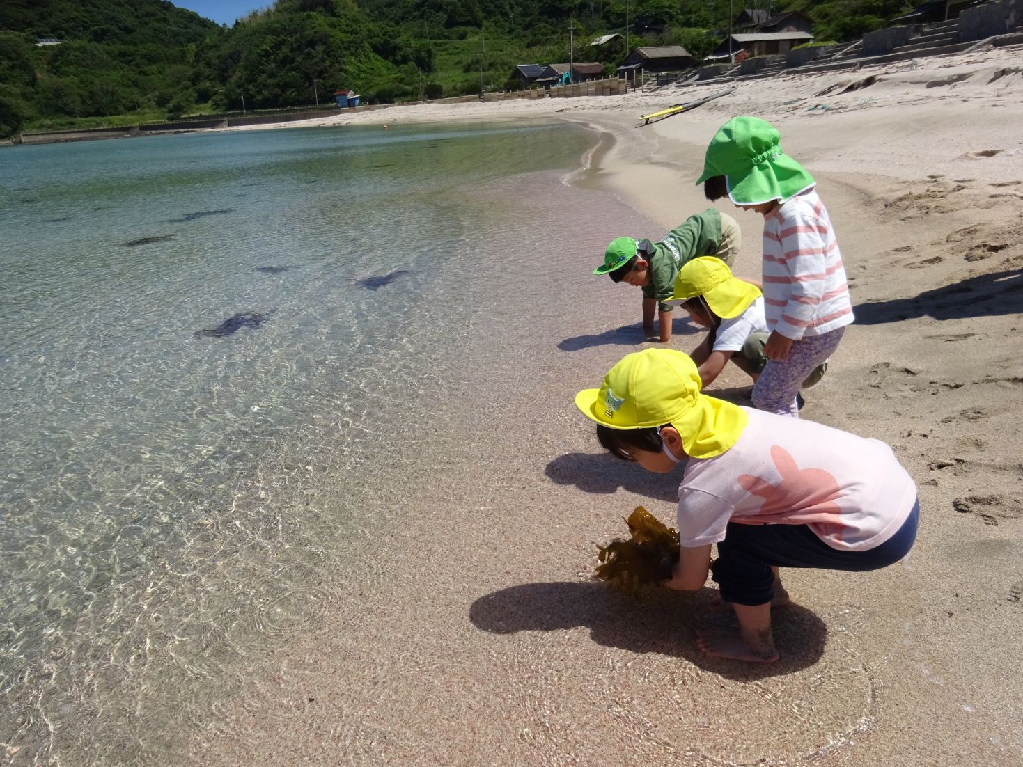 雲ひとつ無い青空と透き通る海の色とのコントラストがとてもきれい。このような素敵な環境で遊ぶことが出来、幸せなひとときでした。こども達は波の動きに合わせて、近付いたり離れたり、そのうちに〈わかめ〉を発見!「もってかえる~」と喜んですくっていました。今夜の晩御飯かな?