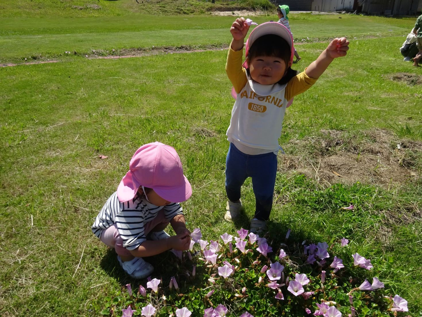 ハマヒルガオが沢山咲いていて「はっぱ」と喜んで摘んでいました