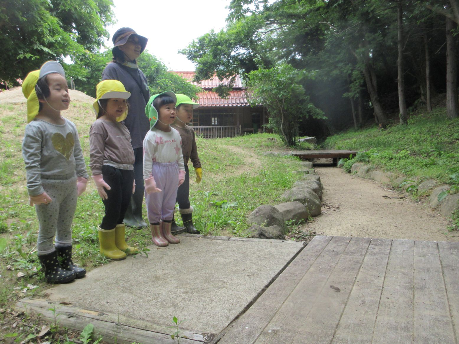 「わくわくのもりで あそばせてください」森の神様に挨拶をしています