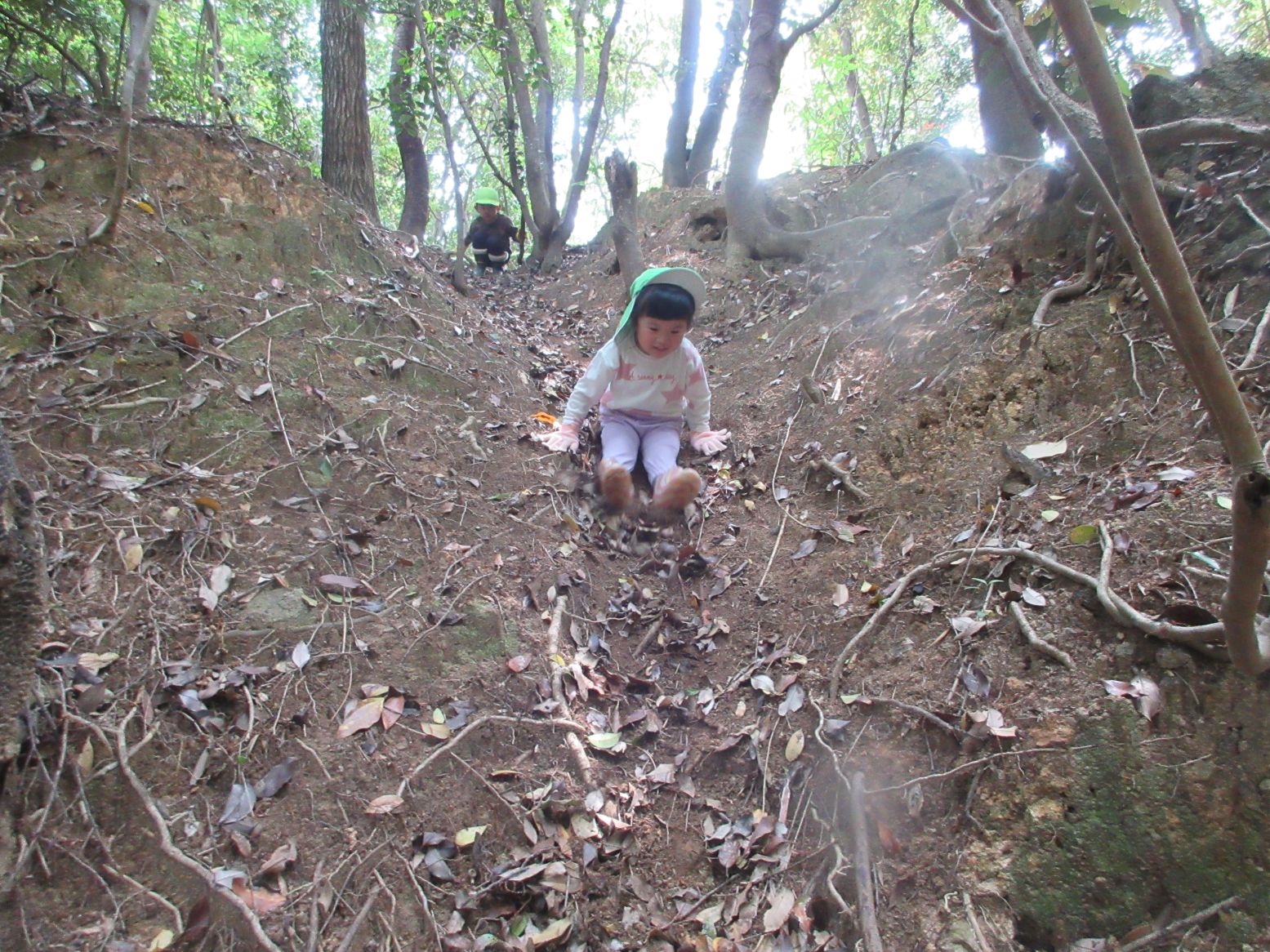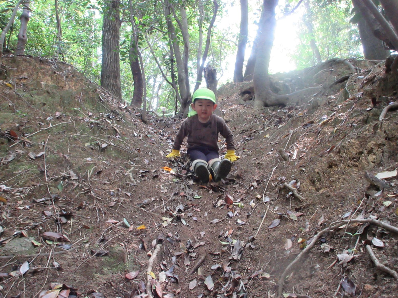 森の中にできた自然の滑り台を滑ります