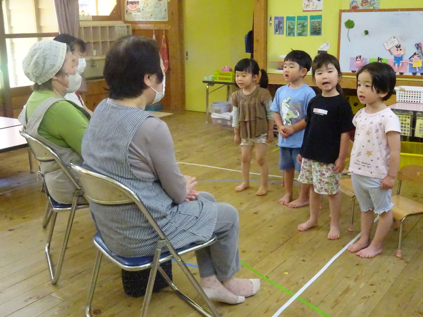 こども達は「ざらざらしてる」「ねんどみたい」「きもちい!」と生地をこねながら、感じたことを話していました。地域講師の方は、生地を滑らかにしてくださったり、あんこの包み方を実演を交えて教えてくださったりしました。かたらの葉で包んだ後は「美味しくなってね♪」と蒸し器へ入れて、しばしの待ち時間…。この時間は、今歌っている季節の歌を聞いていただきました。一緒に口ずさんで下さり、こども達はとても嬉しそうでした。
