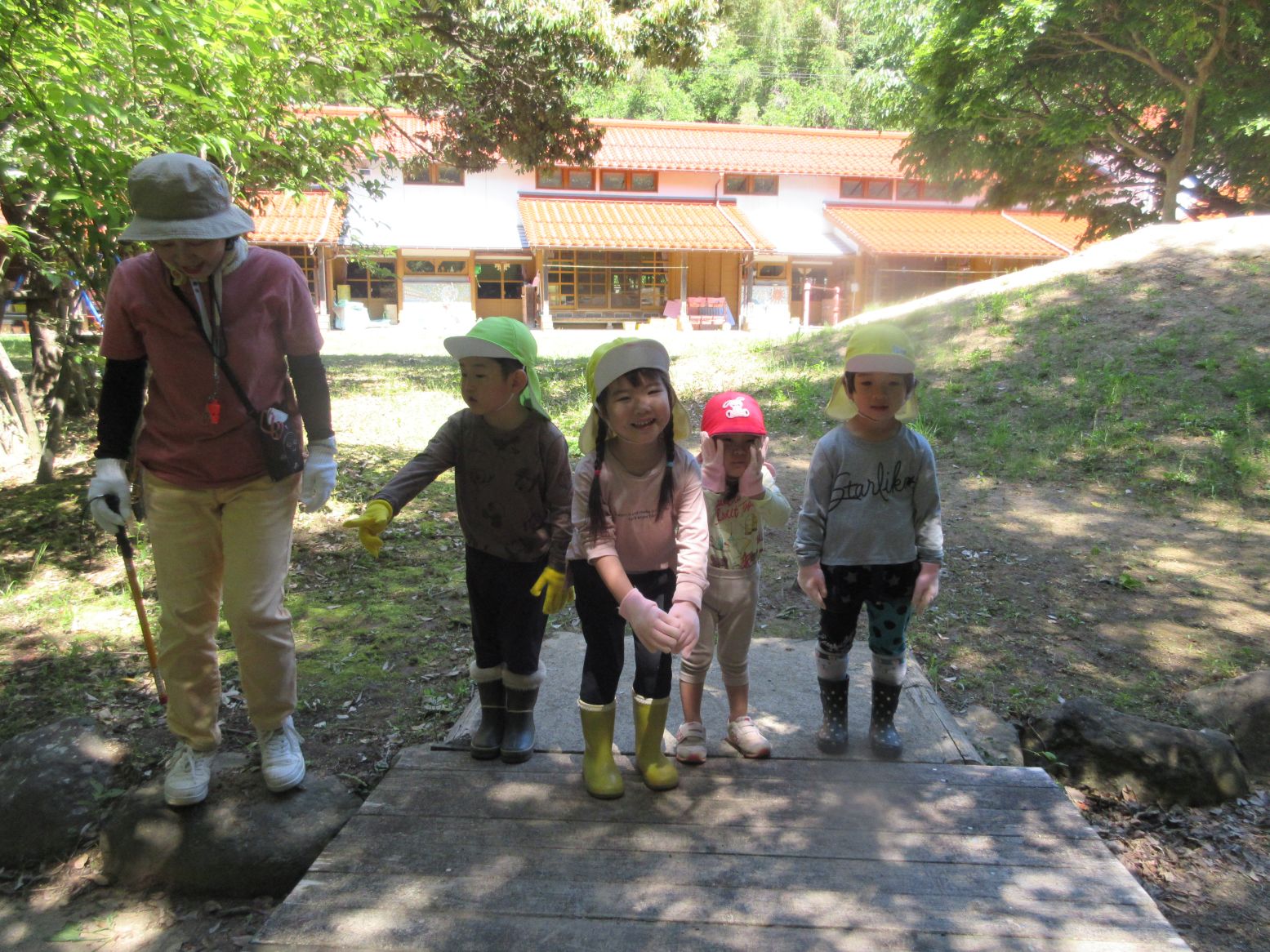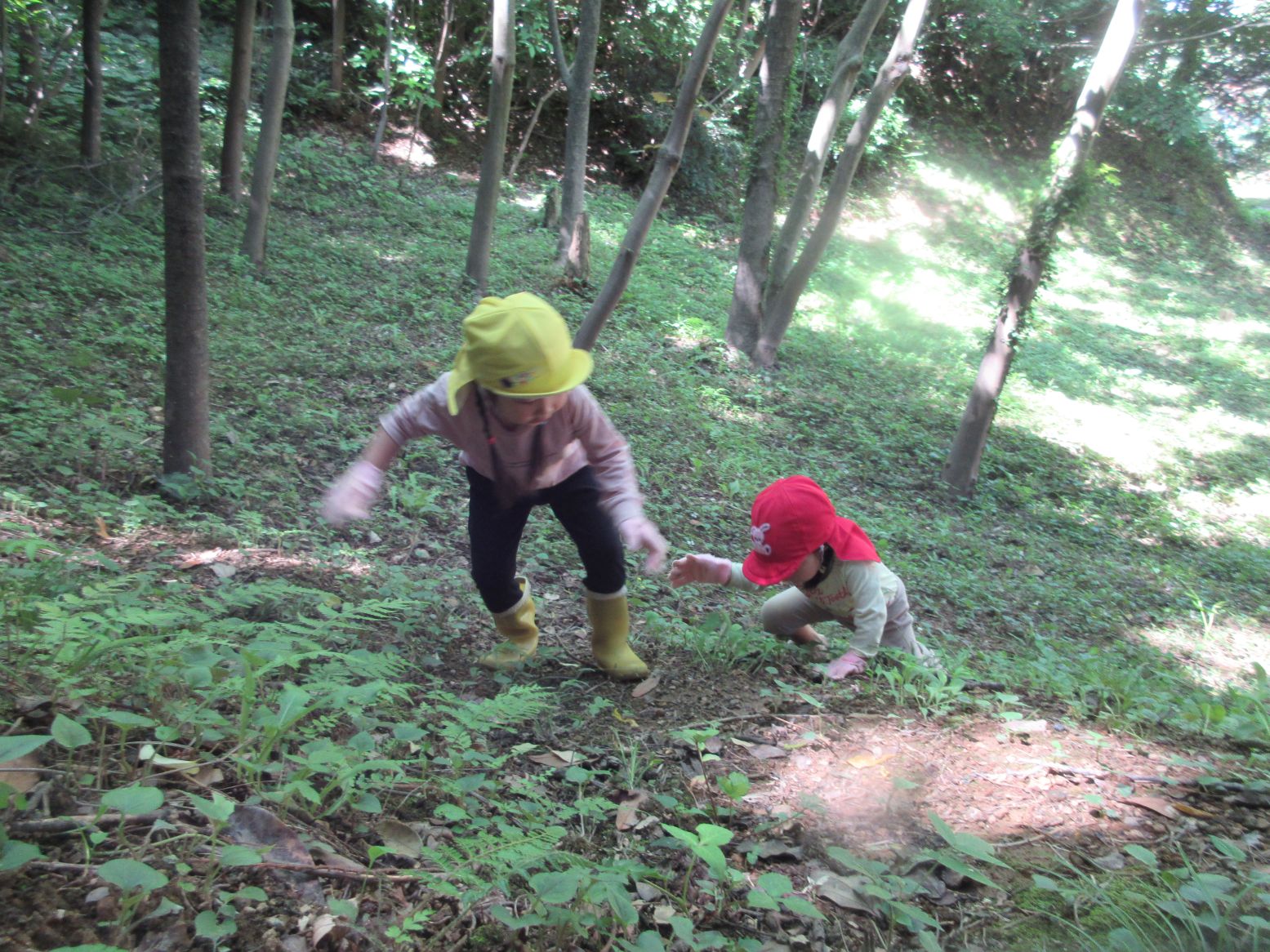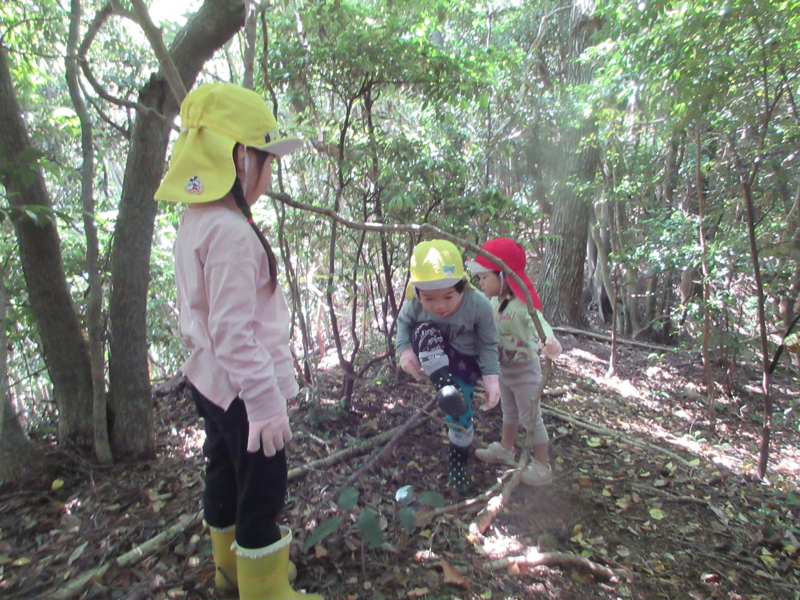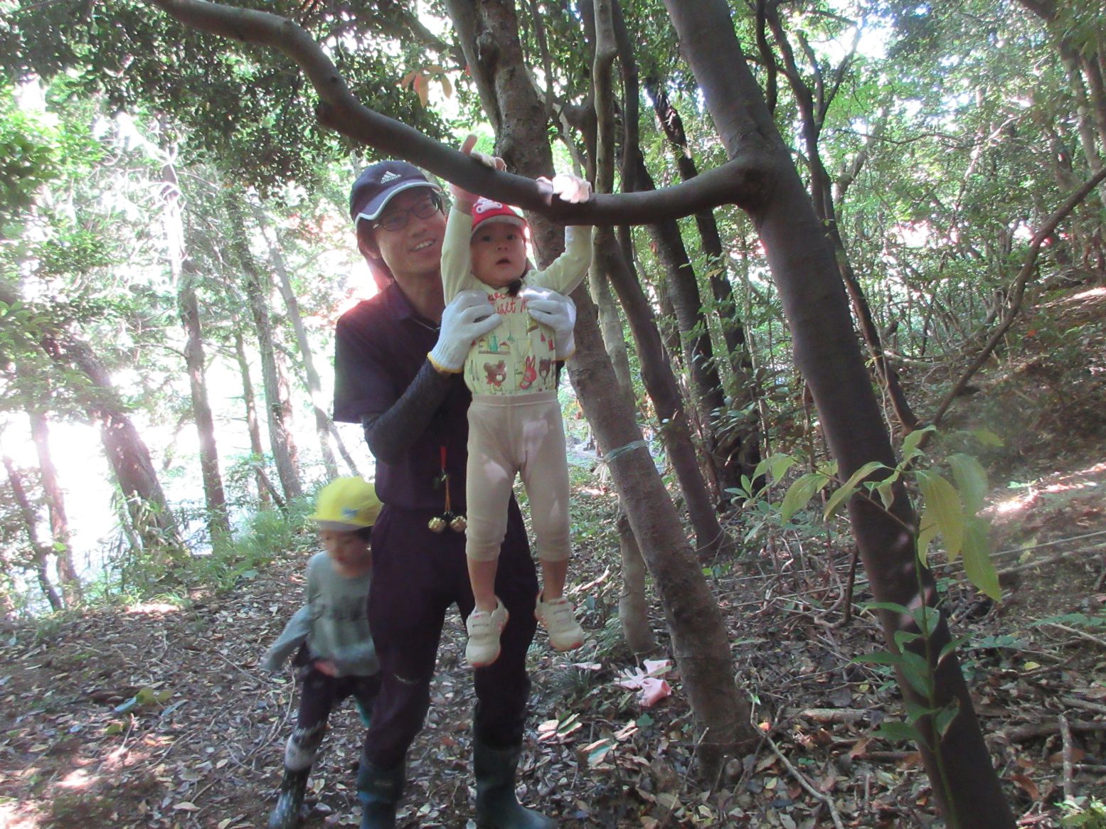 みんなで“わくわくの森”へ行きました。2歳児はにじ・そら組の遊ぶ姿に刺激を受け、挑戦したい気持ちがどんどん出てきました。にじ・そら組のこども達は、今年度初めて森へ入る2歳児に手を差し伸べる優しい姿を見せてくれました。