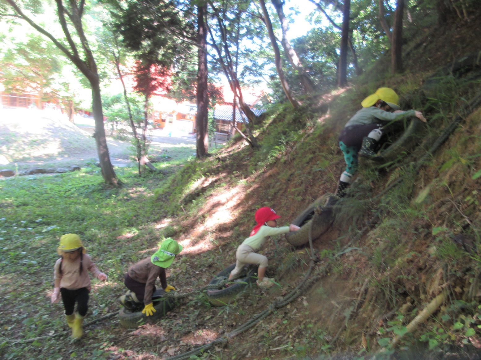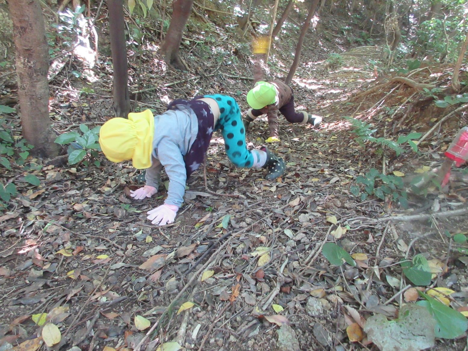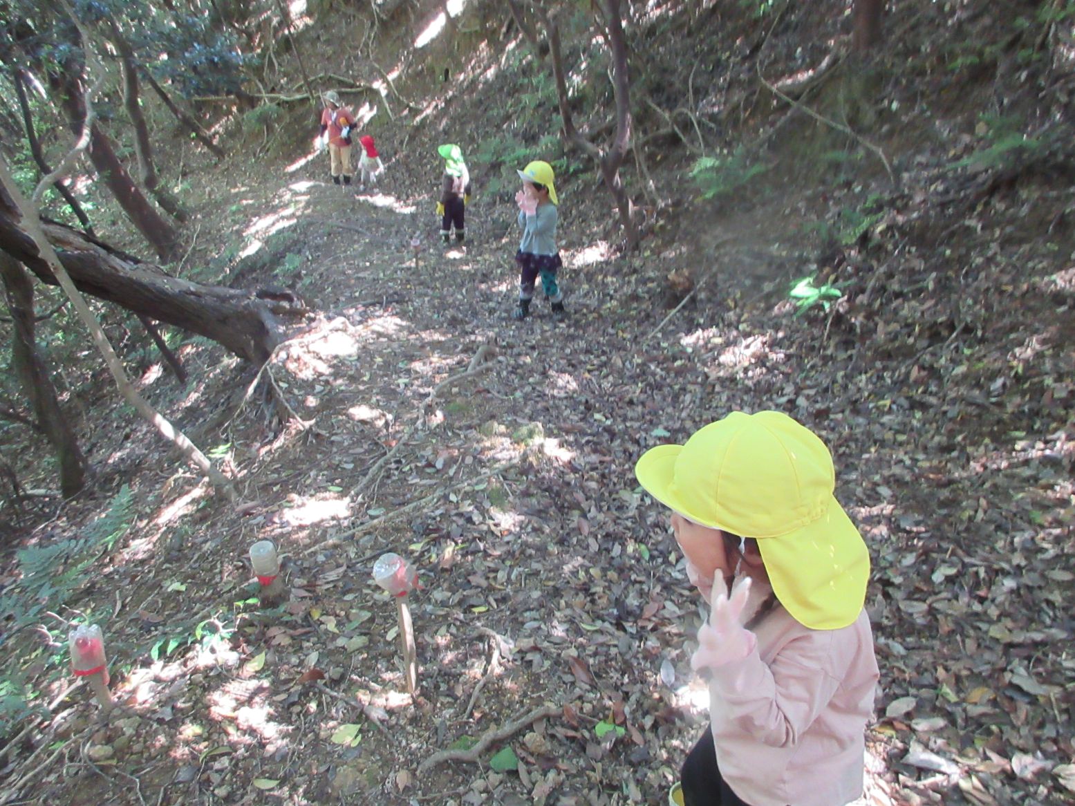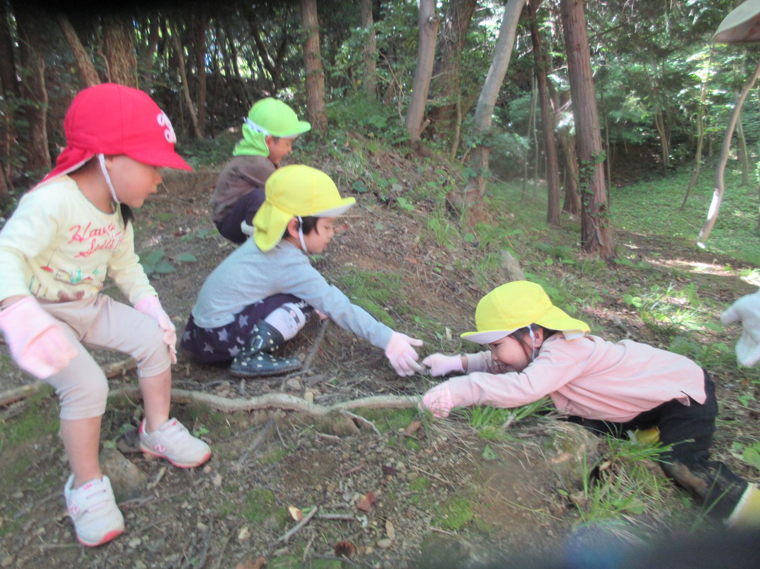 みんなで“わくわくの森”へ行きました。2歳児はにじ・そら組の遊ぶ姿に刺激を受け、挑戦したい気持ちがどんどん出てきました。にじ・そら組のこども達は、今年度初めて森へ入る2歳児に手を差し伸べる優しい姿を見せてくれました。
