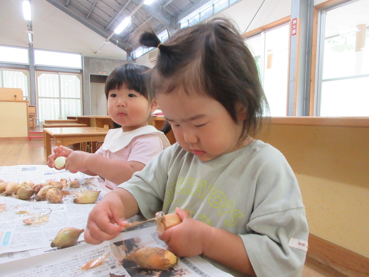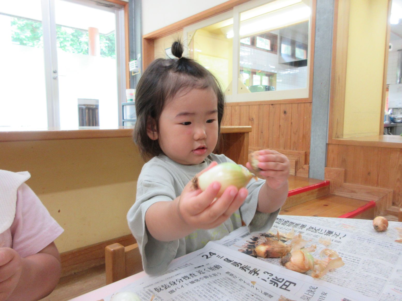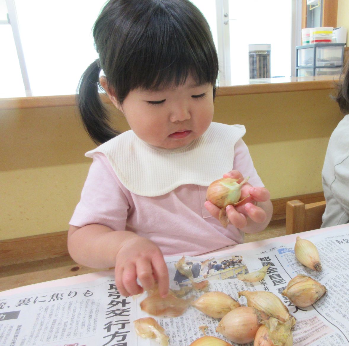 玉葱は1,2歳児が皮むきをするのに丁度良い大きさ!手にぴったり納まるため、力を入れてぎゅっと握ることで転がり落ちることなく 皮むきが出来ていました。楽しく皮むきをしながら、指先の力が育っていくようでした。