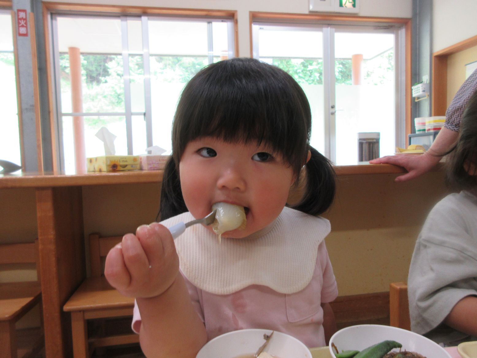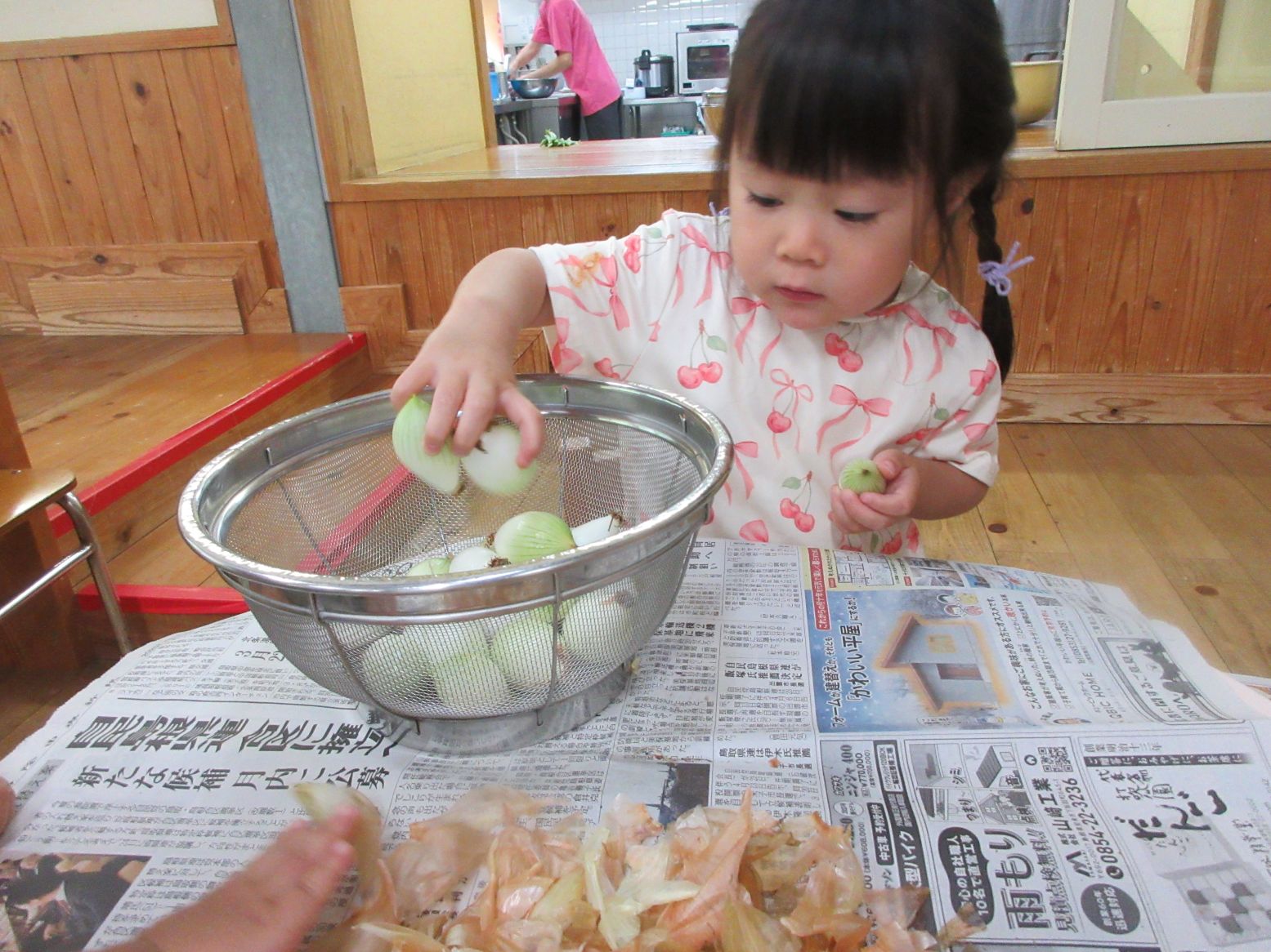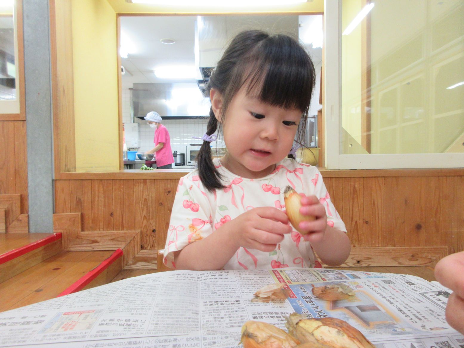 玉葱は1,2歳児が皮むきをするのに丁度良い大きさ!手にぴったり納まるため、力を入れてぎゅっと握ることで転がり落ちることなく 皮むきが出来ていました。楽しく皮むきをしながら、指先の力が育っていくようでした。