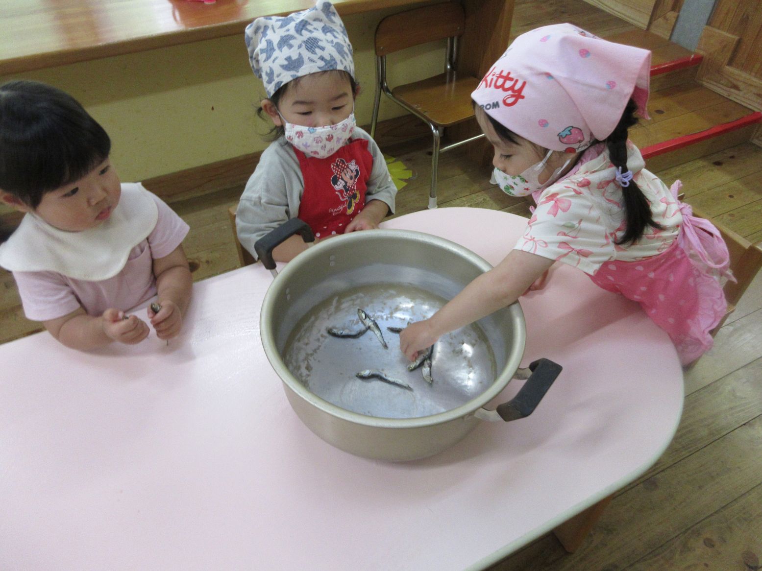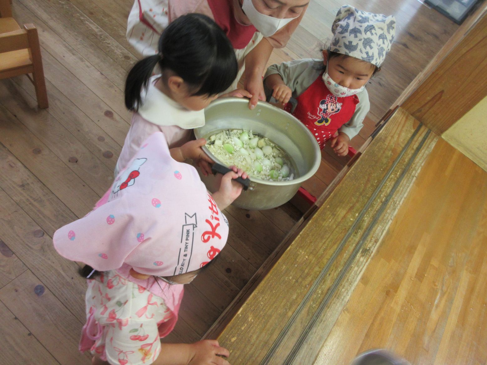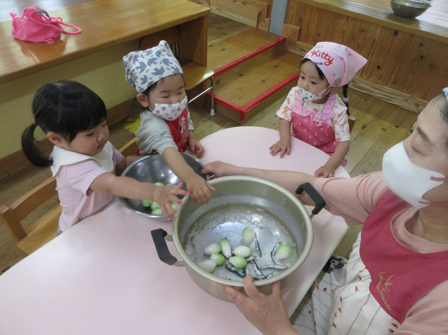 「これが美味しくしてくれるいりこだよ。出汁だよ」みんなで入れていきます