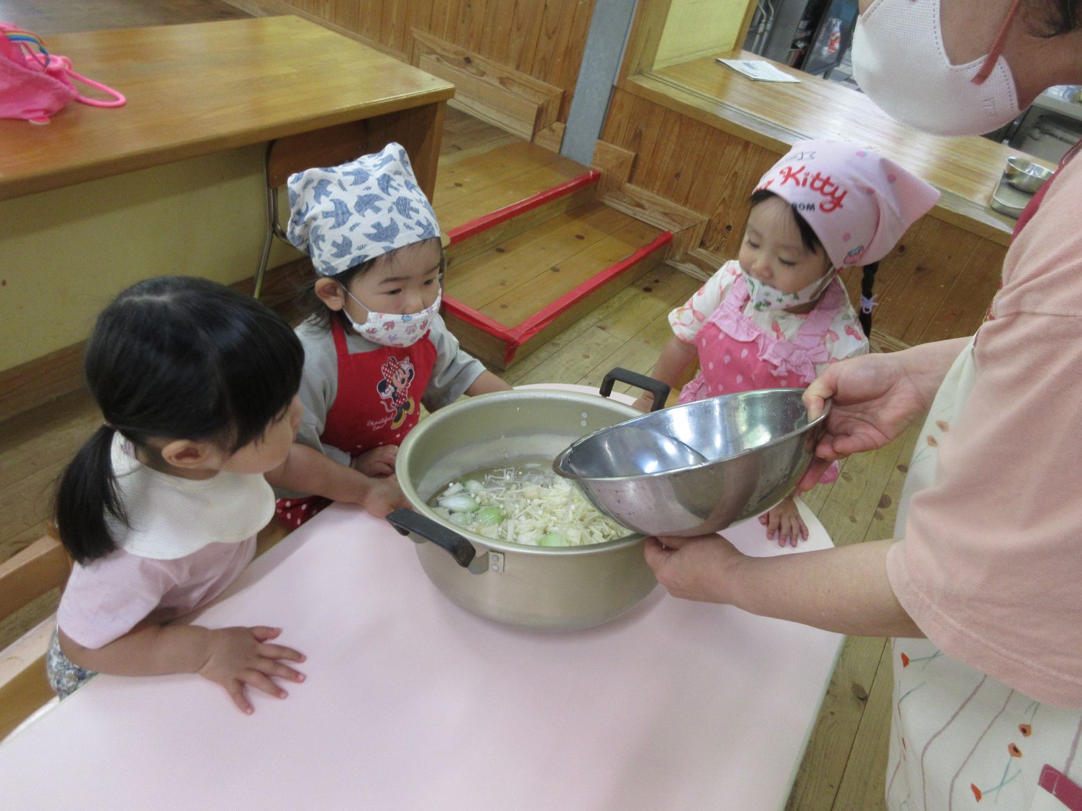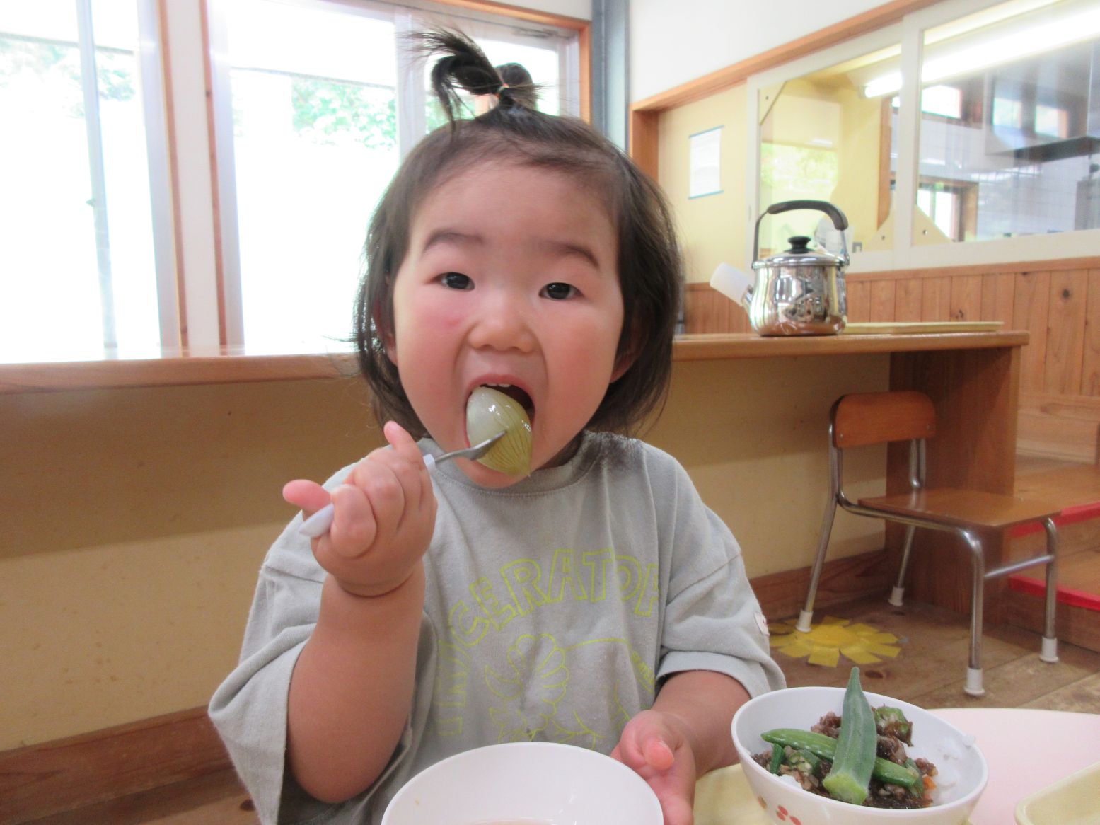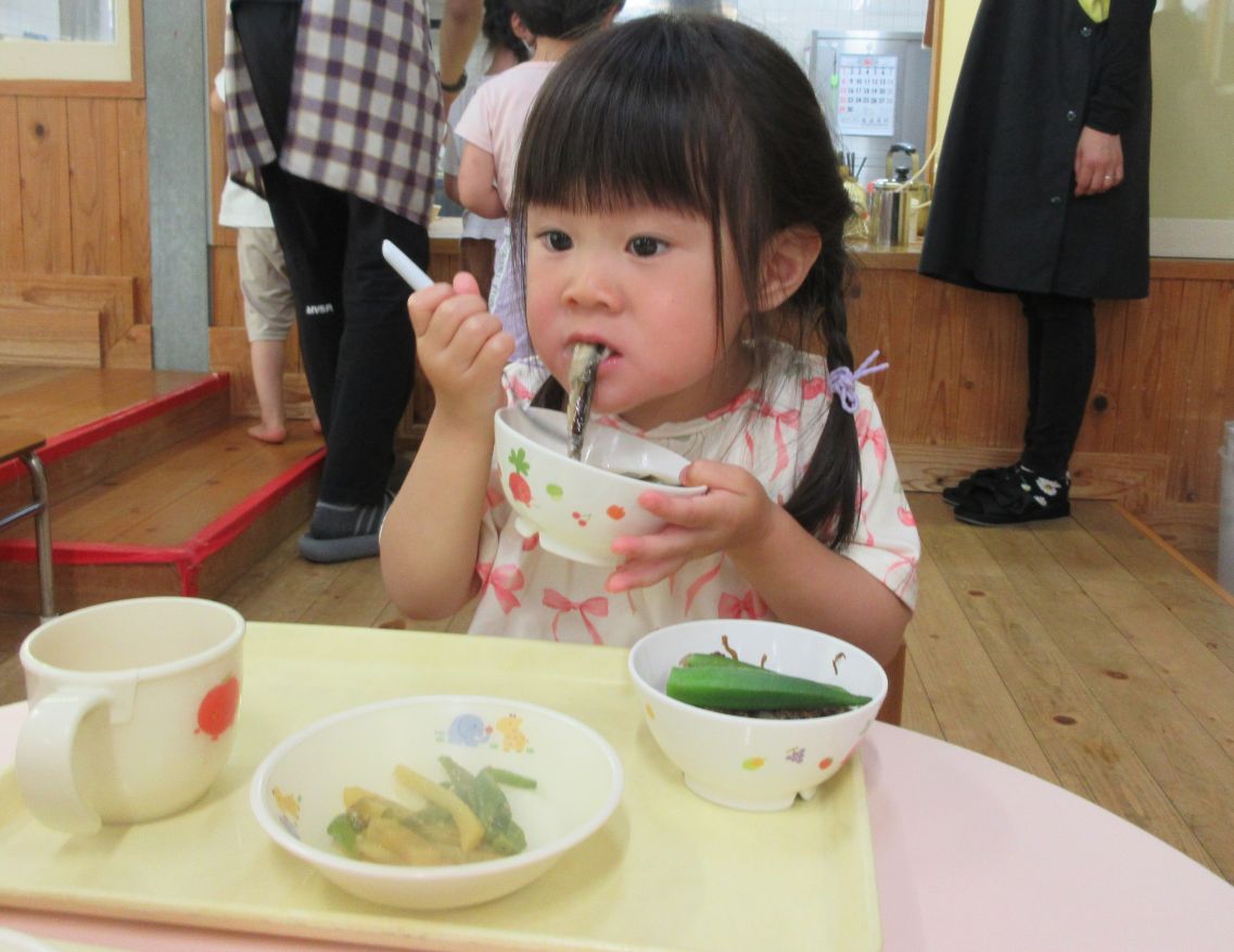 完成した味噌汁を食べ始めると、誰もが、自分で鍋に入れた出汁用のいりこを一番に頬張っていました( *´艸`)全員分の味噌汁を作ったので、みんなが「おいしいね~」「あまいね~」と笑顔で食べてくれました。