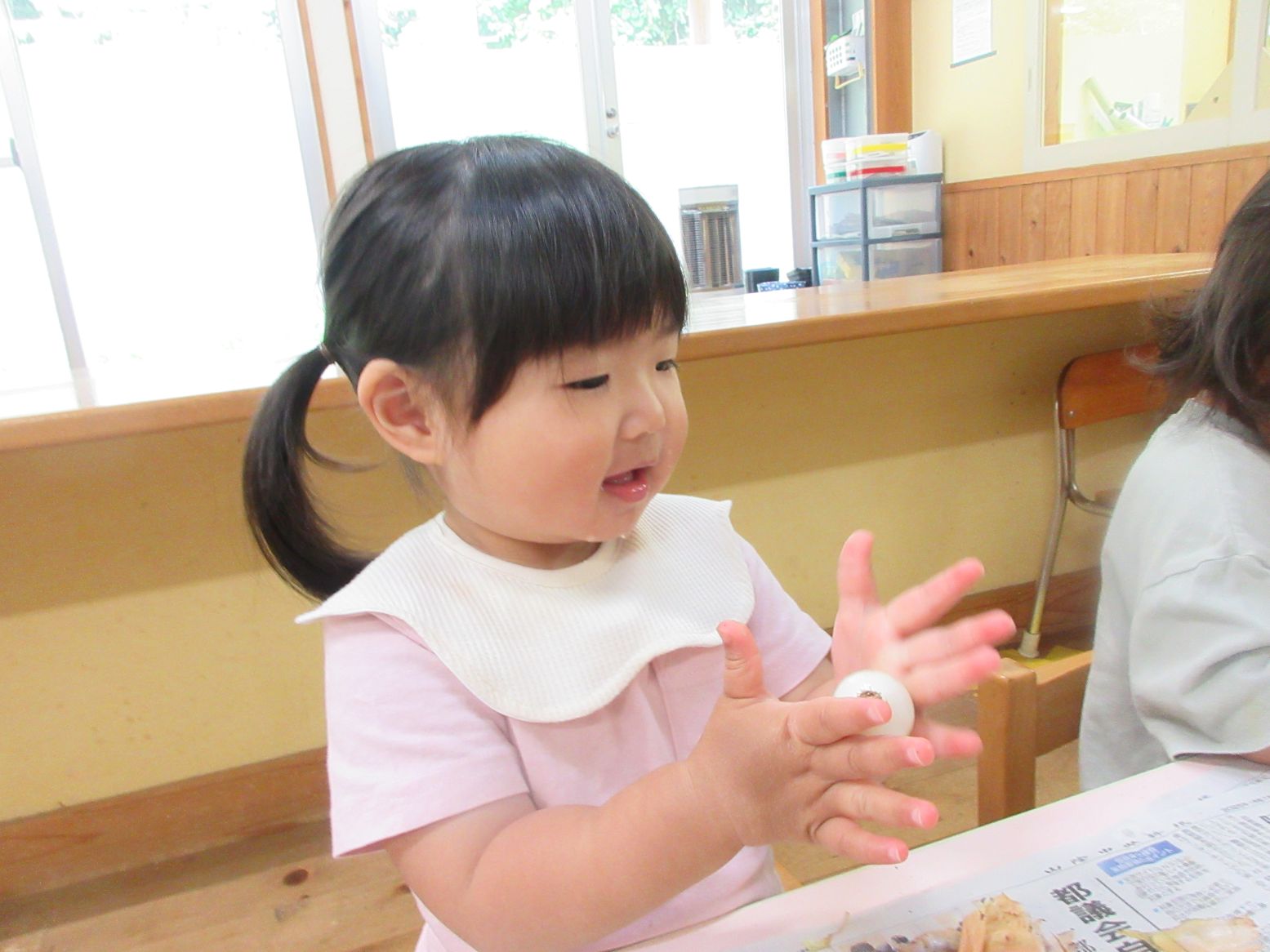皮をむくと、つるつるした感触を楽しみ、手の中で転がしていました。