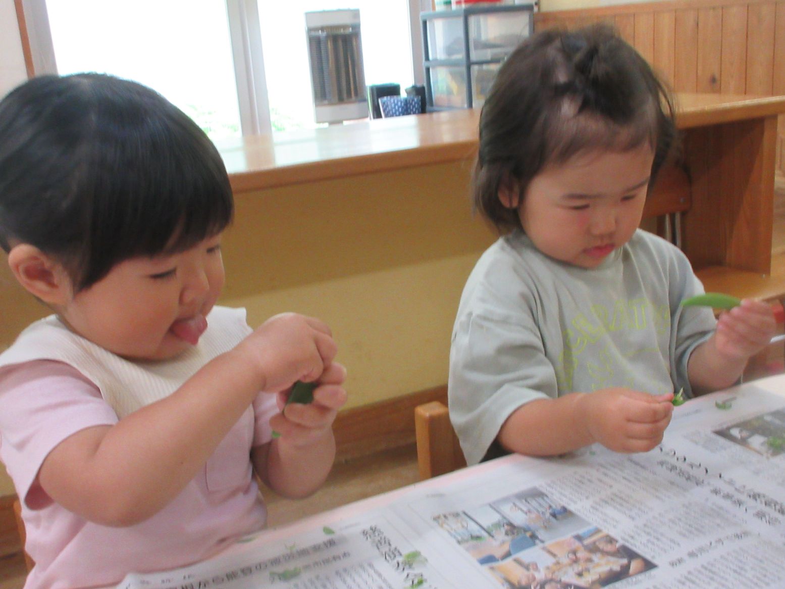 畑で収穫したスナップエンドウの筋を取るお手伝いもしたね