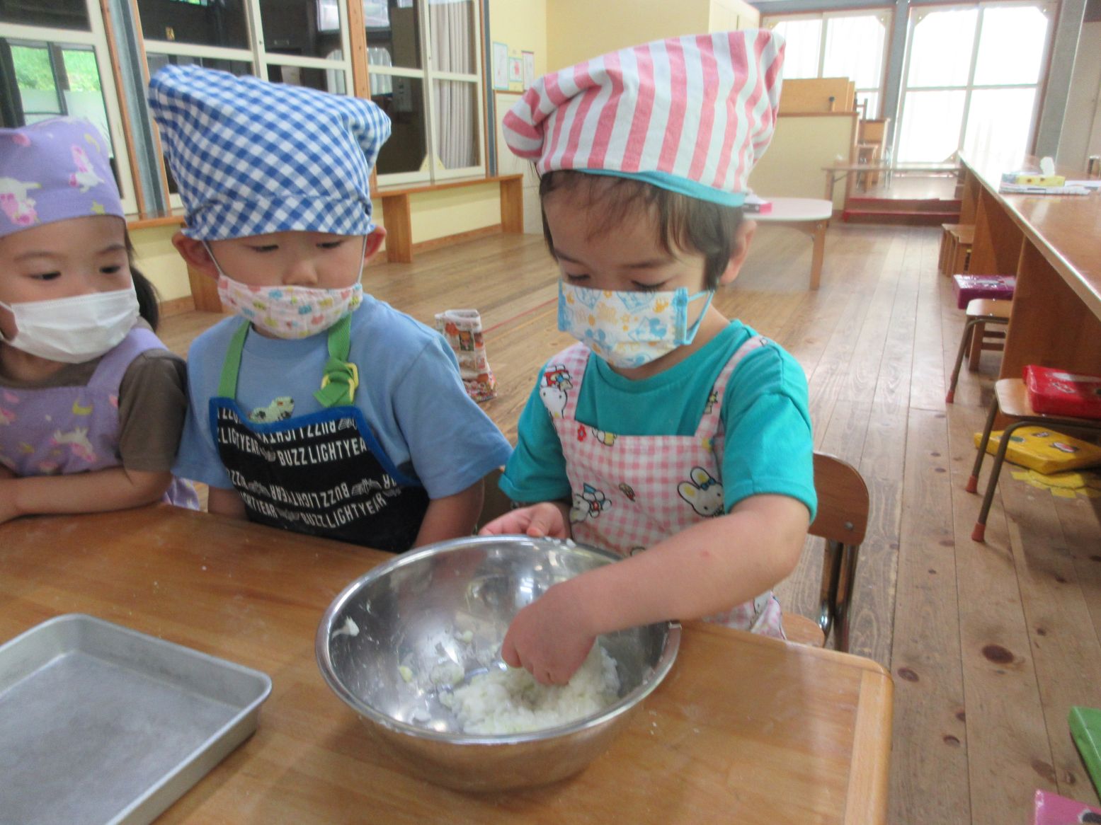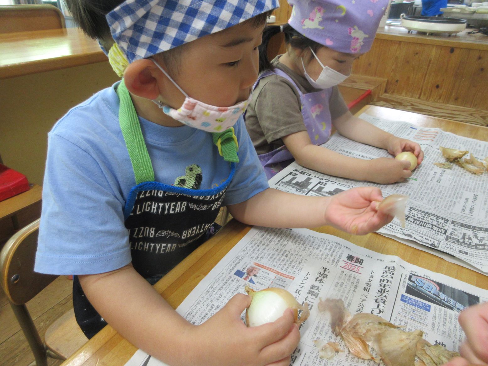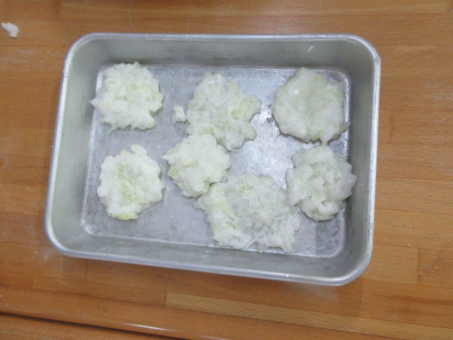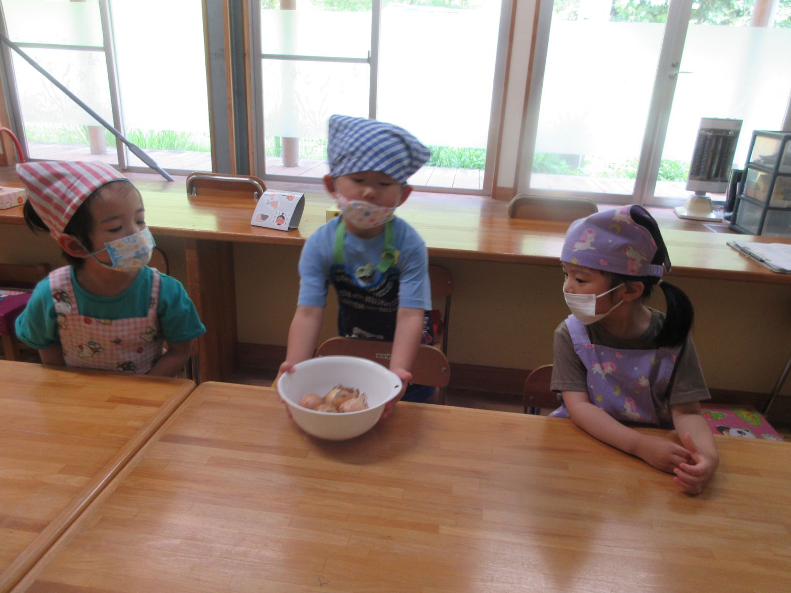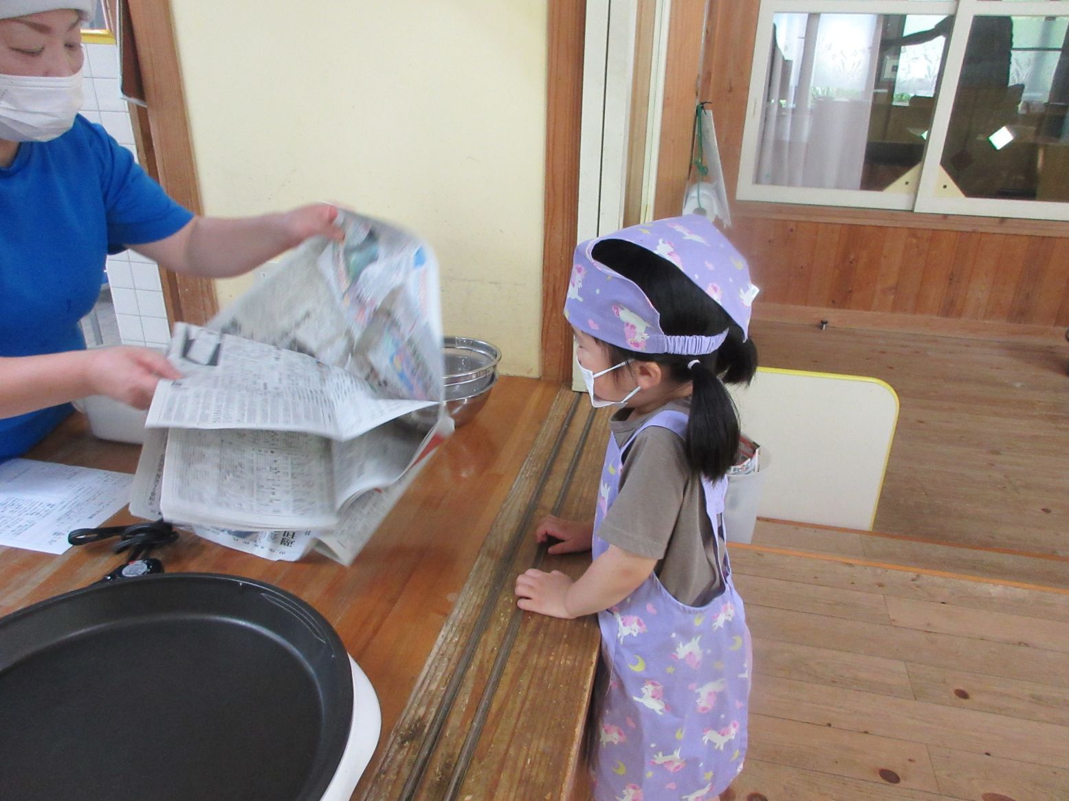 材料は玉ねぎ、片栗粉、塩のみ!!こども達は、出来上がった玉ねぎ焼きを食べて「ほっぺたが おちそう♪」「めっちゃ ふわふわ~」と言いながらぺろりと食べました。