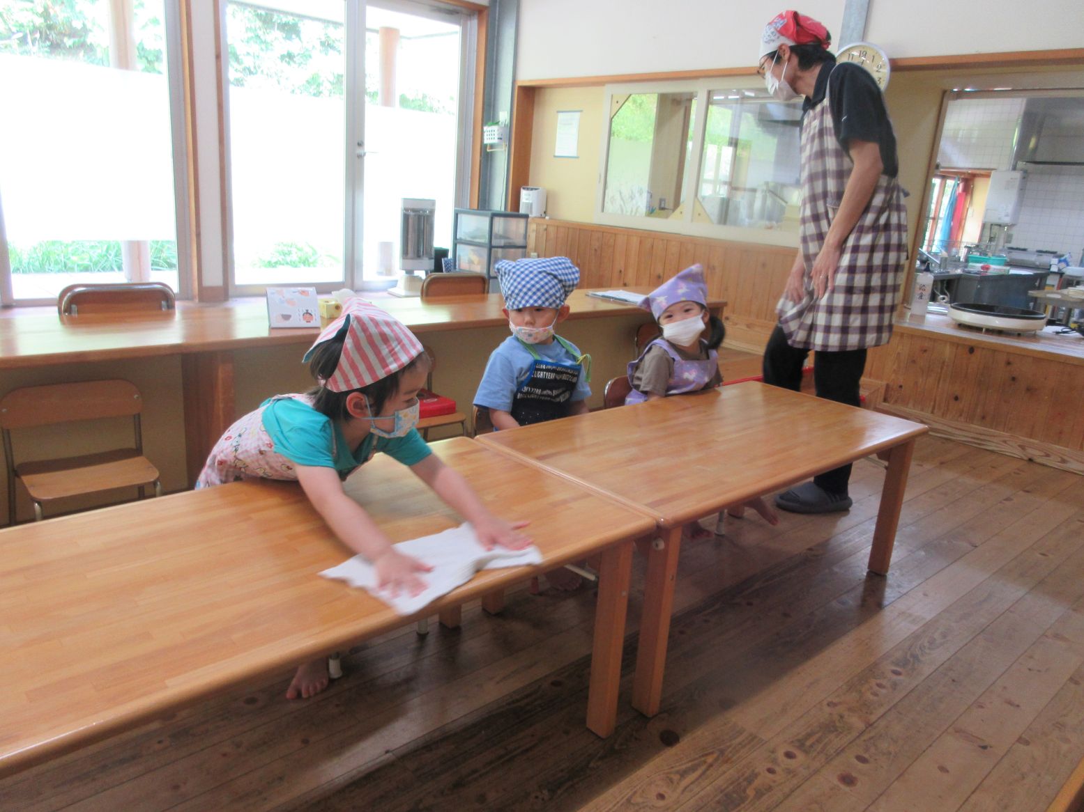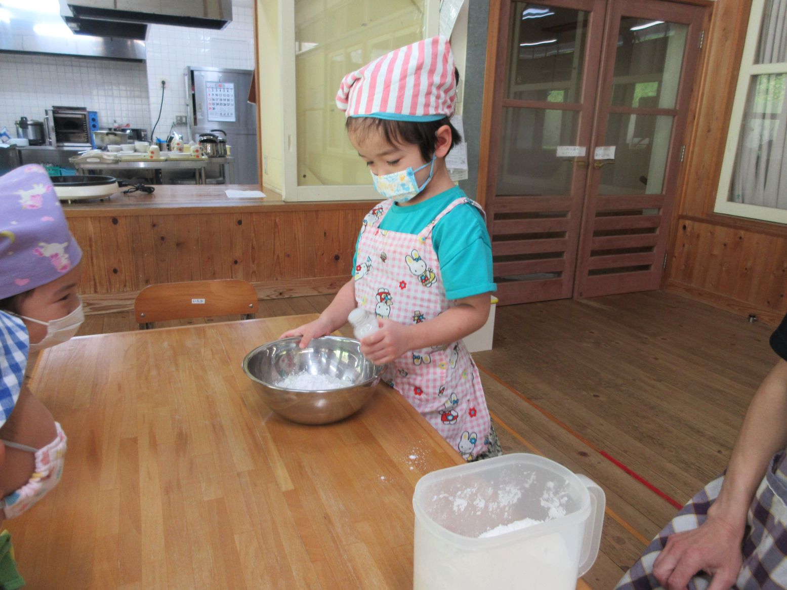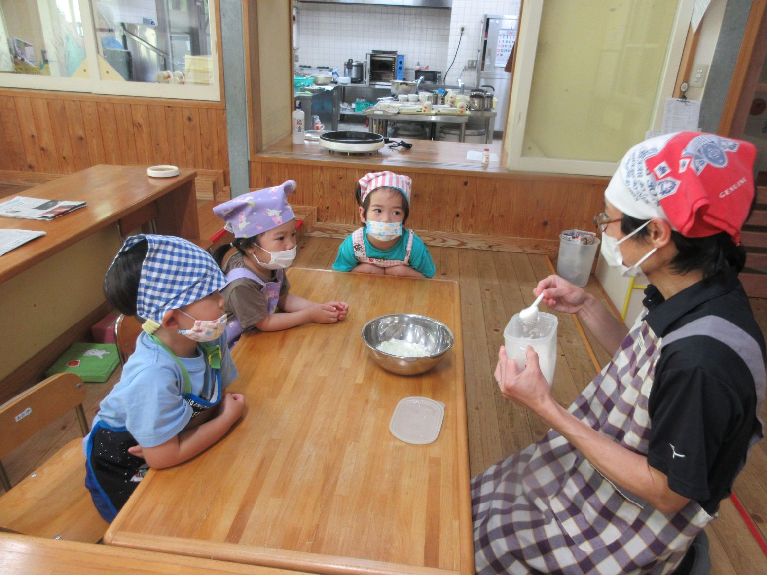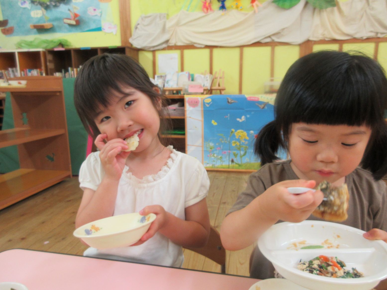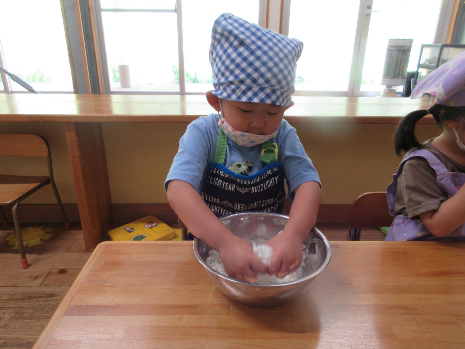 材料は玉ねぎ、片栗粉、塩のみ!!こども達は、出来上がった玉ねぎ焼きを食べて「ほっぺたが おちそう♪」「めっちゃ ふわふわ~」と言いながらぺろりと食べました。