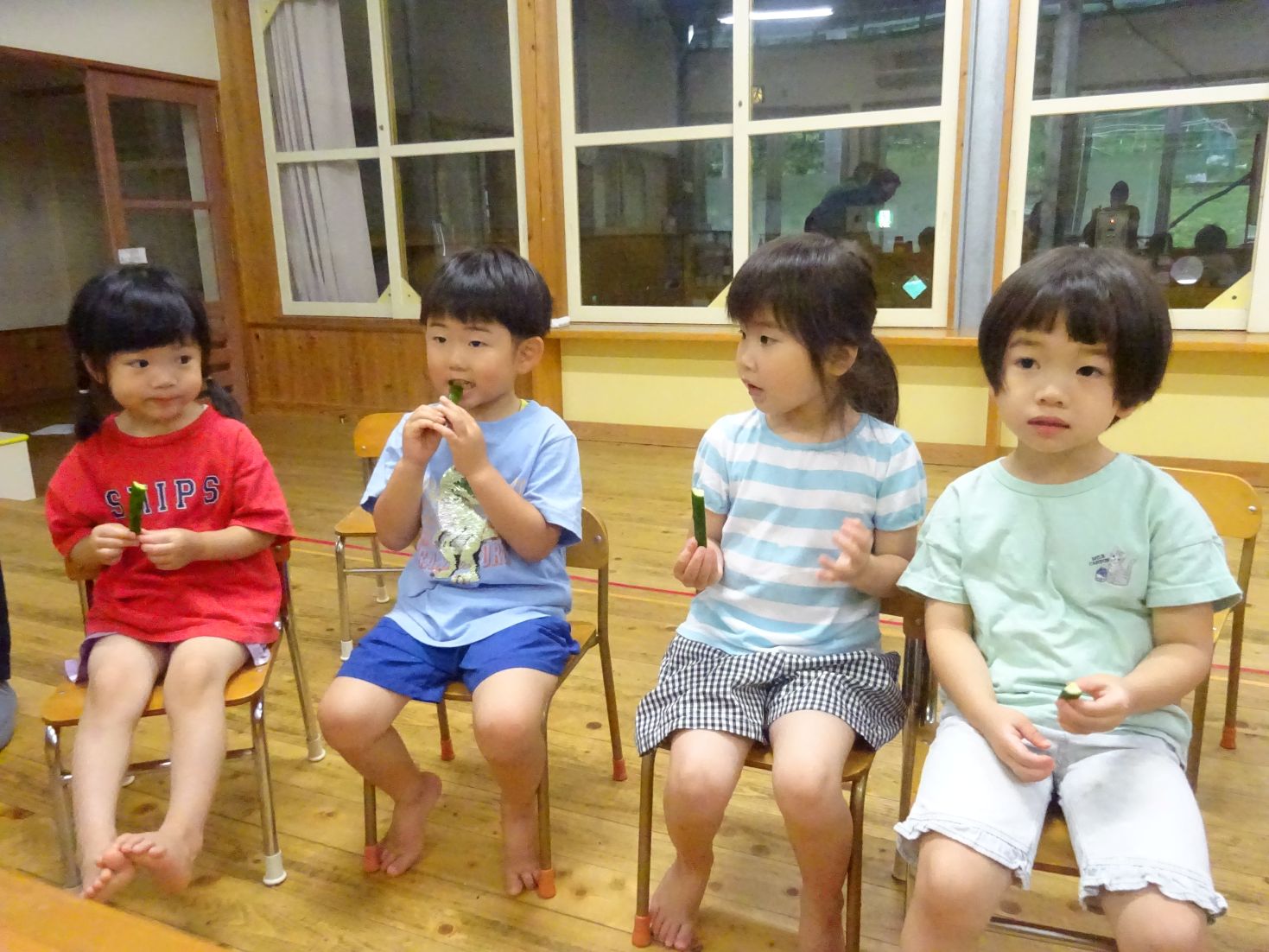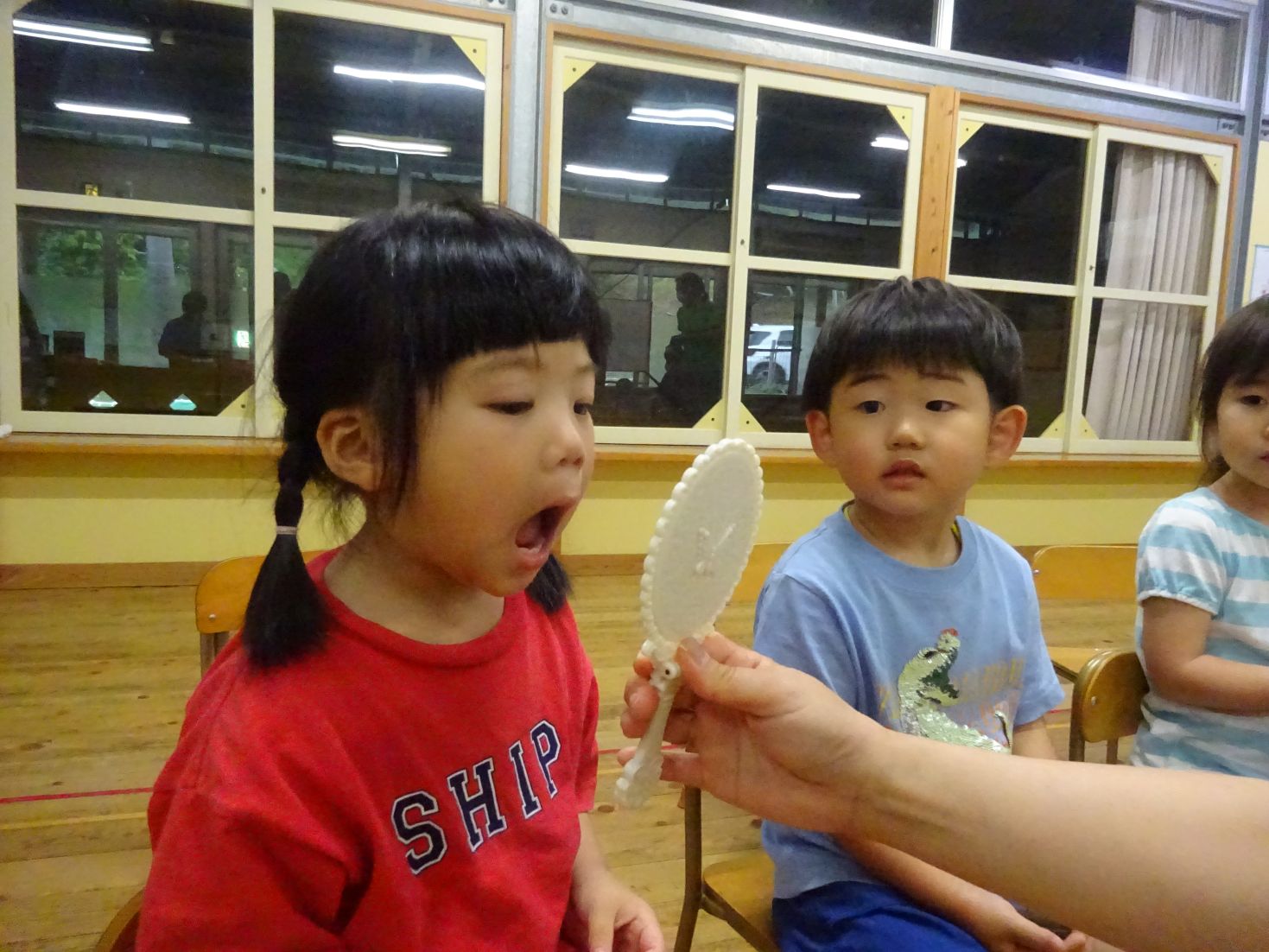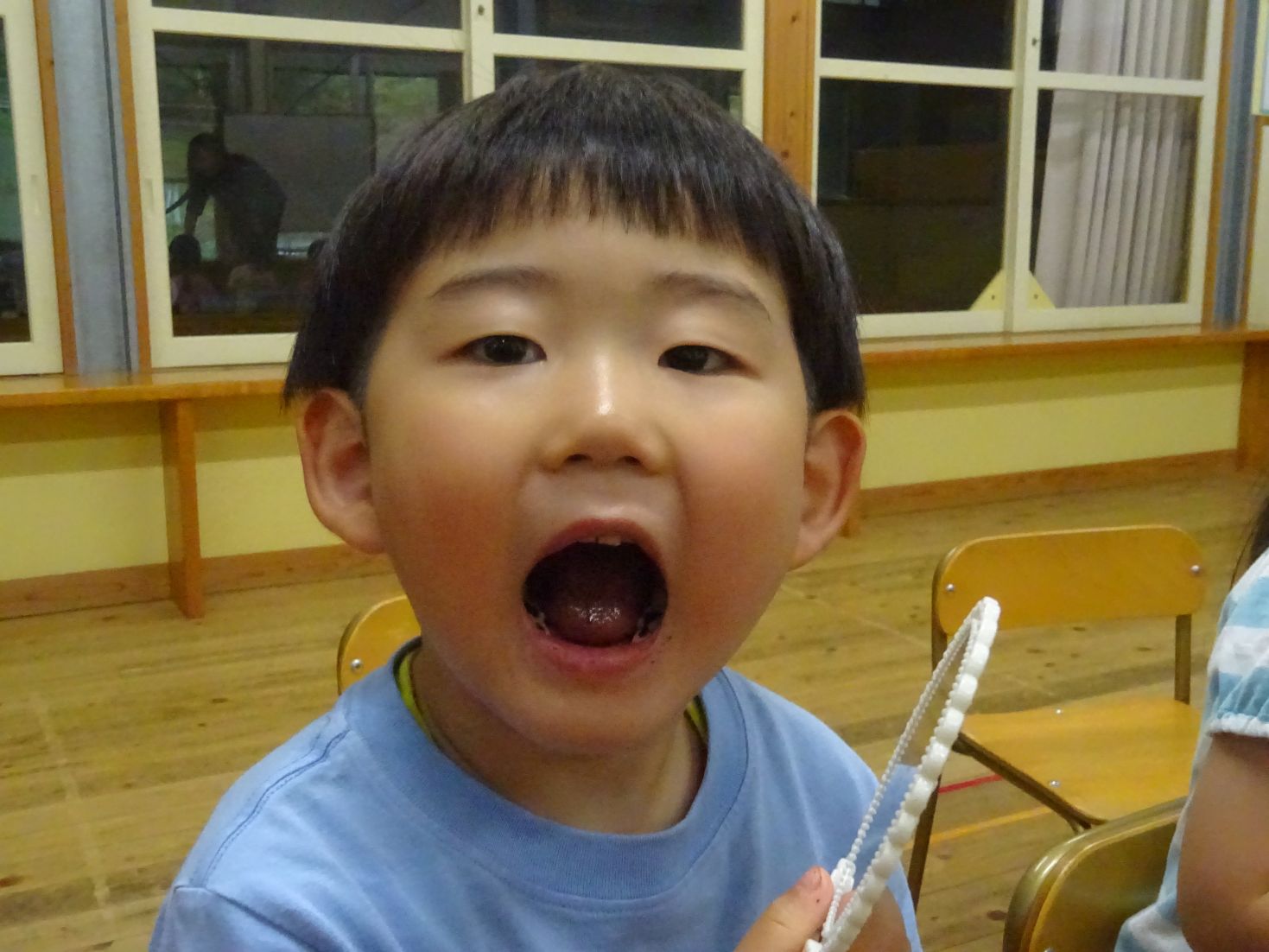 始めに、ビスケットを食べた後の口内を鏡で観察すると「わーくろい」「ばいきんがいるー」とこども達。続いて、胡瓜のスティックをカリカリ…食べた後の口内を観察すると「きれーい」「べろもきれい」と違いに気が付きました。