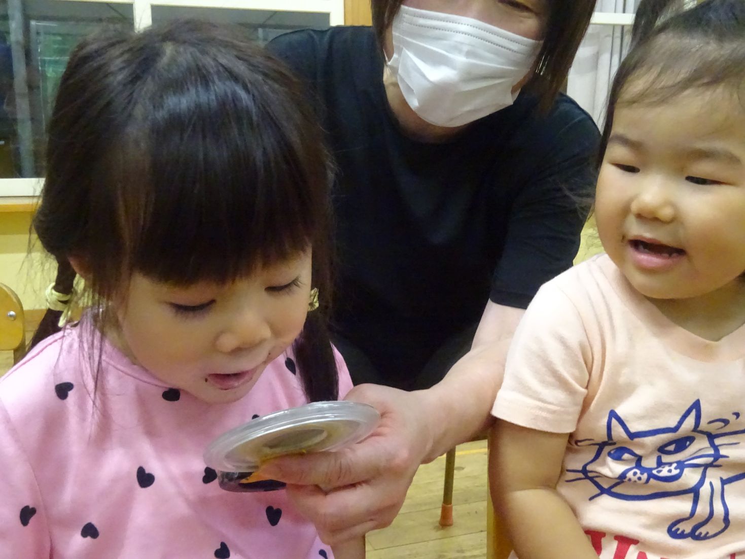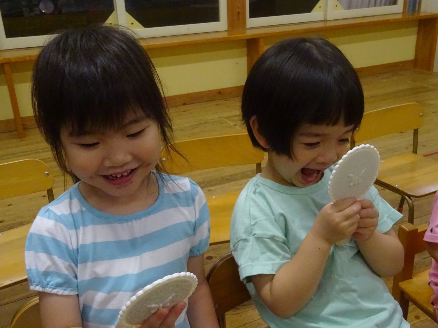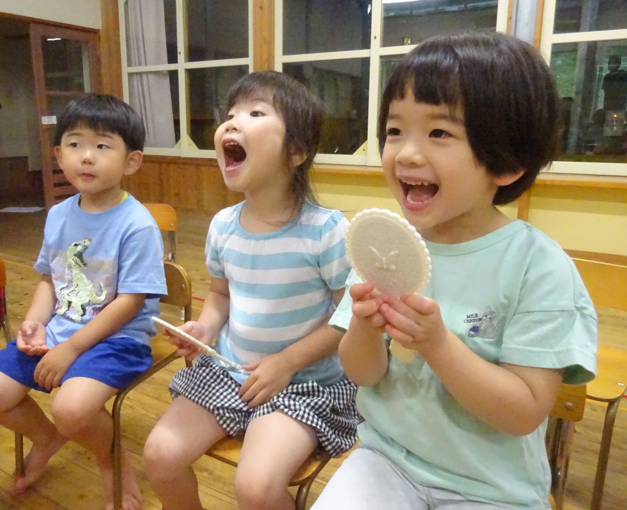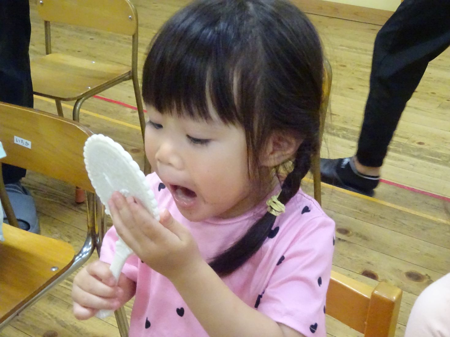 始めに、ビスケットを食べた後の口内を鏡で観察すると「わーくろい」「ばいきんがいるー」とこども達。続いて、胡瓜のスティックをカリカリ…食べた後の口内を観察すると「きれーい」「べろもきれい」と違いに気が付きました。