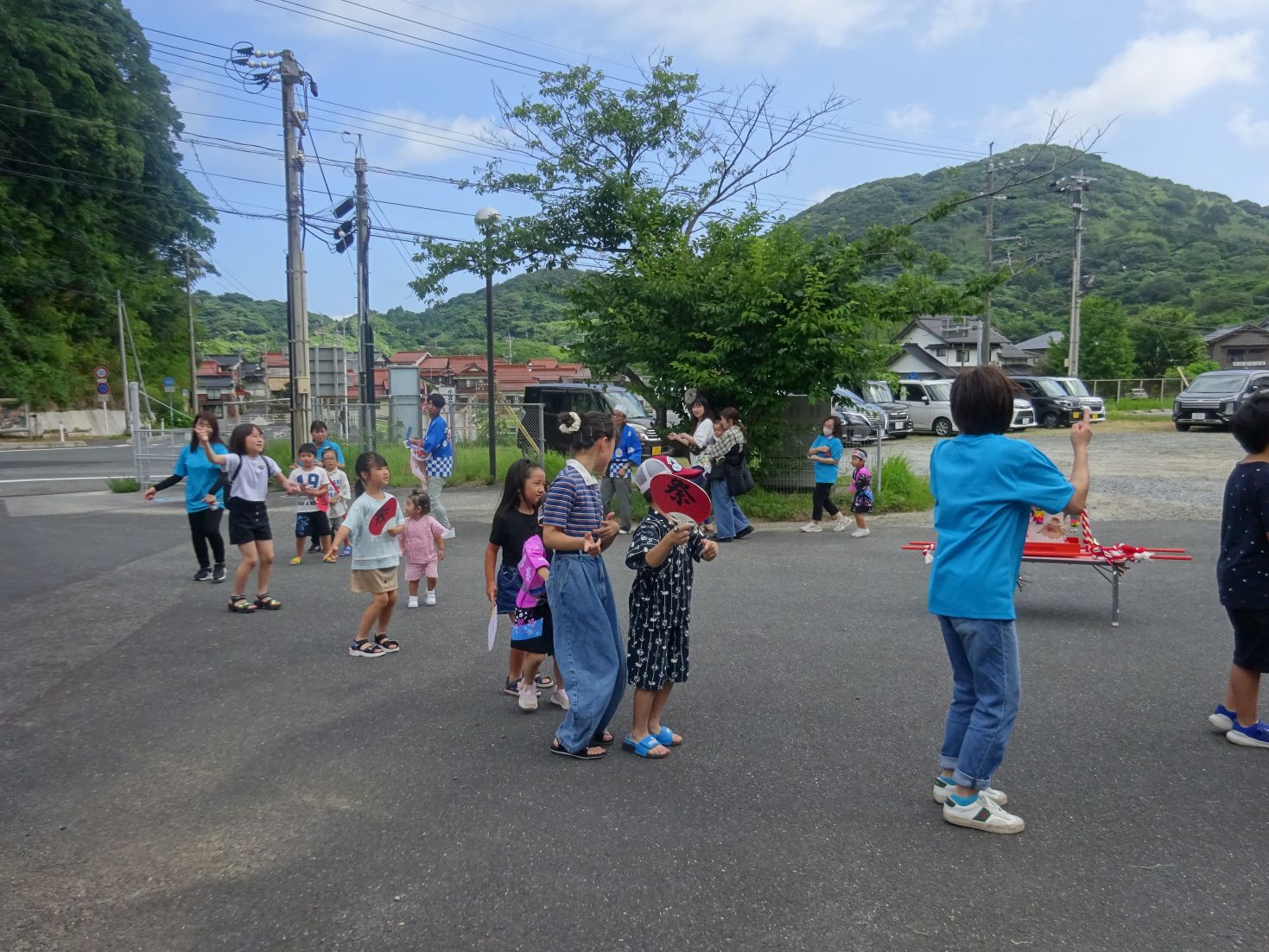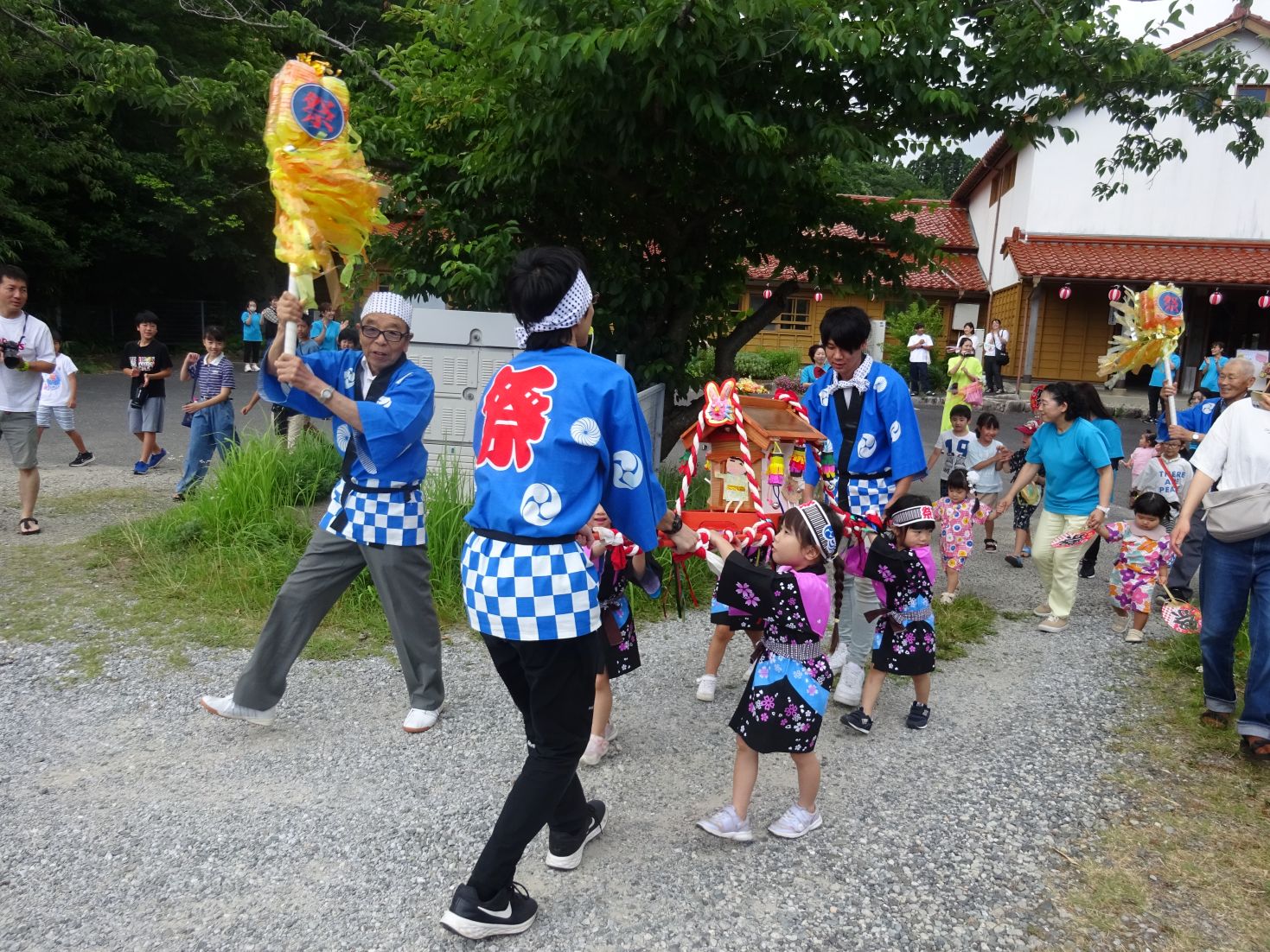 爽やかな風が吹く中、3,4歳児のお神輿担ぎで始まった‟夏まつり”。お神輿の後ろを1,2歳児がうちわを仰いで可愛く賑わいを見せました。その後は、育了児の小学生や地域講師さんを誘っての盆踊りも賑やかでした。