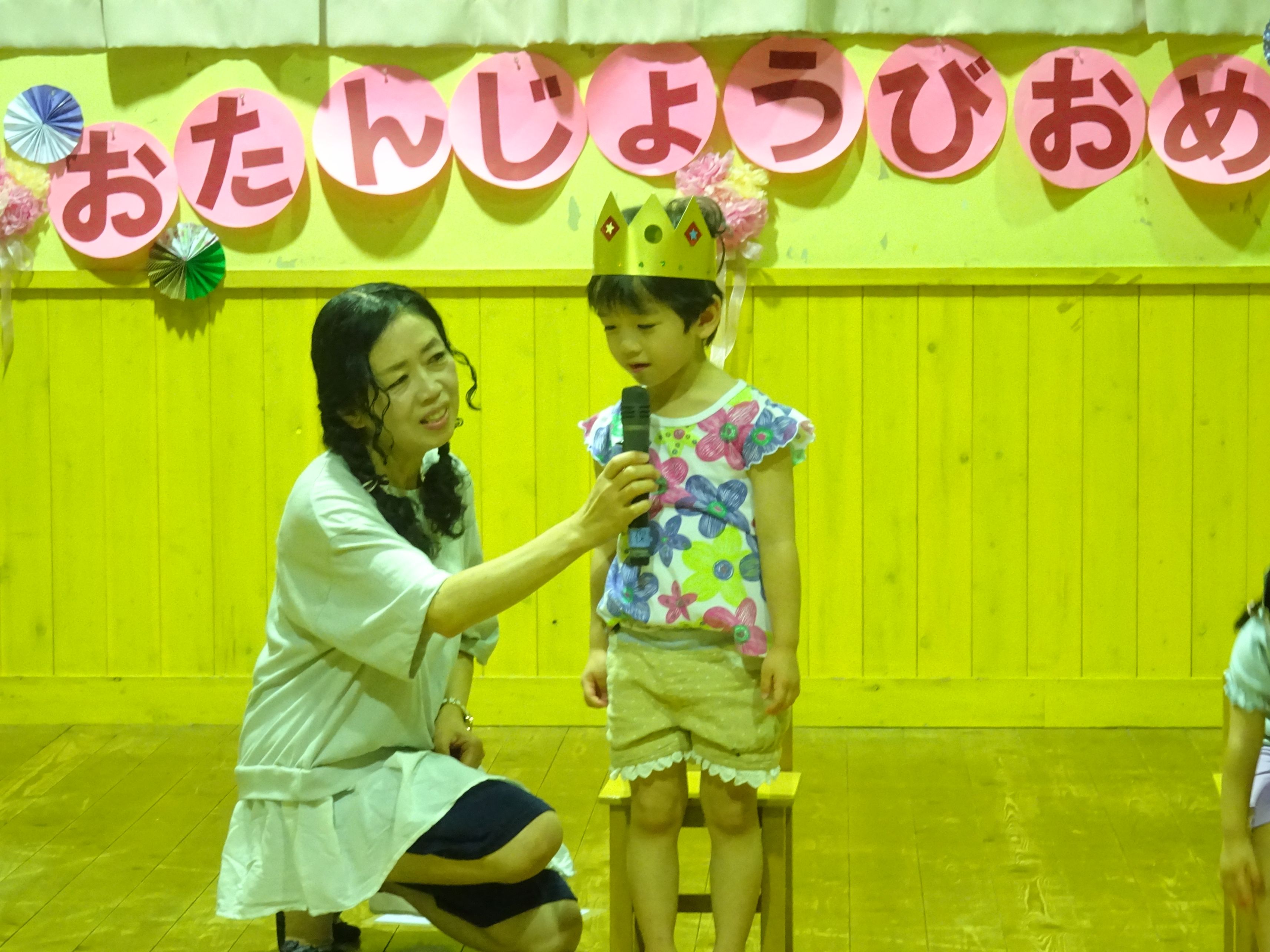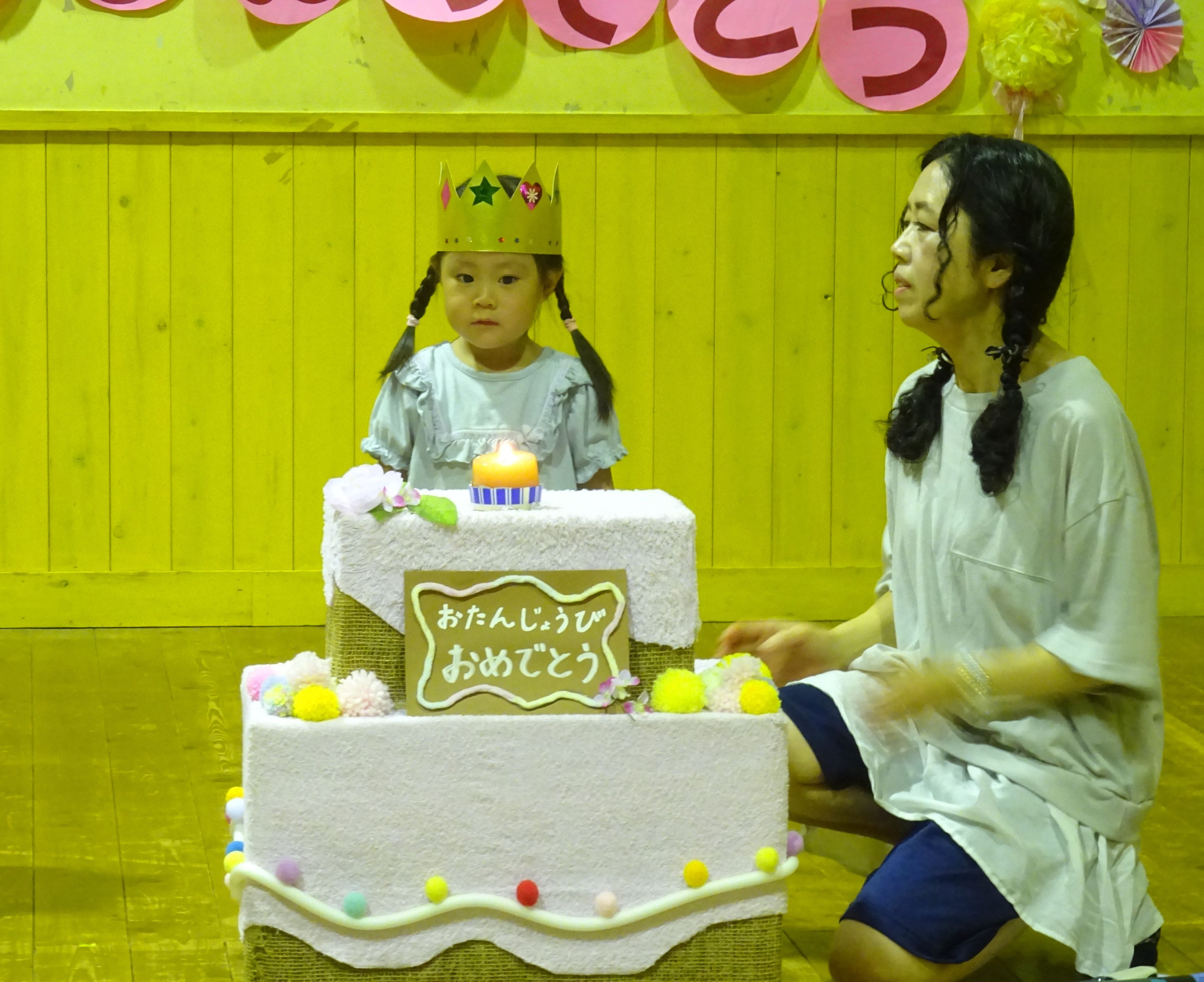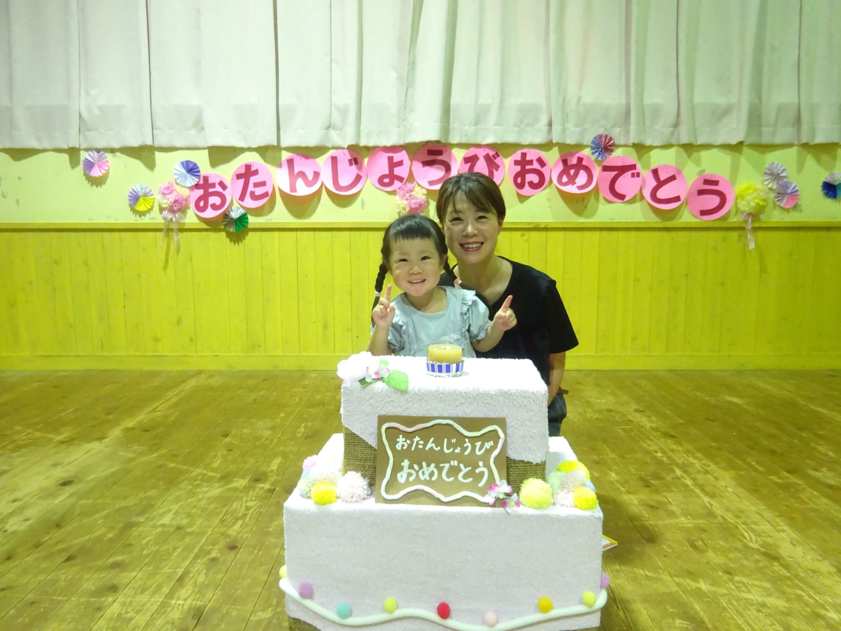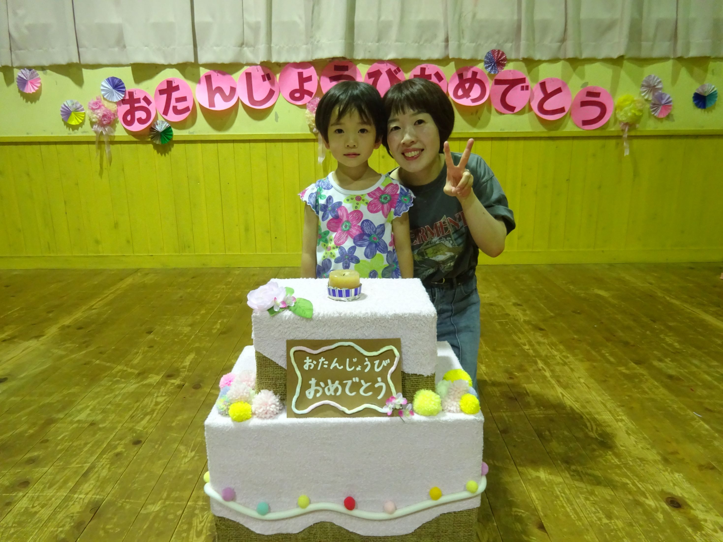 今日は2名の誕生児さんをお祝いしました。司会のお友達は、少し緊張した様子でしたが練習をしていたので、張り切って進めてくれました。誕生児さんは元気よく自己紹介をしたり、質問にしっかりと答えたりしていました。お母さんには、誕生児さんの昨年の誕生日から今日までの成長したことを、話してもらいました。お楽しみ会ではマジックショーをしました。途中でネタバレする事もありましたが、とっても盛り上がりました。会の後では、お母さんと一緒に美味しい誕生会のメニューを、嬉しそうに食べていました。