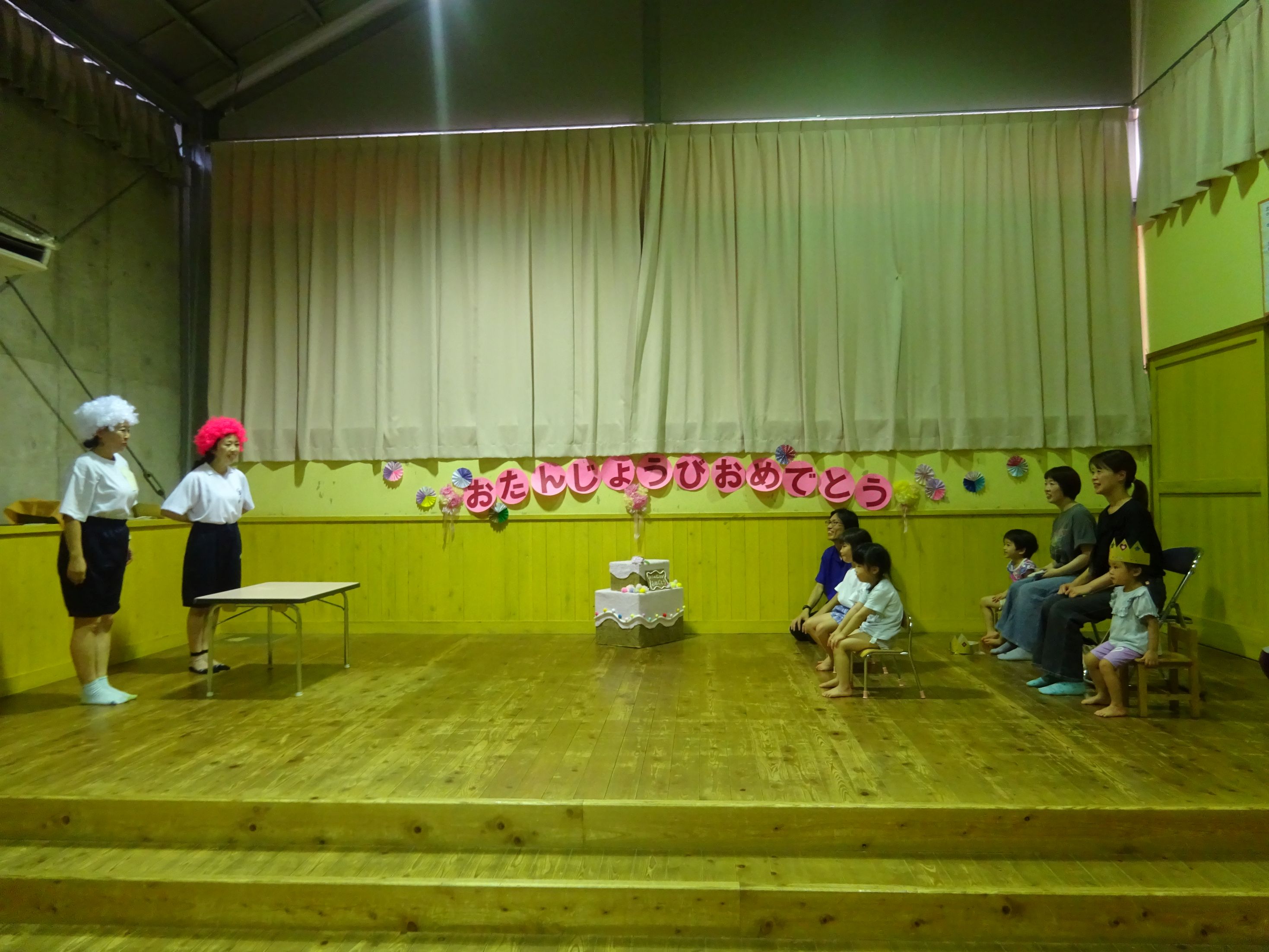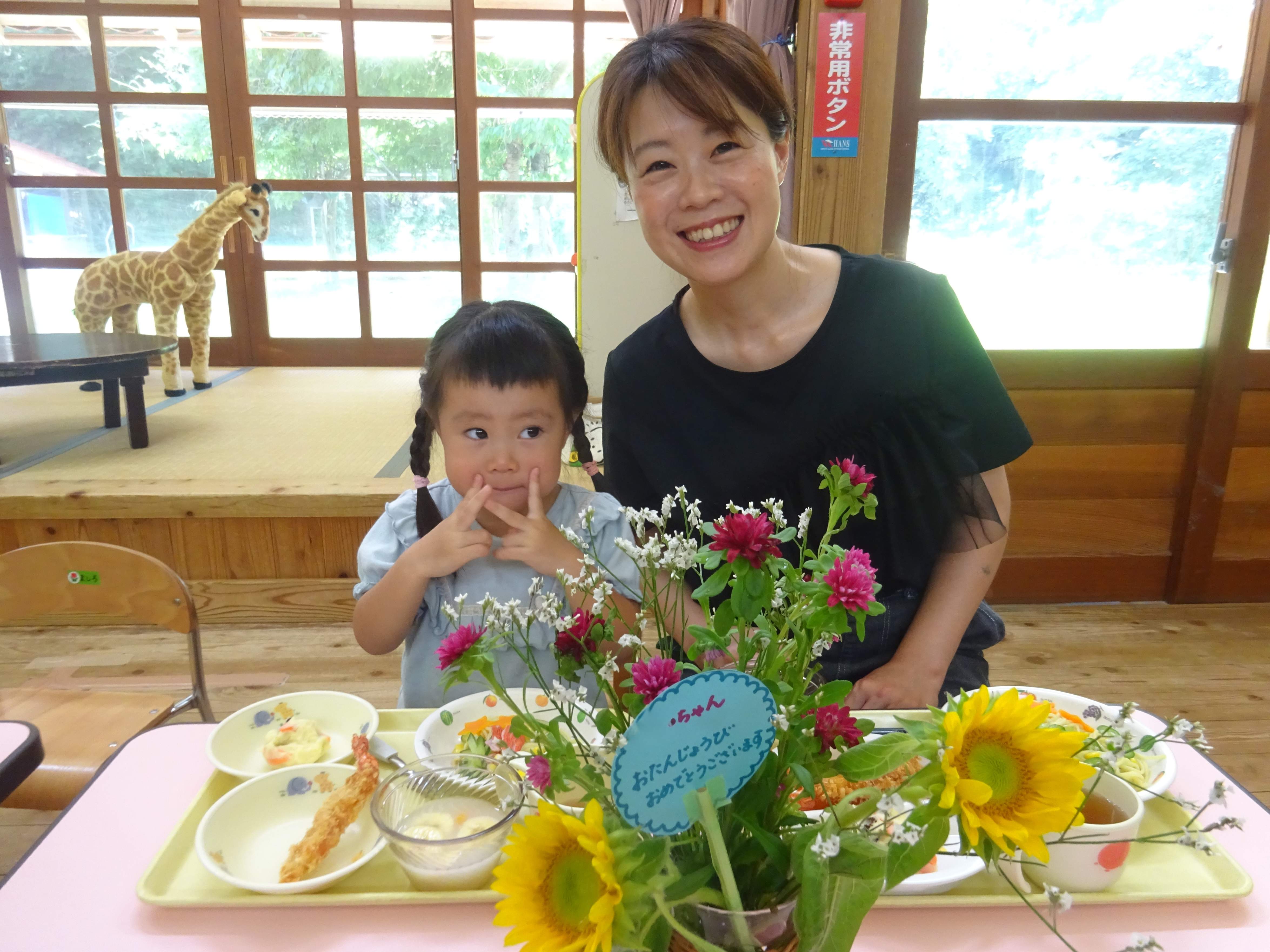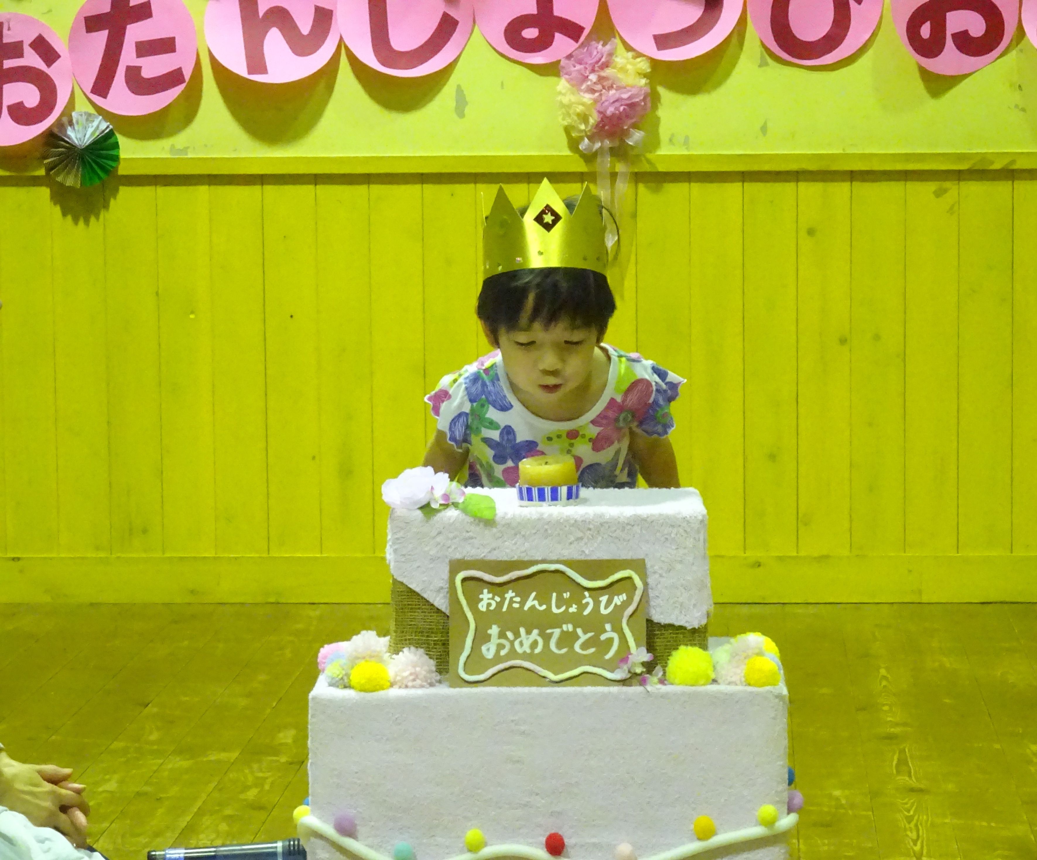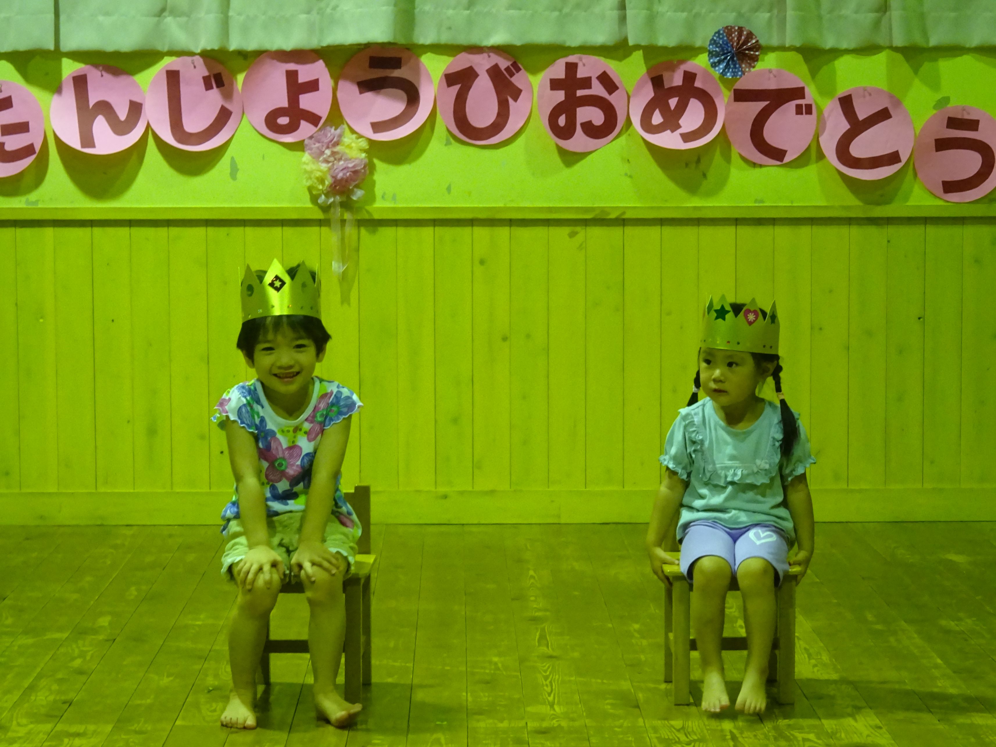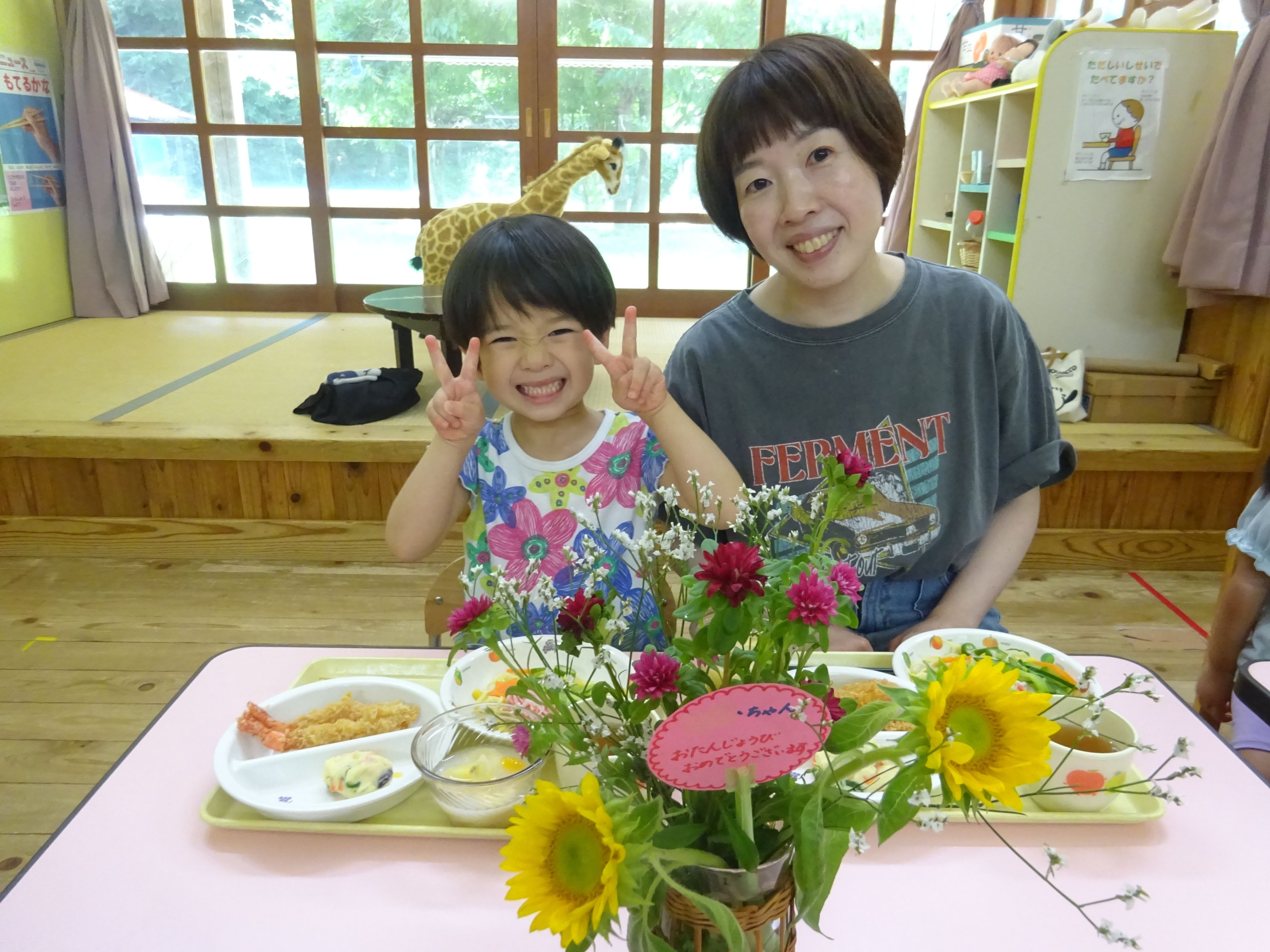 今日は2名の誕生児さんをお祝いしました。司会のお友達は、少し緊張した様子でしたが練習をしていたので、張り切って進めてくれました。誕生児さんは元気よく自己紹介をしたり、質問にしっかりと答えたりしていました。お母さんには、誕生児さんの昨年の誕生日から今日までの成長したことを、話してもらいました。お楽しみ会ではマジックショーをしました。途中でネタバレする事もありましたが、とっても盛り上がりました。会の後では、お母さんと一緒に美味しい誕生会のメニューを、嬉しそうに食べていました。