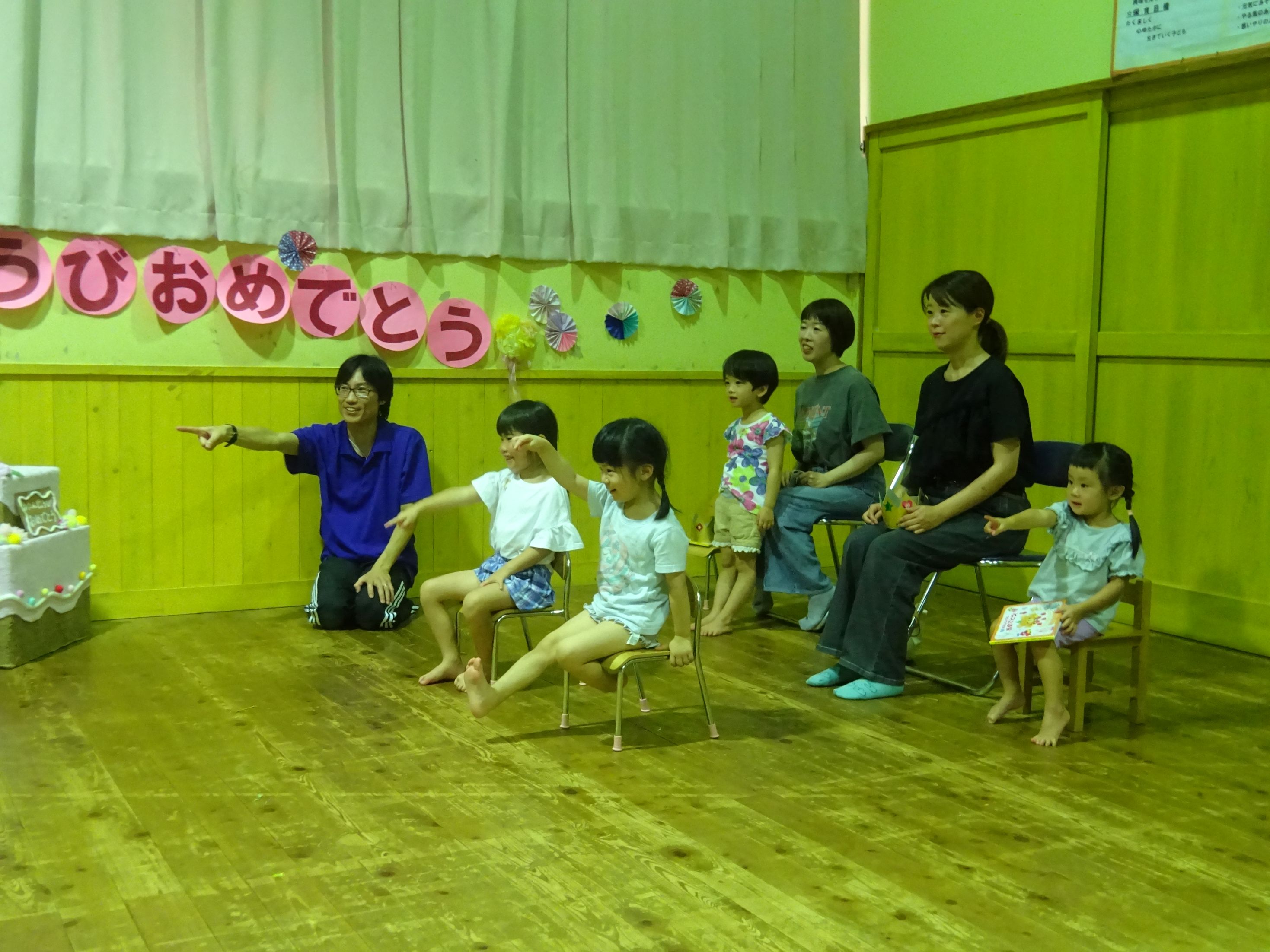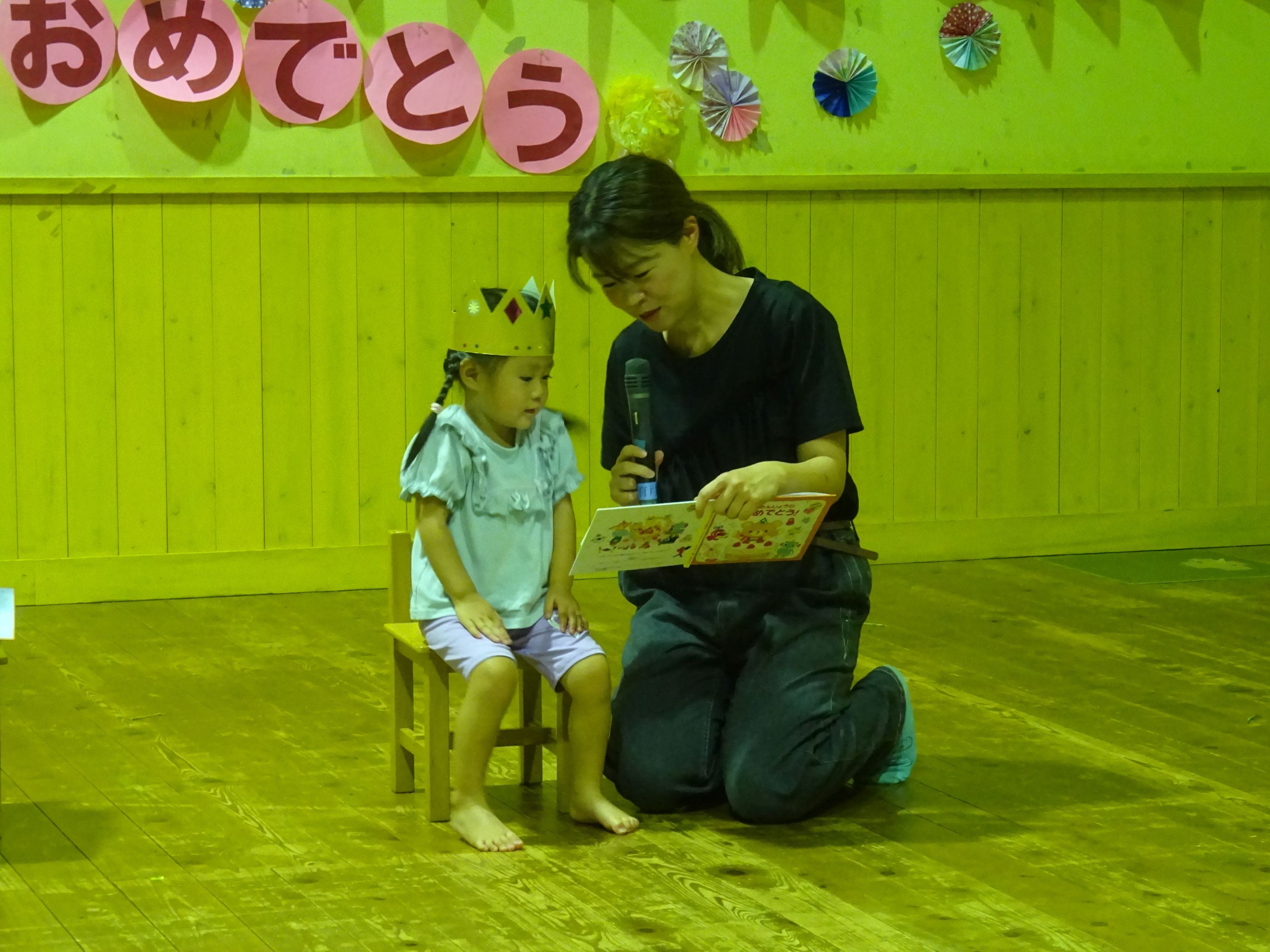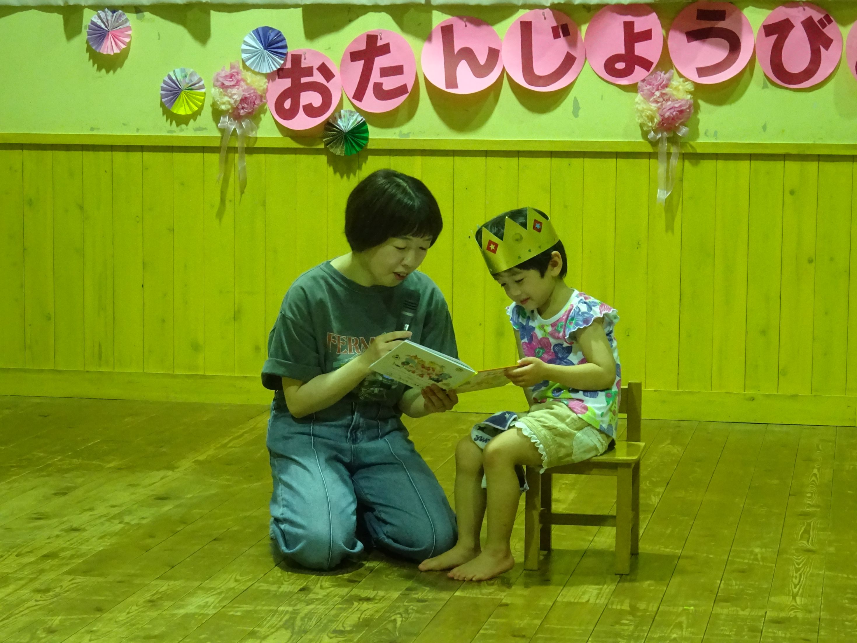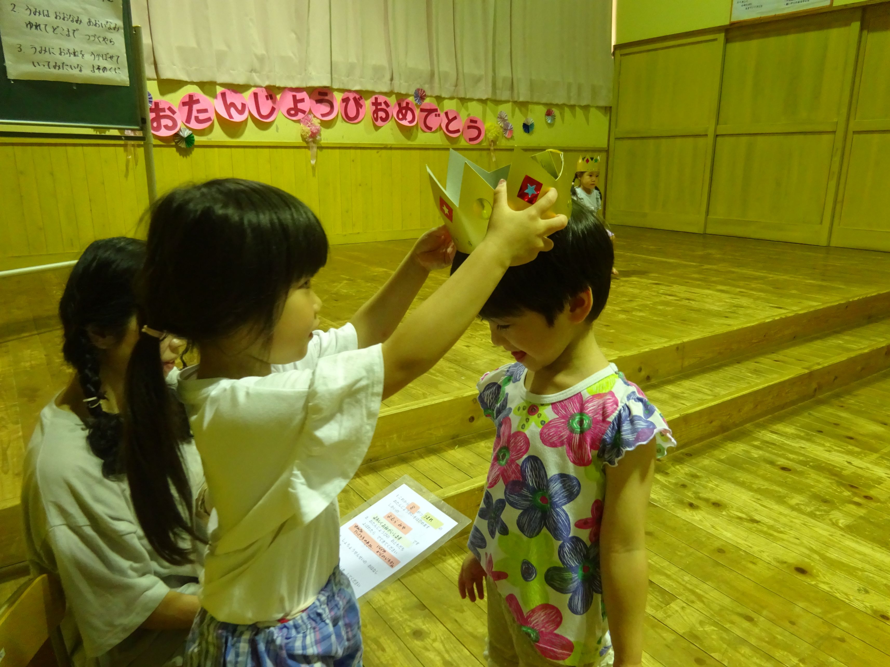 今日は2名の誕生児さんをお祝いしました。司会のお友達は、少し緊張した様子でしたが練習をしていたので、張り切って進めてくれました。誕生児さんは元気よく自己紹介をしたり、質問にしっかりと答えたりしていました。お母さんには、誕生児さんの昨年の誕生日から今日までの成長したことを、話してもらいました。お楽しみ会ではマジックショーをしました。途中でネタバレする事もありましたが、とっても盛り上がりました。会の後では、お母さんと一緒に美味しい誕生会のメニューを、嬉しそうに食べていました。