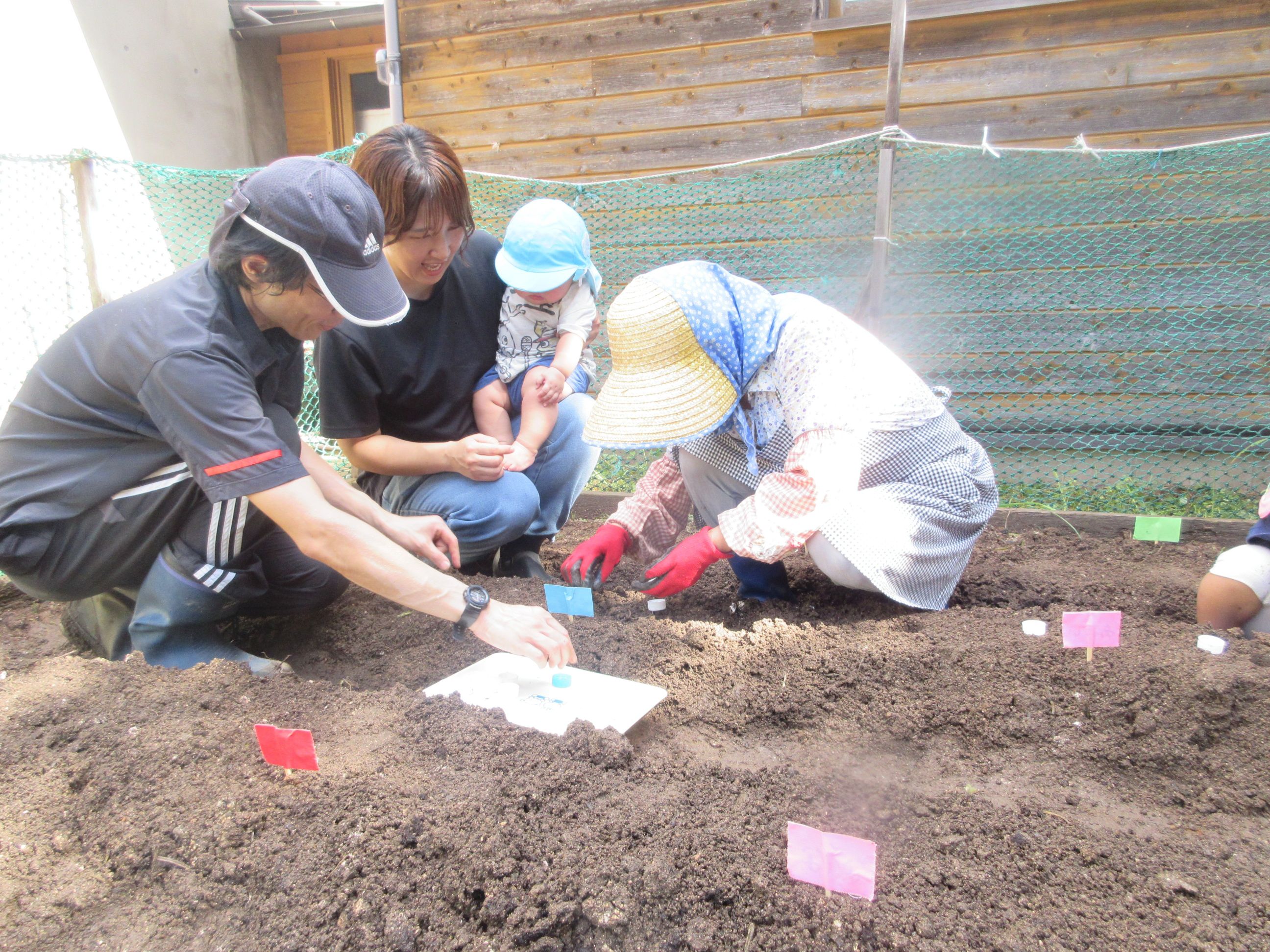 今日は地域講師の方3名に来て頂き、一緒に大根の種まきをしました。