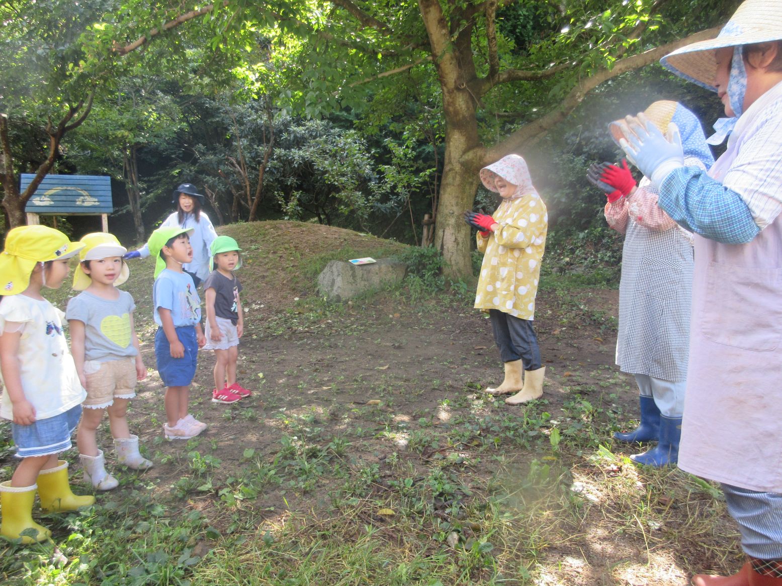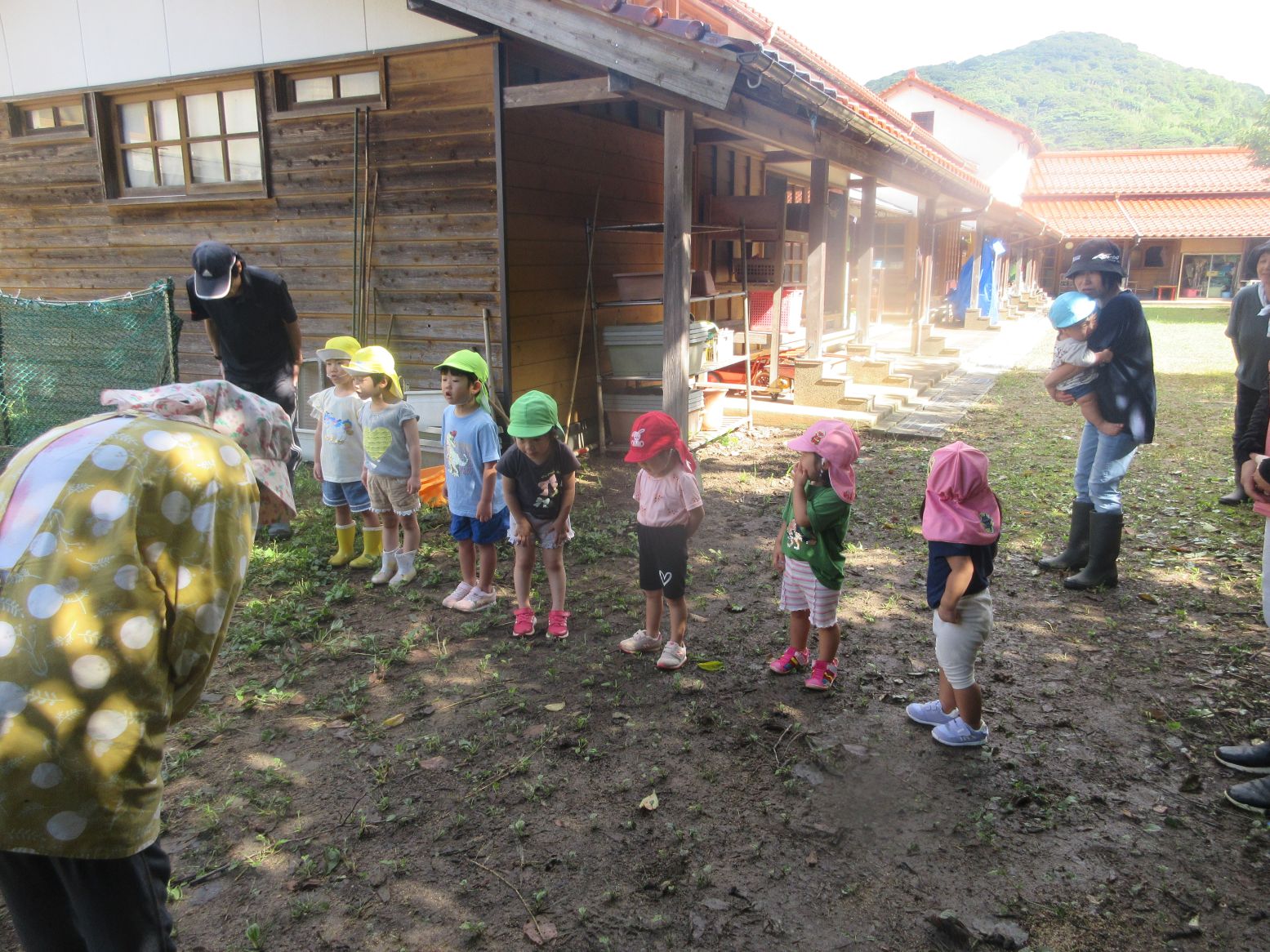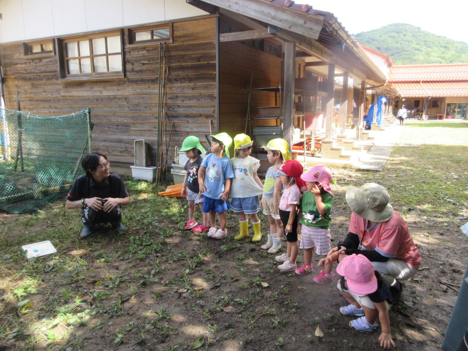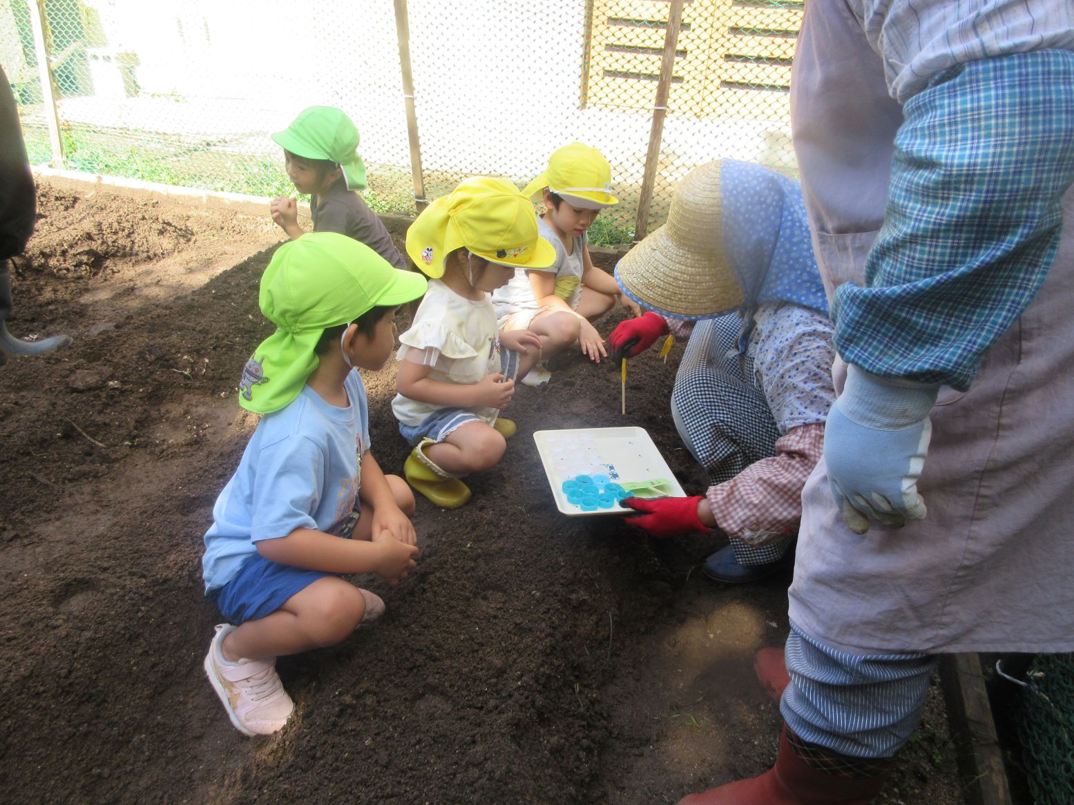 そしていつもならここで“水やり”となるのですが、今日は“水はやらなくていいんだよ(先日の雨の為)”という事を分かりやすく教えてくださいました。また、大根の芽が出てきたら一番元気な葉を残して、後は抜く事(間引き)も教わりました。こども達は真剣に話を聞きました。