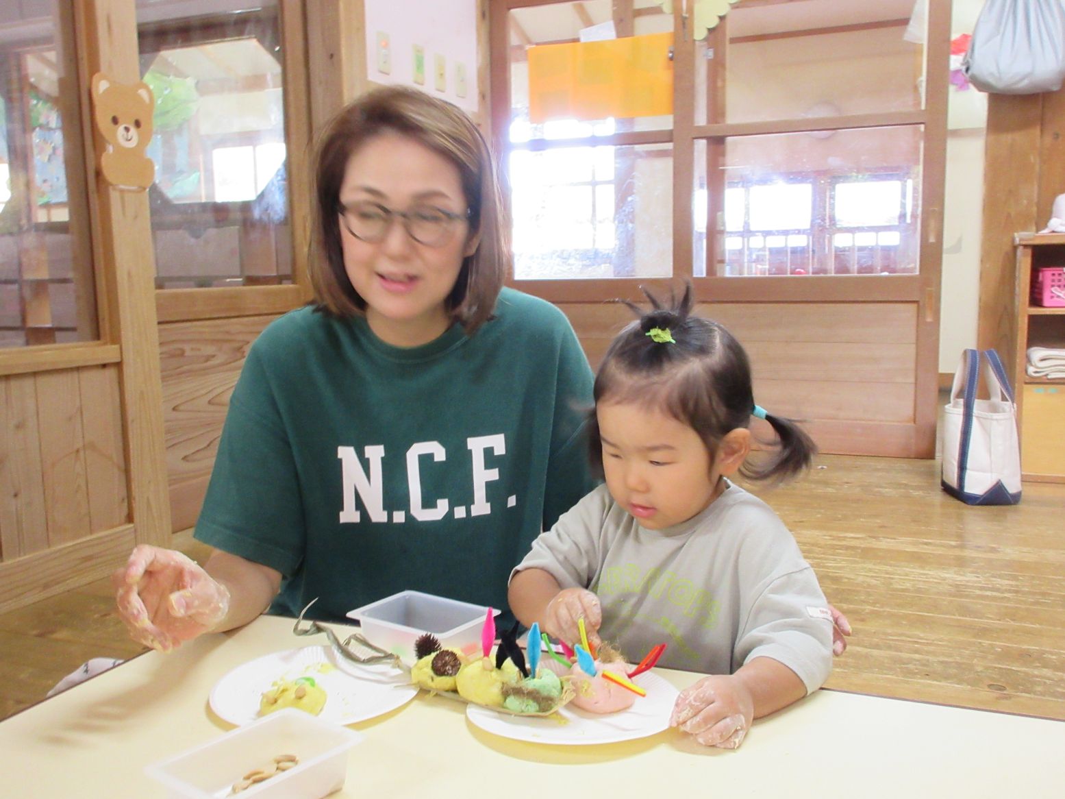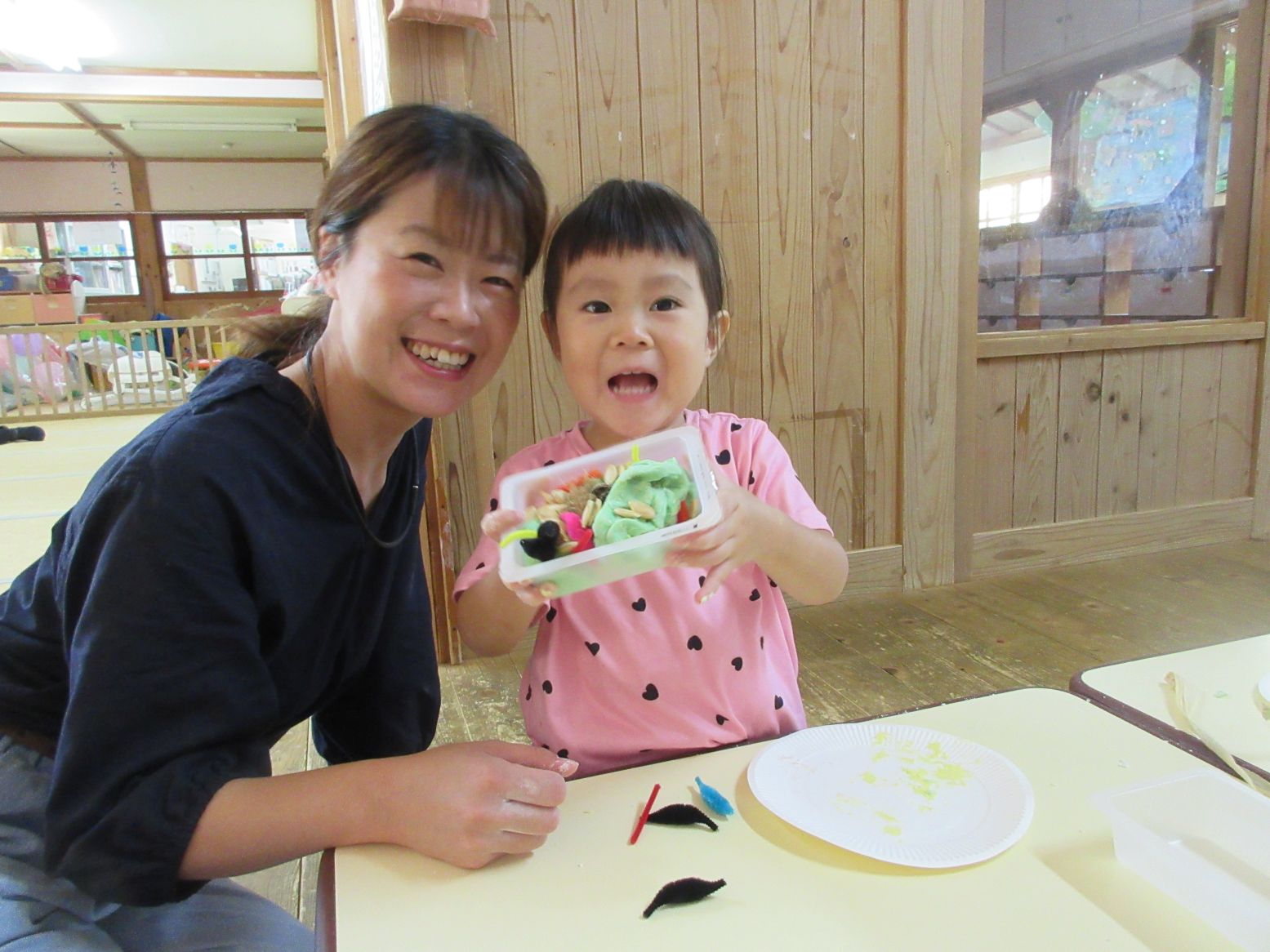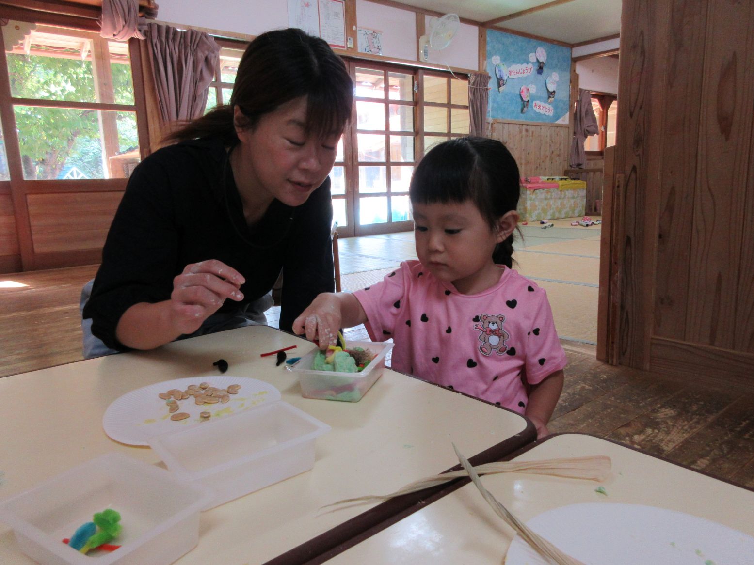 参観は、小波海水浴場で“クリーン大作戦”を予定していましたが、突然の大雨のため、室内遊びに変更をし“小麦粉粘土遊び”を行いました。粉の感触を味わい、水を加えてこねて出来上がると、早速、木の実、種、乾燥した皮、モールなどを加えて、親子で作っていきました。