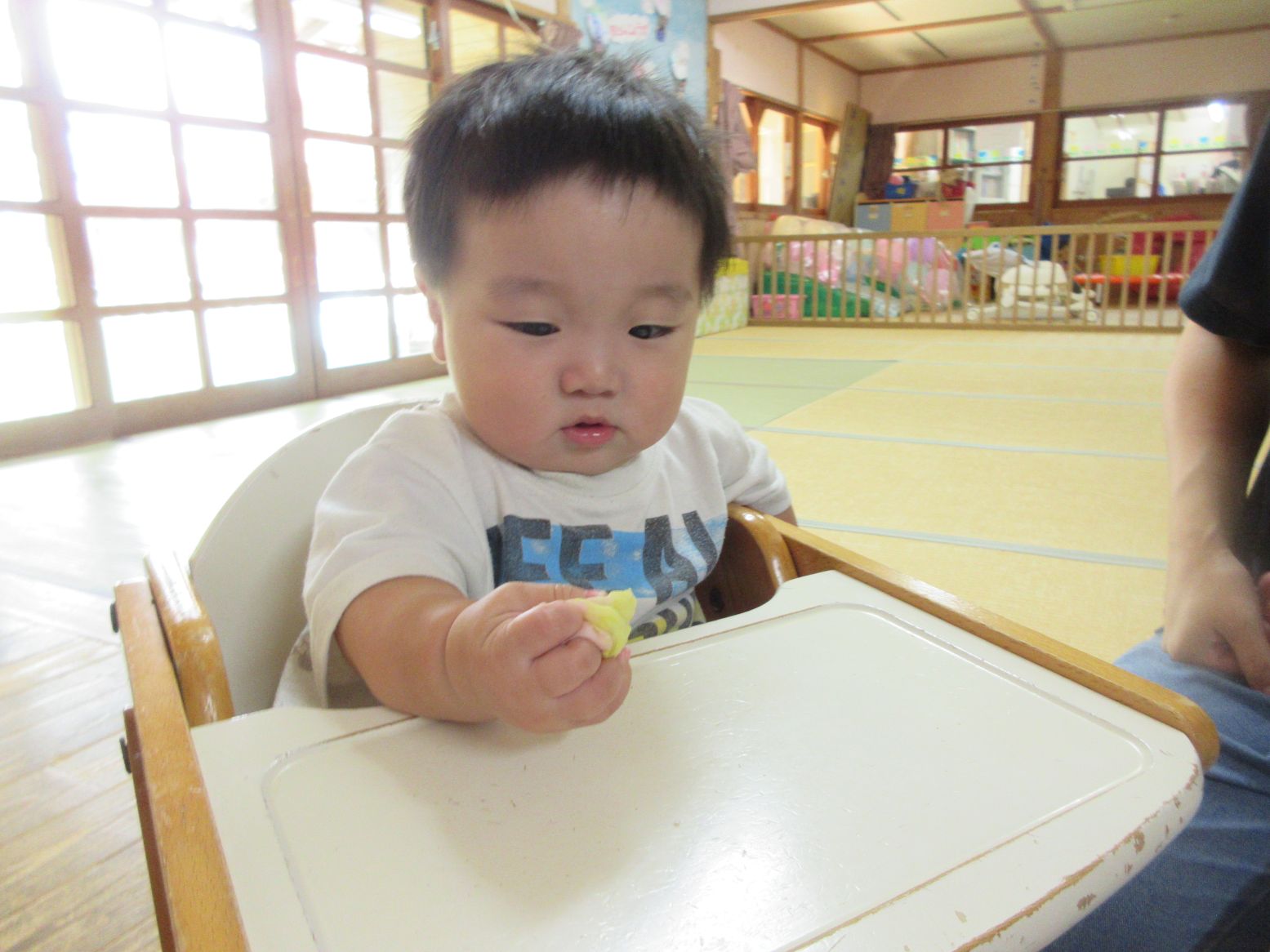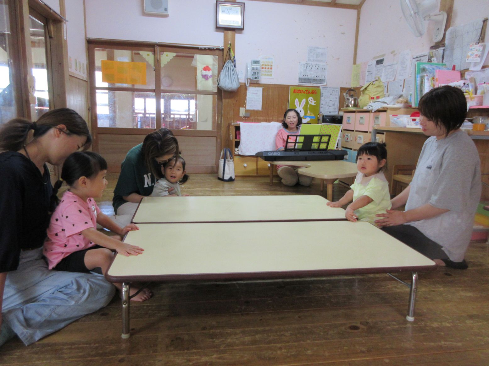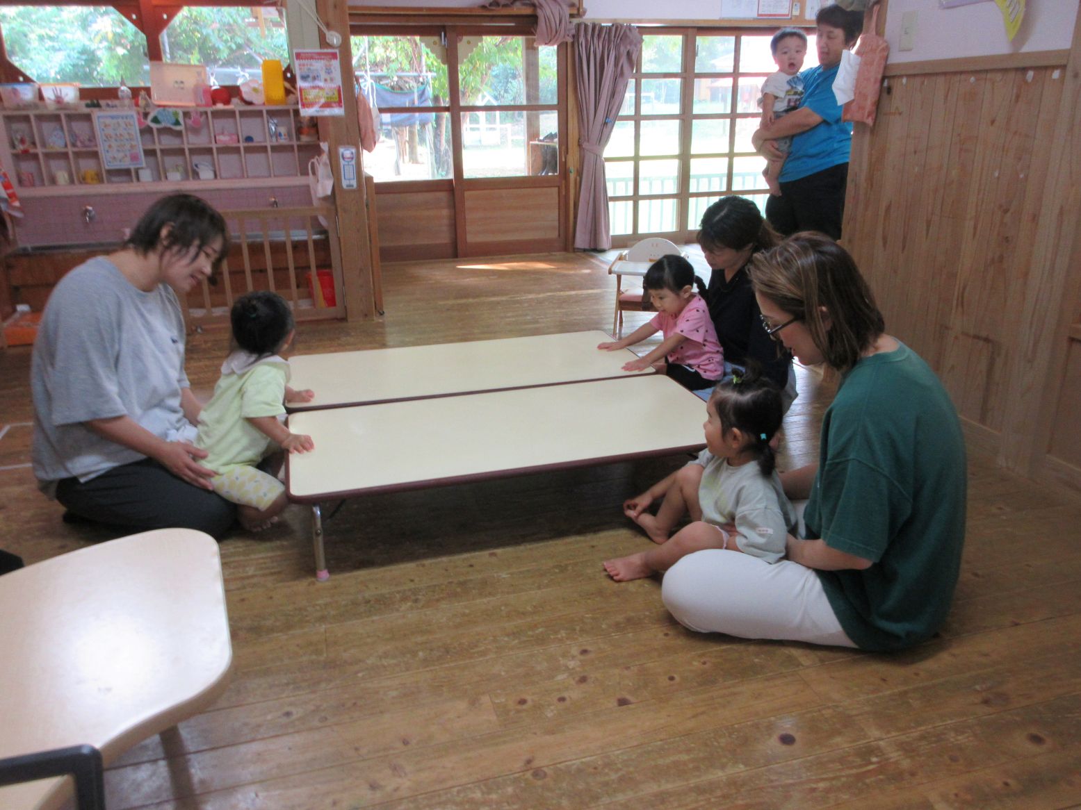 “朝の会” 大好きなお母さんの膝の上で元気に歌います
