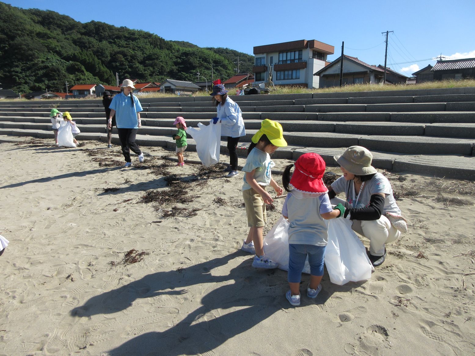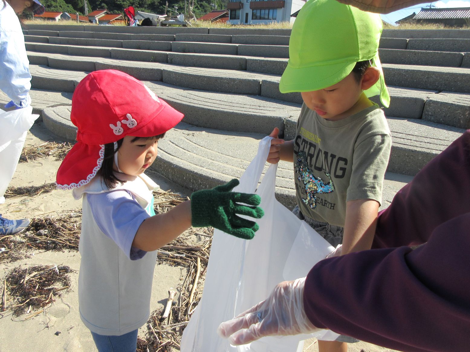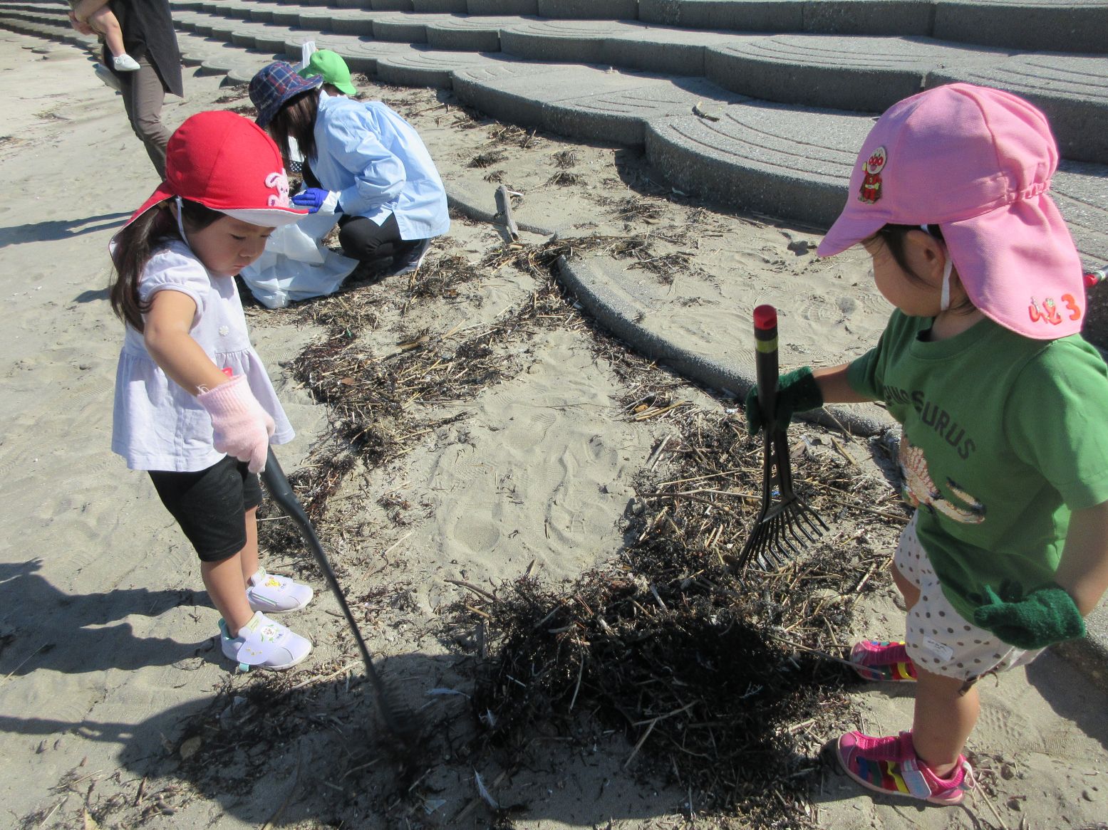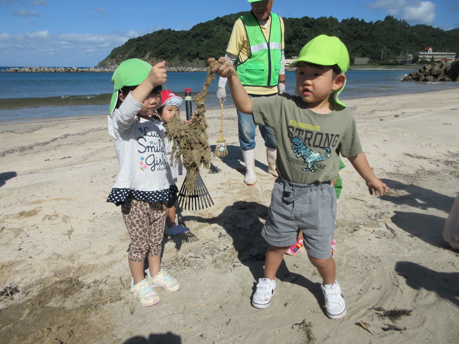 海岸では、生活環境安全推進委員の客野さんと共に清掃活動に取り組みました。小さな漂流ゴミを一生懸命拾う子や、砂に埋まったロープを両手で一生懸命掘り出した子、保育者と一緒にゴミ拾いを頑張った子、一人一人が一生懸命“海を綺麗にする”という気持ちをもって取り組みました。