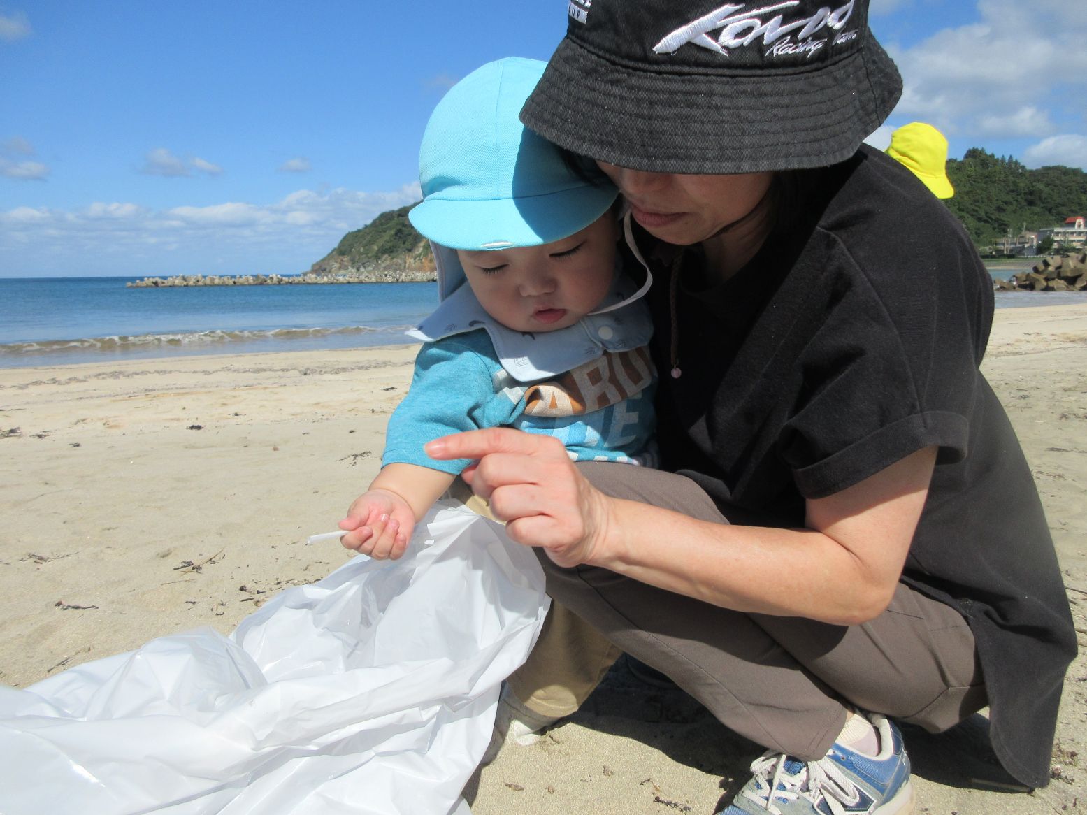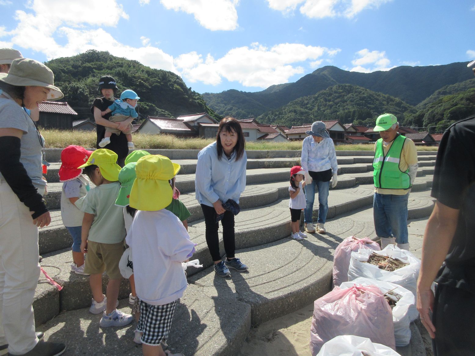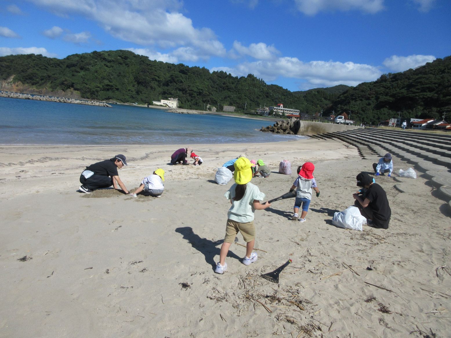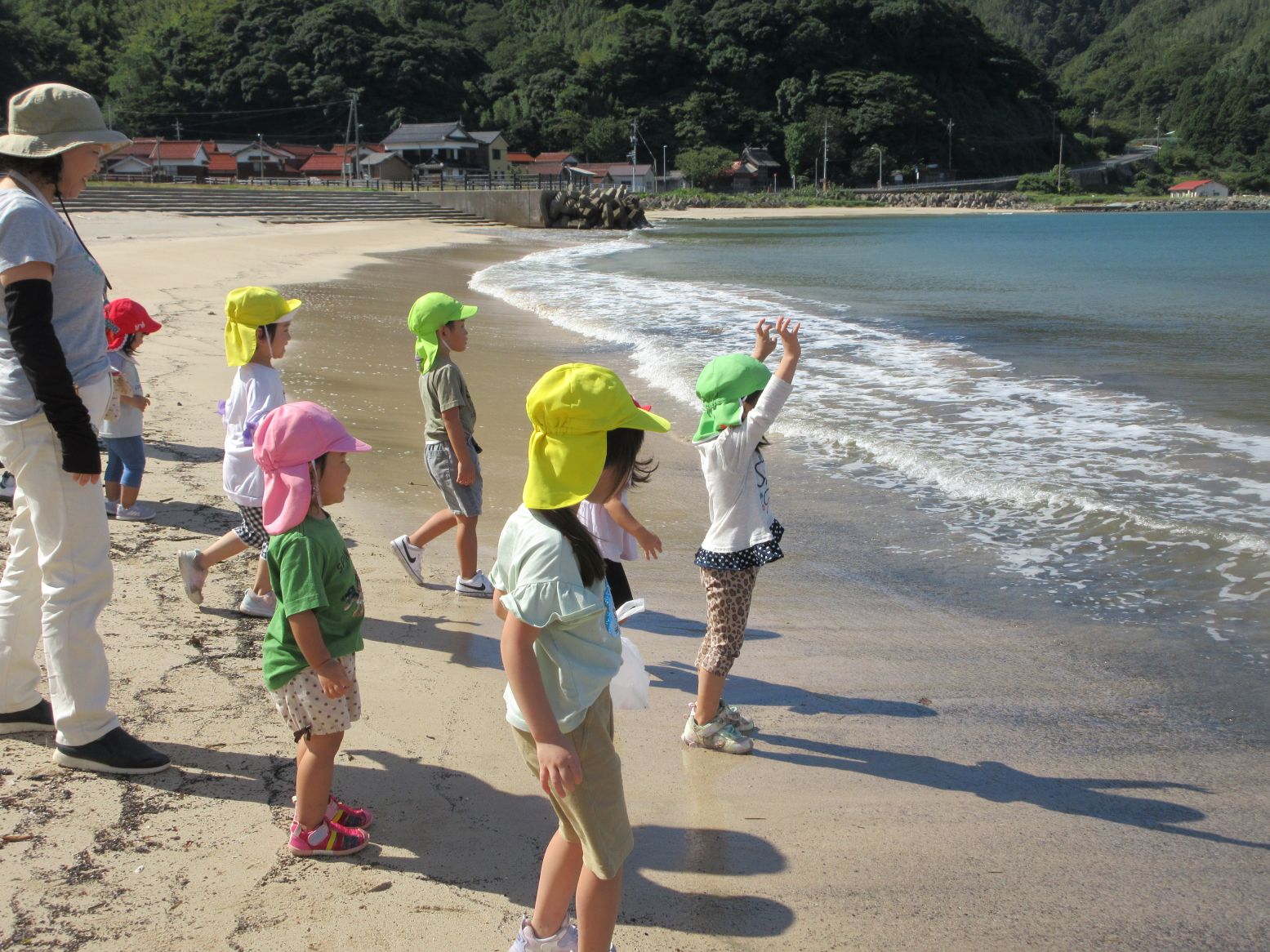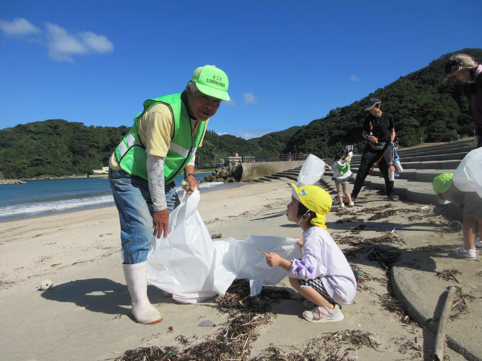 海岸では、生活環境安全推進委員の客野さんと共に清掃活動に取り組みました。小さな漂流ゴミを一生懸命拾う子や、砂に埋まったロープを両手で一生懸命掘り出した子、保育者と一緒にゴミ拾いを頑張った子、一人一人が一生懸命“海を綺麗にする”という気持ちをもって取り組みました。