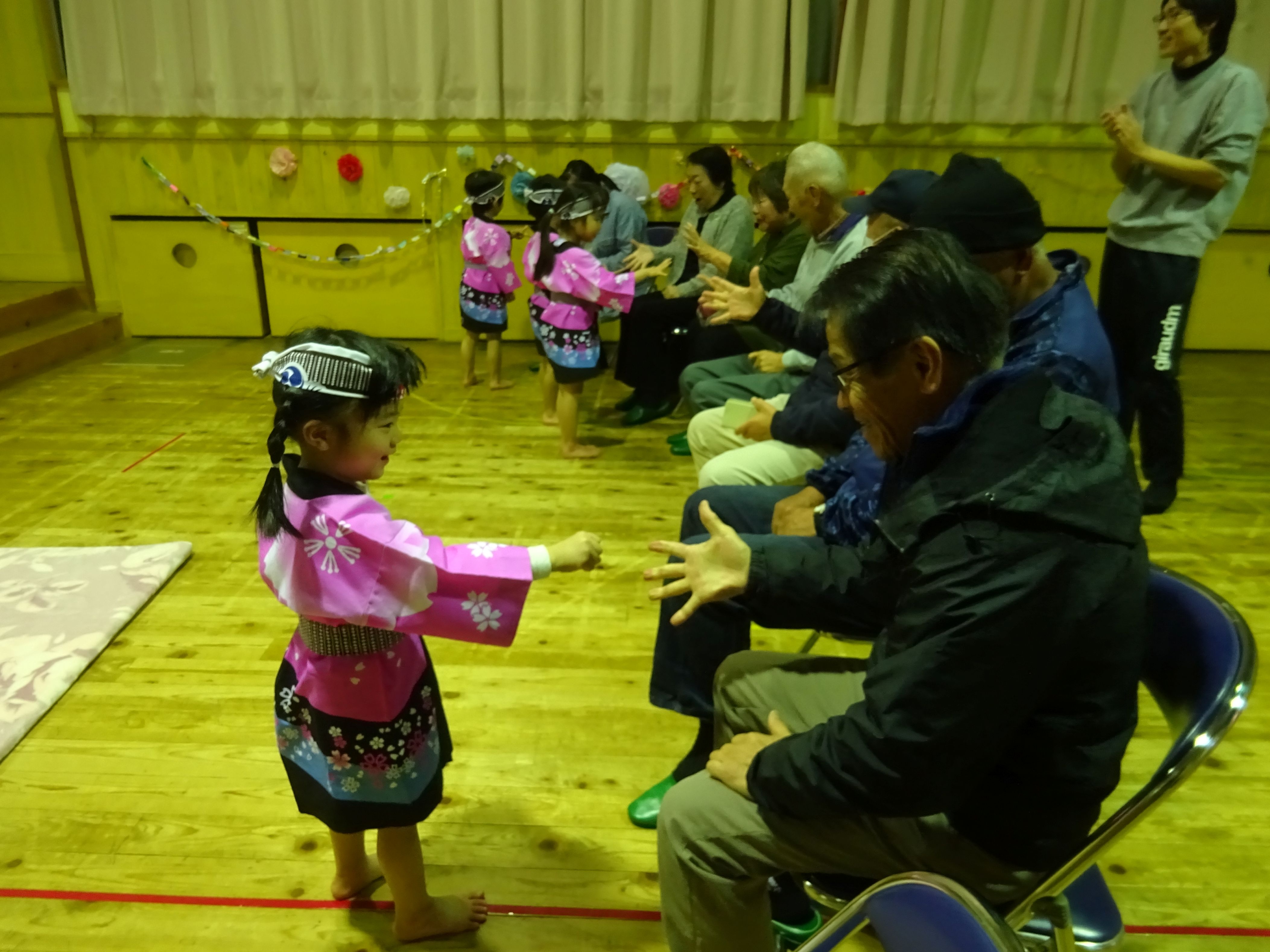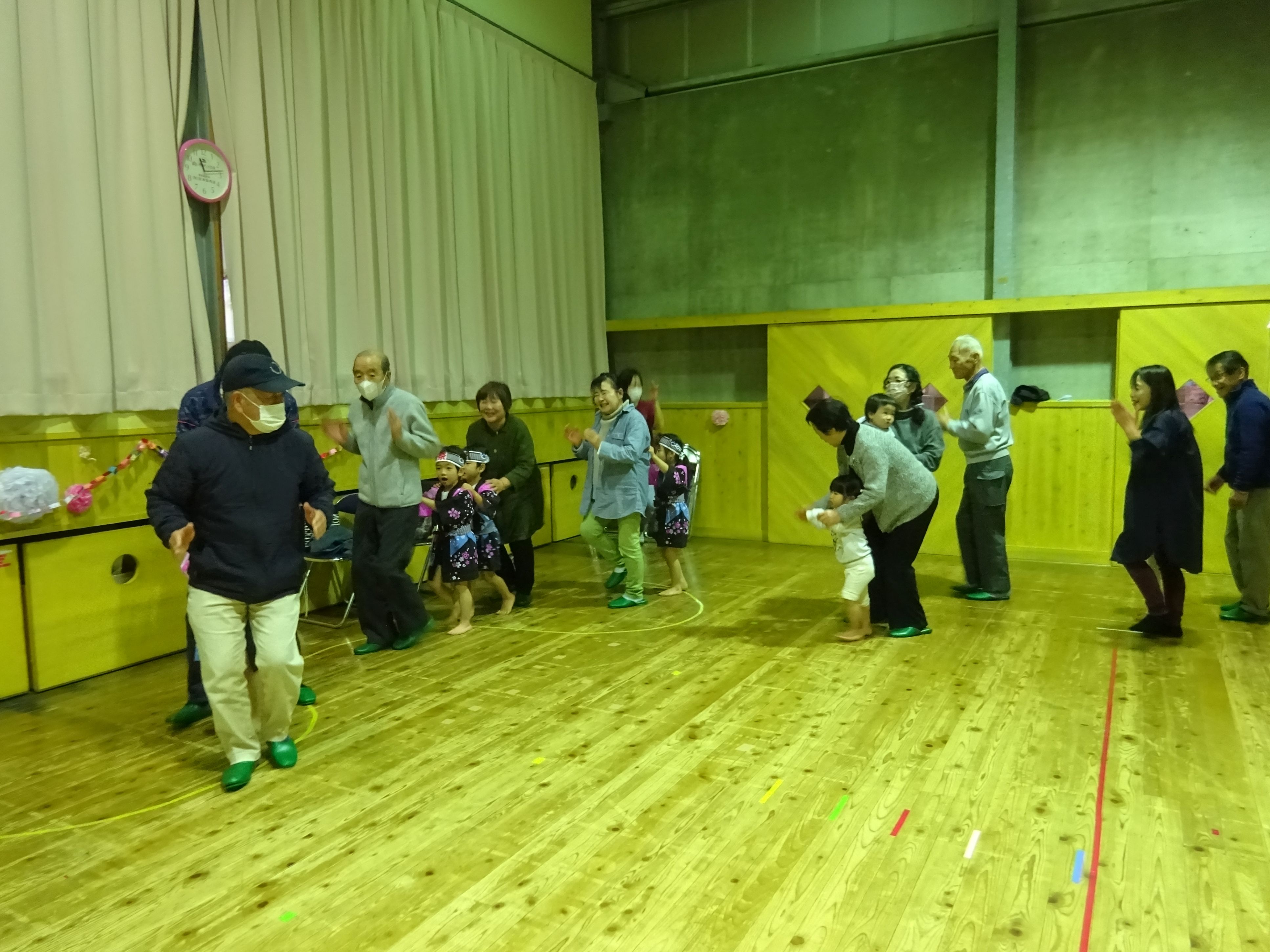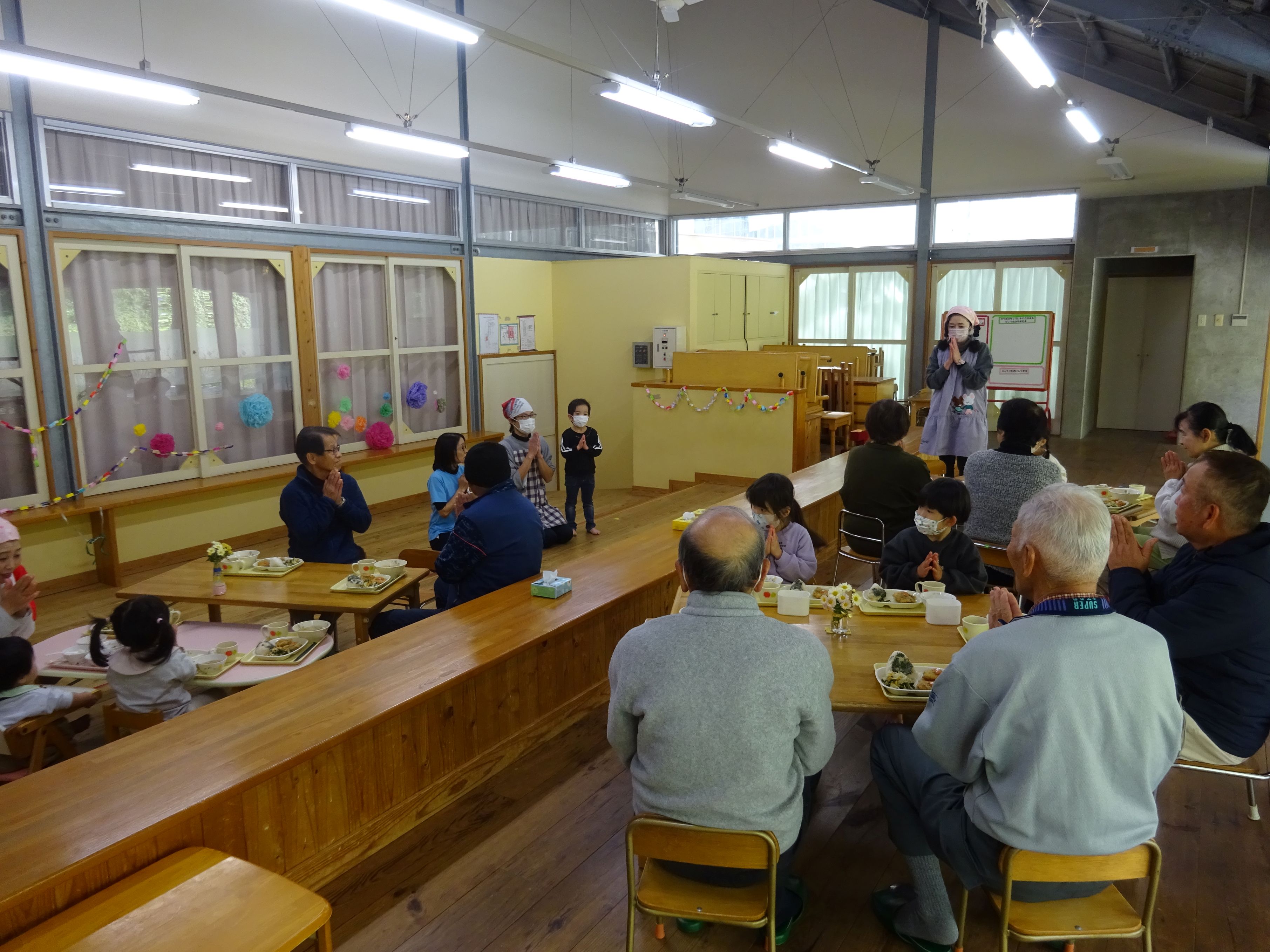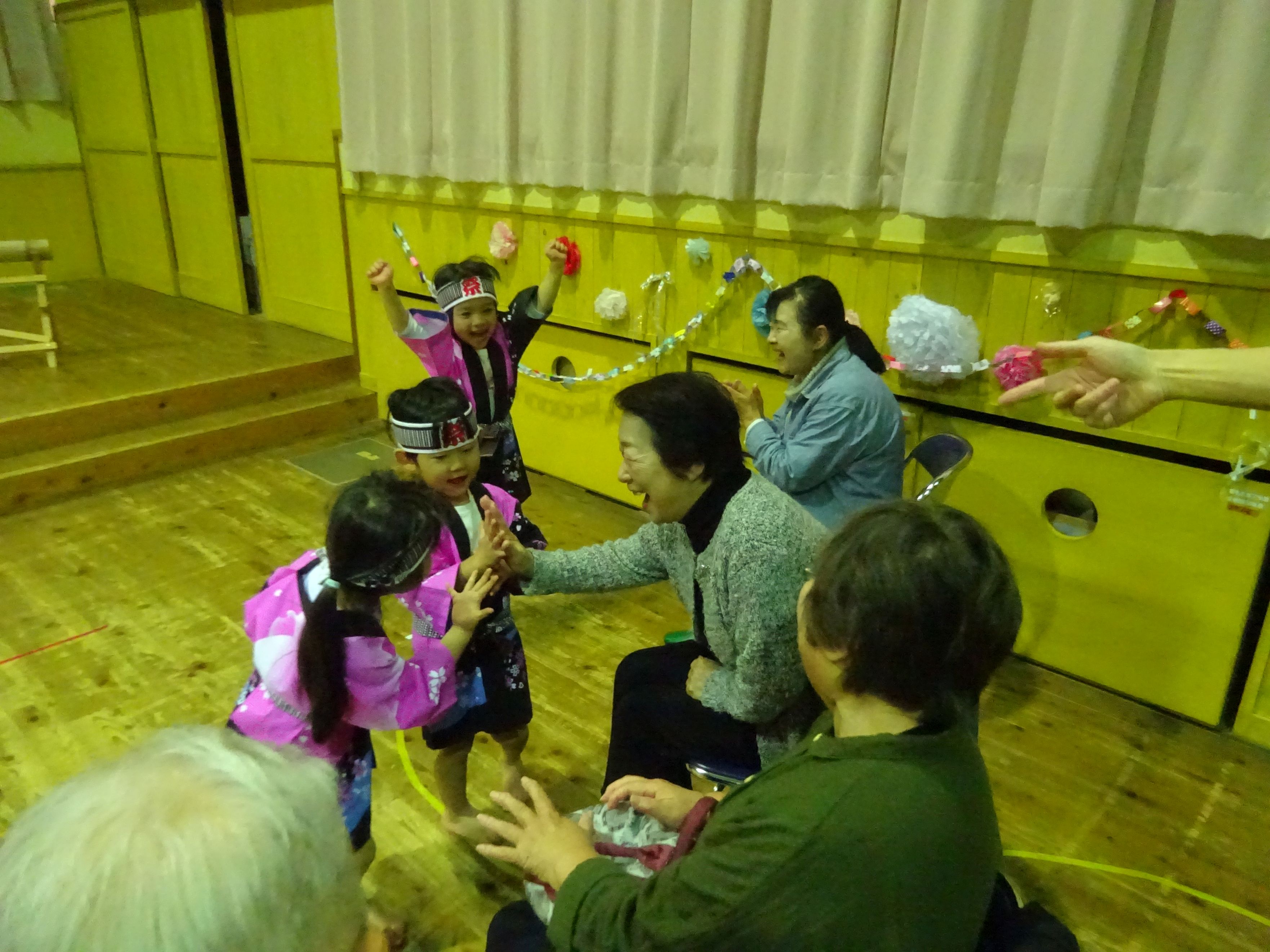 日頃お世話になっている地域の方と一緒に収穫パーティをしました。こども達は会場の飾りつけをして当日を楽しみに待っていました。パーティでは、感謝の気持ちを込めて竹太鼓と歌の発表をしたり、一緒に触れ合い遊びをしたりしました。地域の方の優しい笑顔と温かい眼差しにリラックスモードのこども達。普段通り、元気一杯の発表が出来、大きな拍手が起こりました。ジャンケン列車で触れ合う頃には遊戯室が大きな笑い声に包まれました。