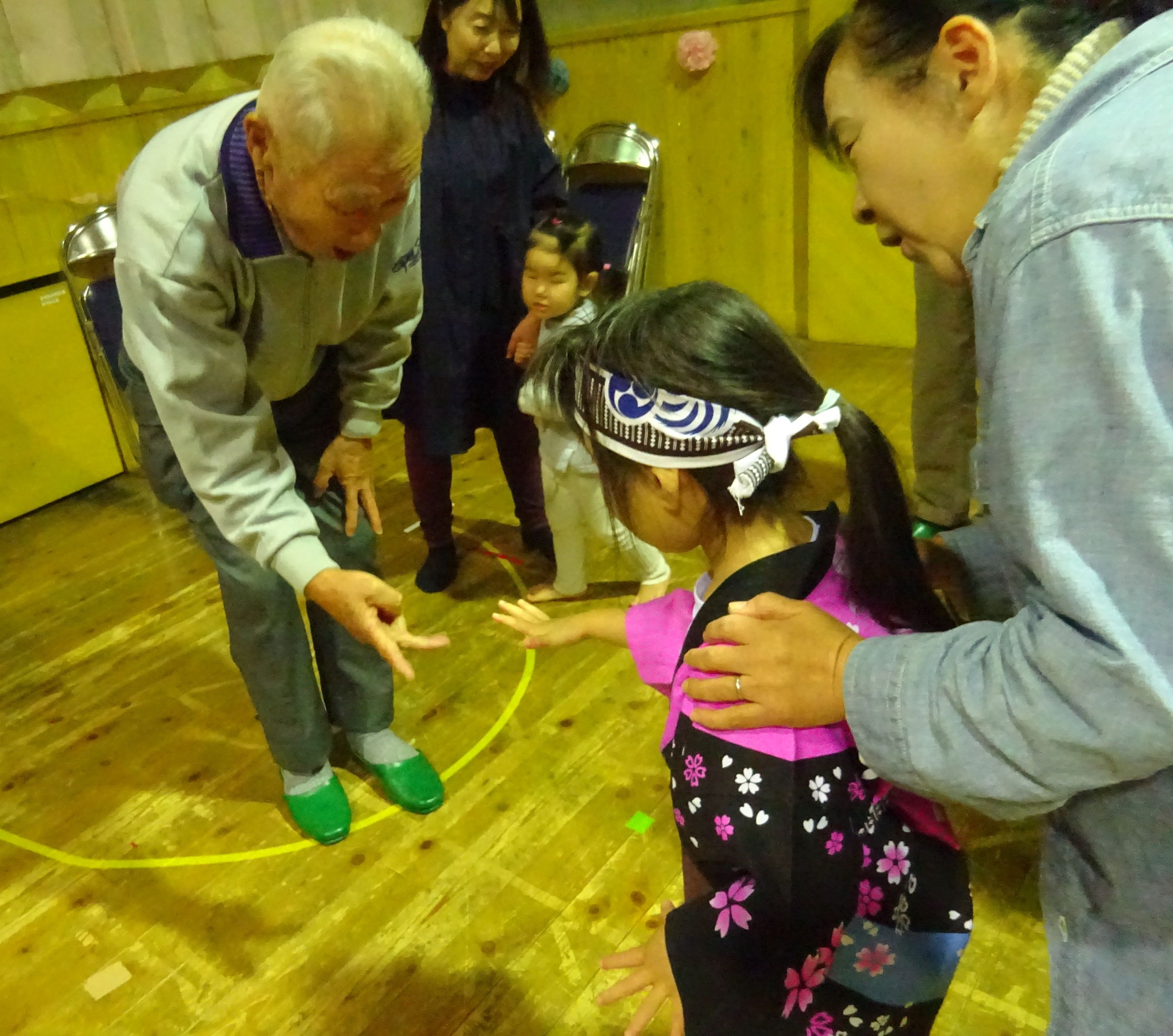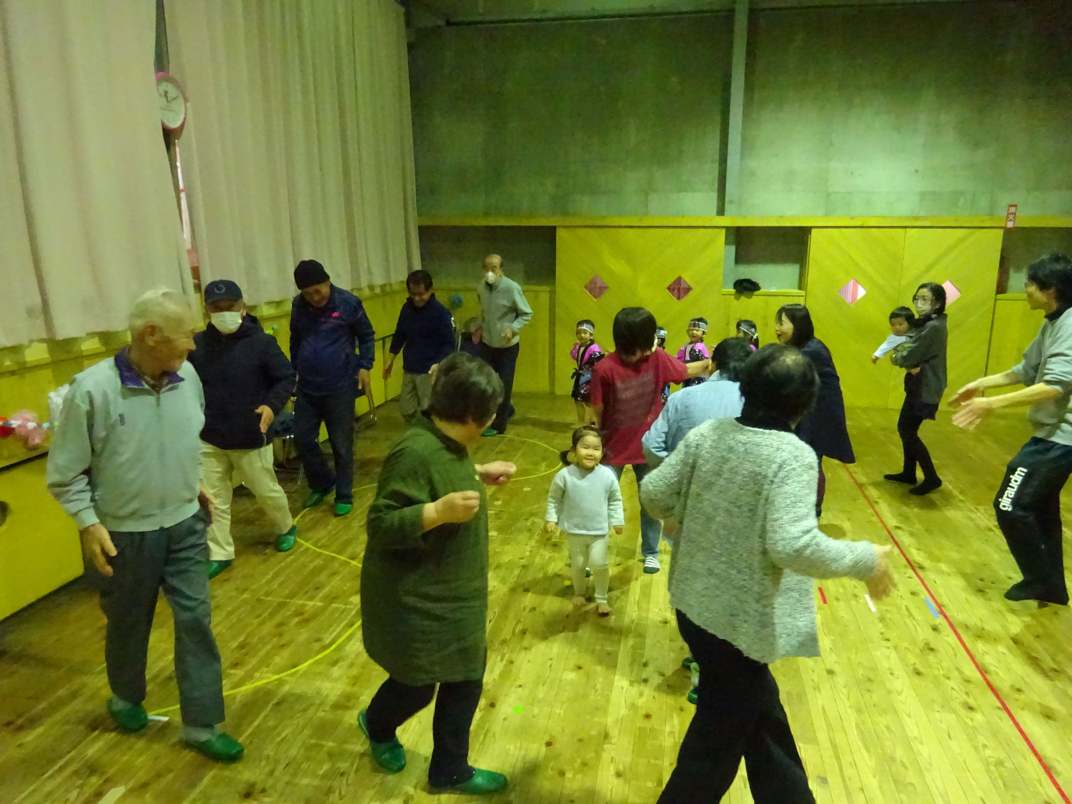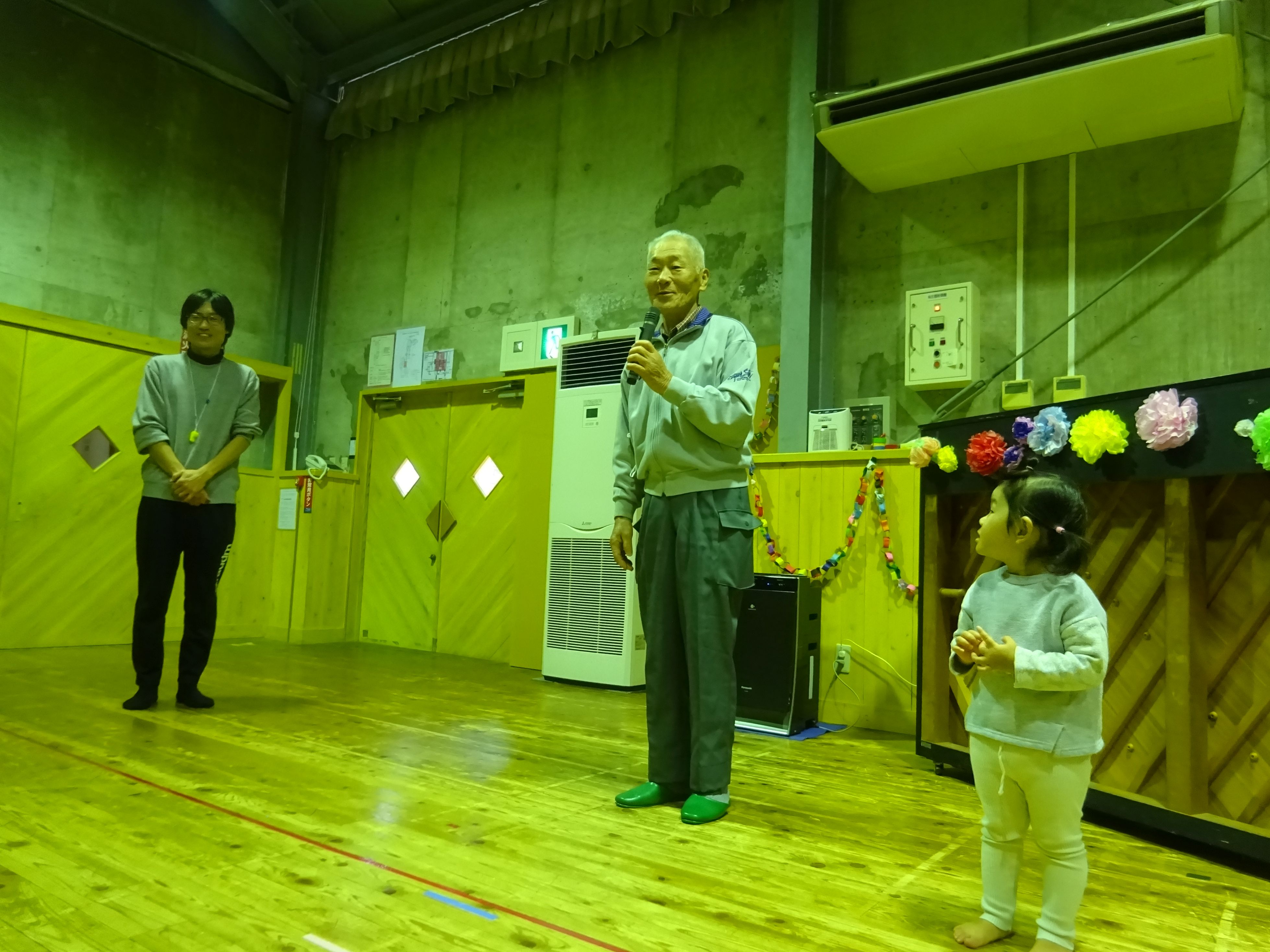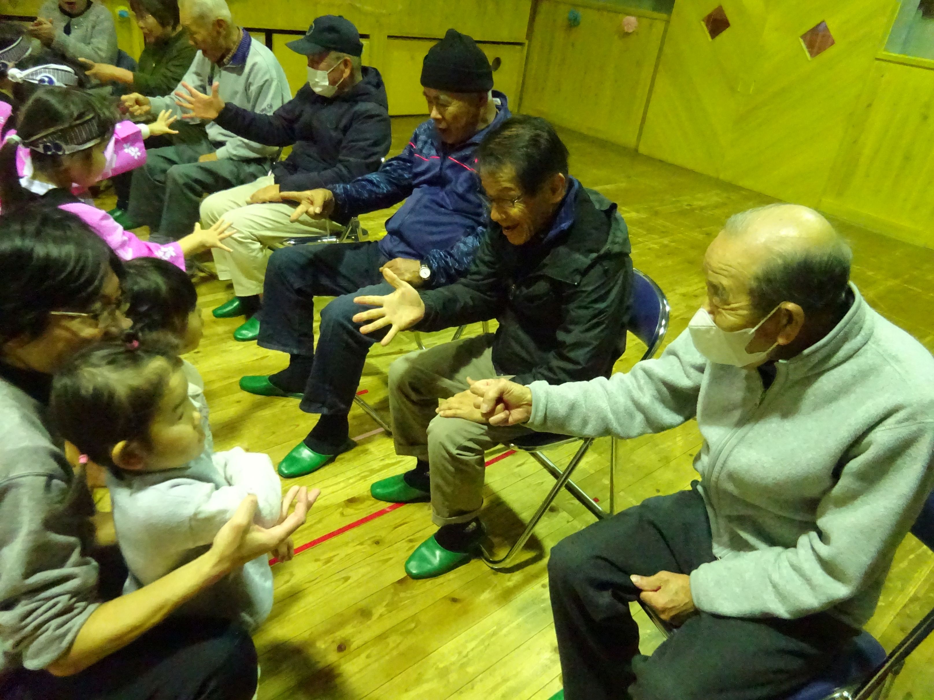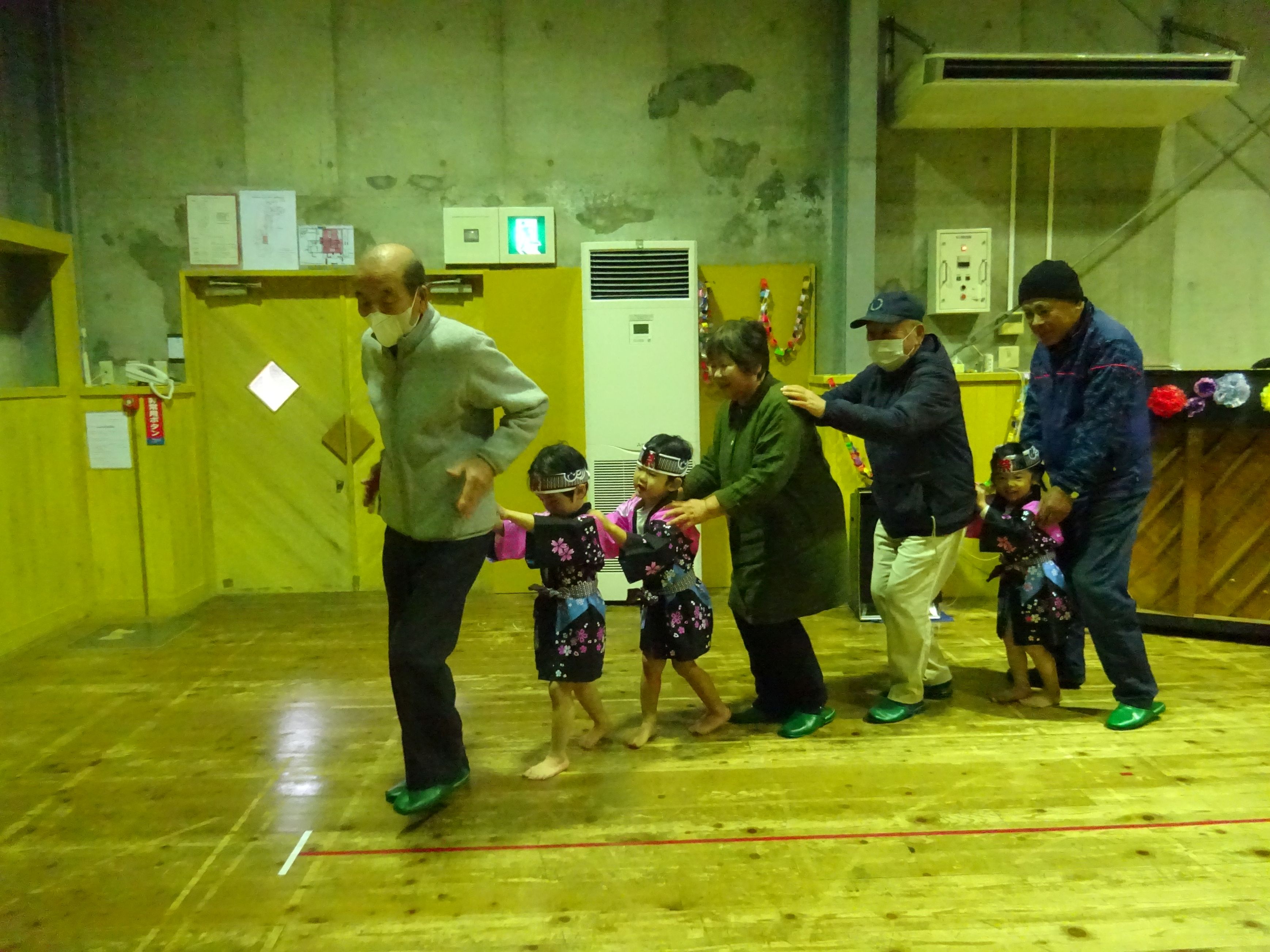日頃お世話になっている地域の方と一緒に収穫パーティをしました。こども達は会場の飾りつけをして当日を楽しみに待っていました。パーティでは、感謝の気持ちを込めて竹太鼓と歌の発表をしたり、一緒に触れ合い遊びをしたりしました。地域の方の優しい笑顔と温かい眼差しにリラックスモードのこども達。普段通り、元気一杯の発表が出来、大きな拍手が起こりました。ジャンケン列車で触れ合う頃には遊戯室が大きな笑い声に包まれました。