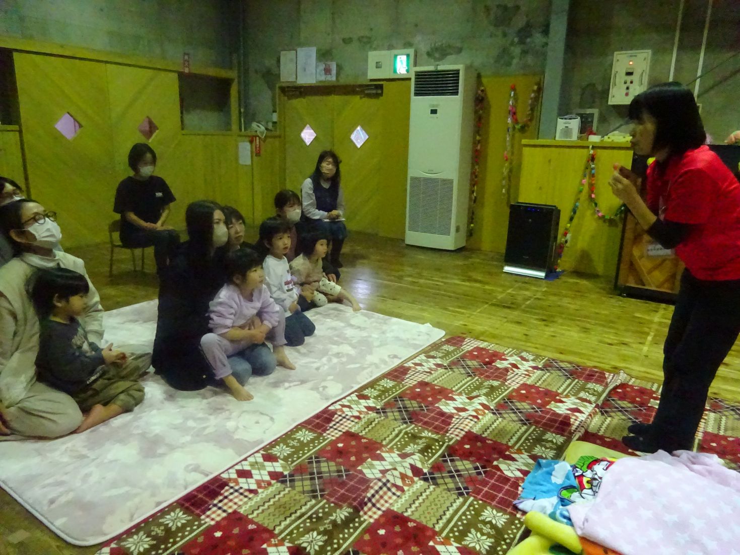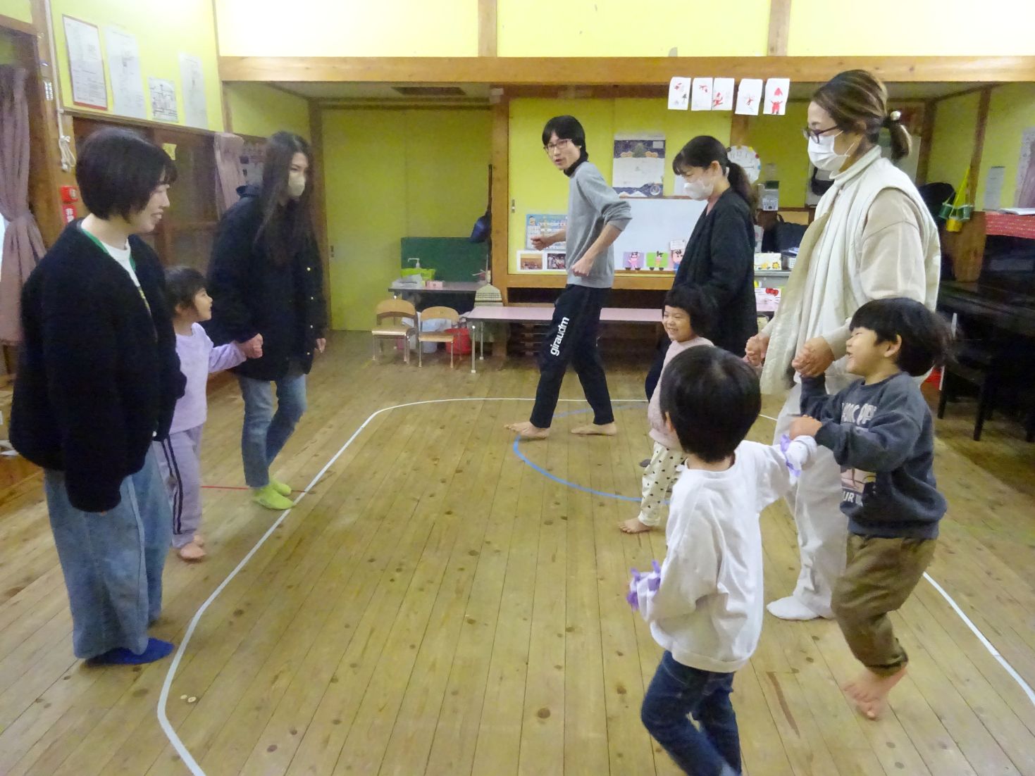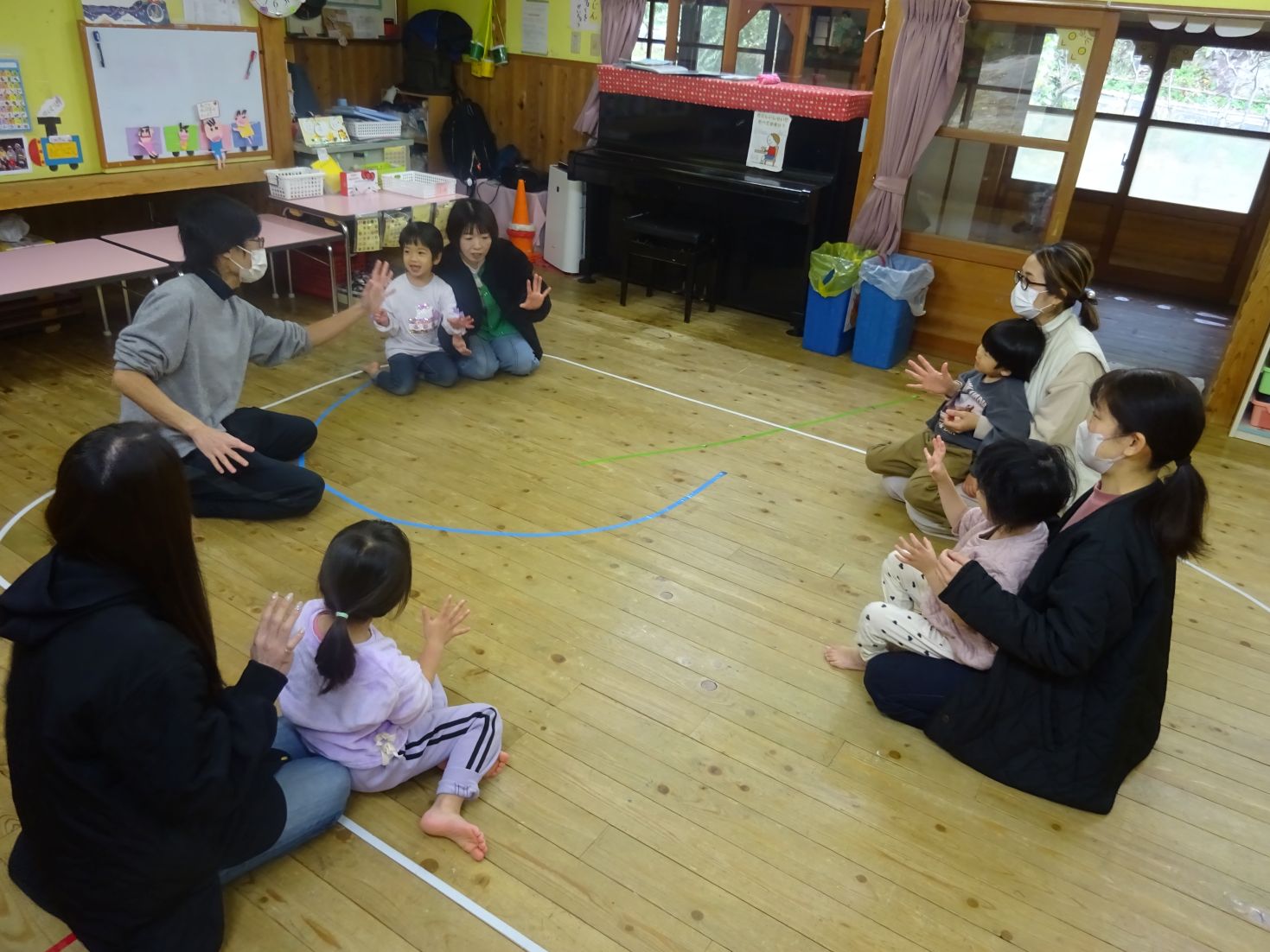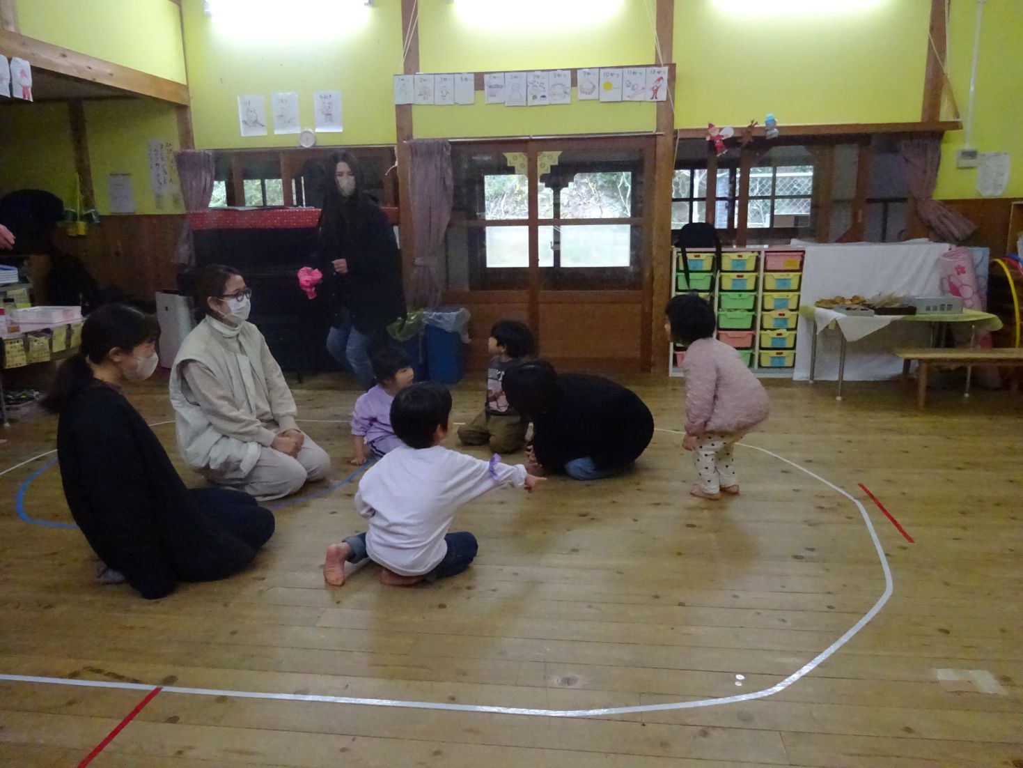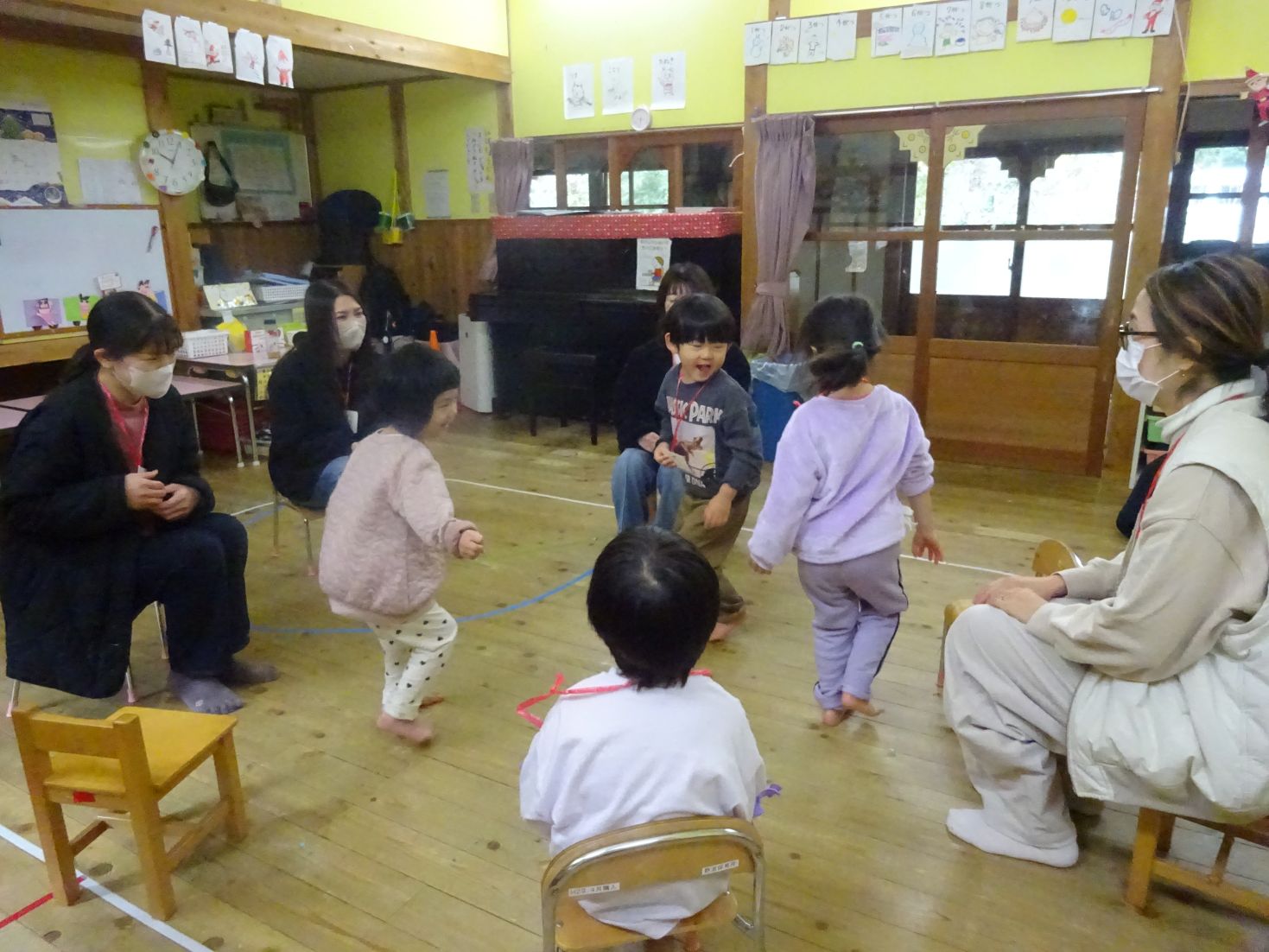 今日は“わくわくの森”で遊ぶ事を考えていましたが天候不良により、室内で『体つくり』(どんぐり体操、かけっこ、スキップ、ライオン歩き)②『朝の会』③『集団・伝承遊び』(フルーツバスケット、ハンカチ落とし、はないちもんめ など)を見たり参加したりしていただきました。こども達は普段の保育の様子を見てもらう事で落ち着いて活動を楽しみ、保護者の方にはありのままの生活の様子を見て頂きました。