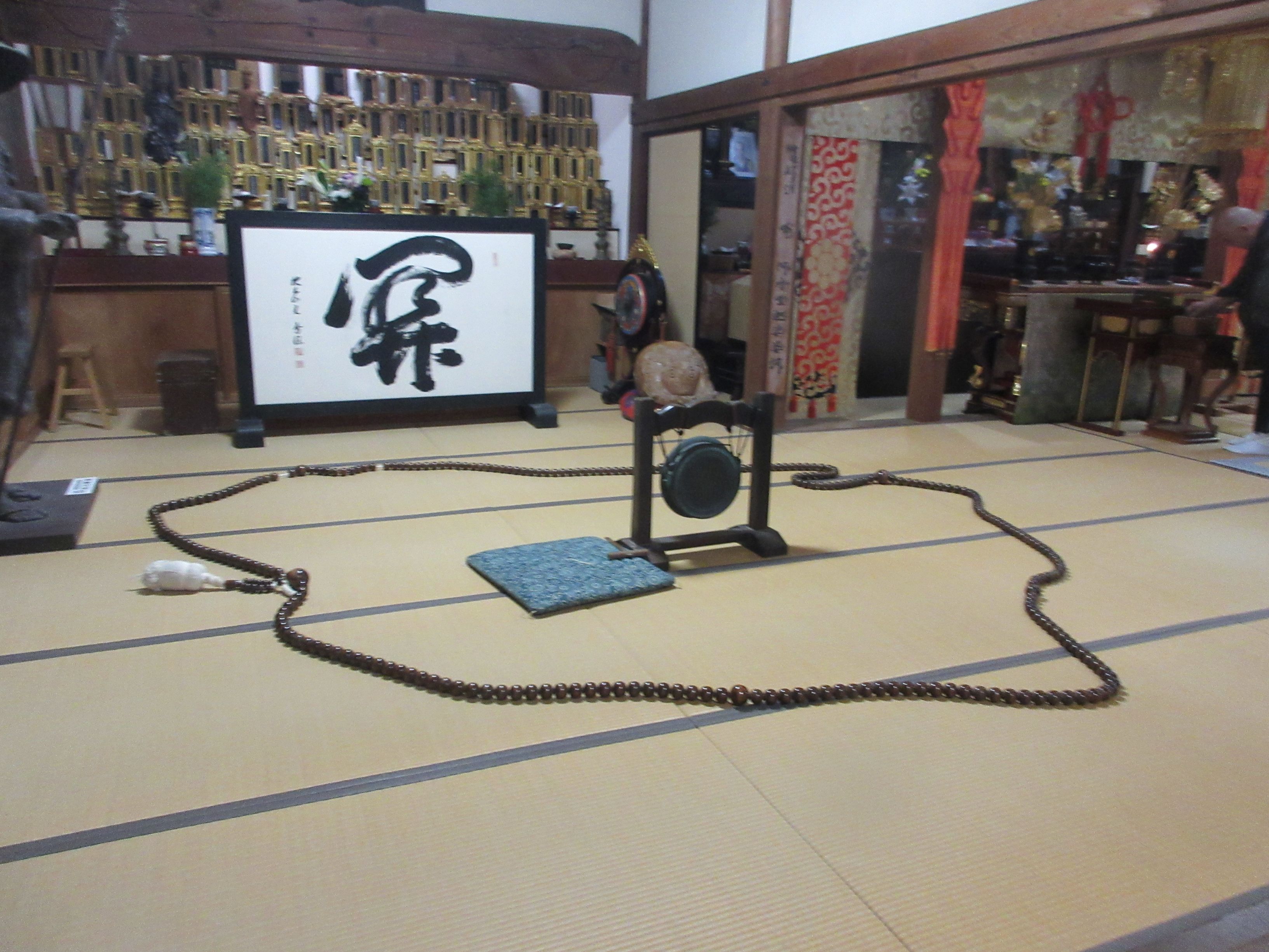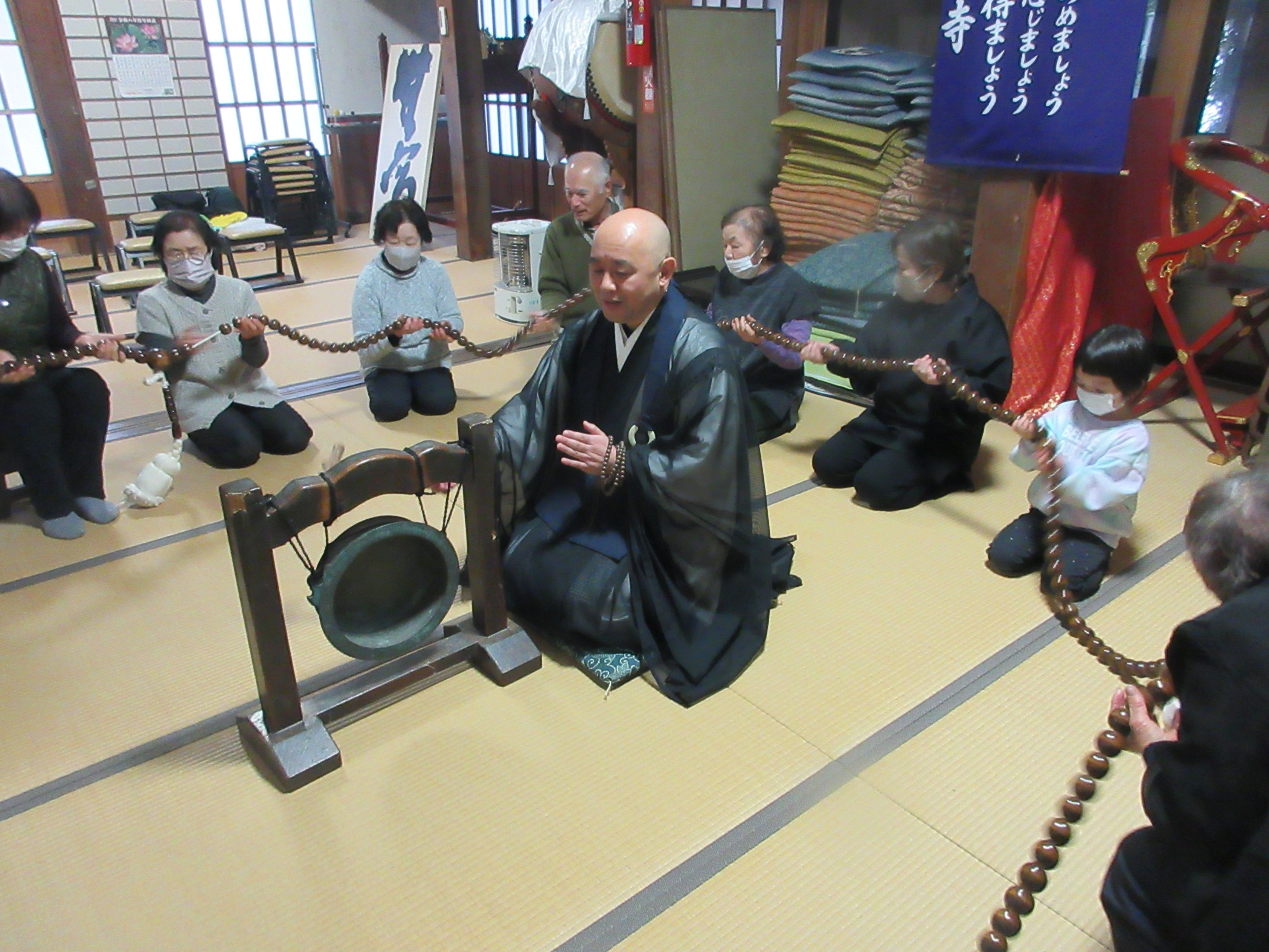 コミュニティバスに乗って見徳寺へ行き、地域の方と一緒に数珠繰りに参加させてもらいました。心配していた天気ですが、バスから降りて見徳寺に向かう頃には雨がやみ、元気に歩くことが出来ました。お寺の前では住職さんが温かく、笑顔で出迎えて下さいました。