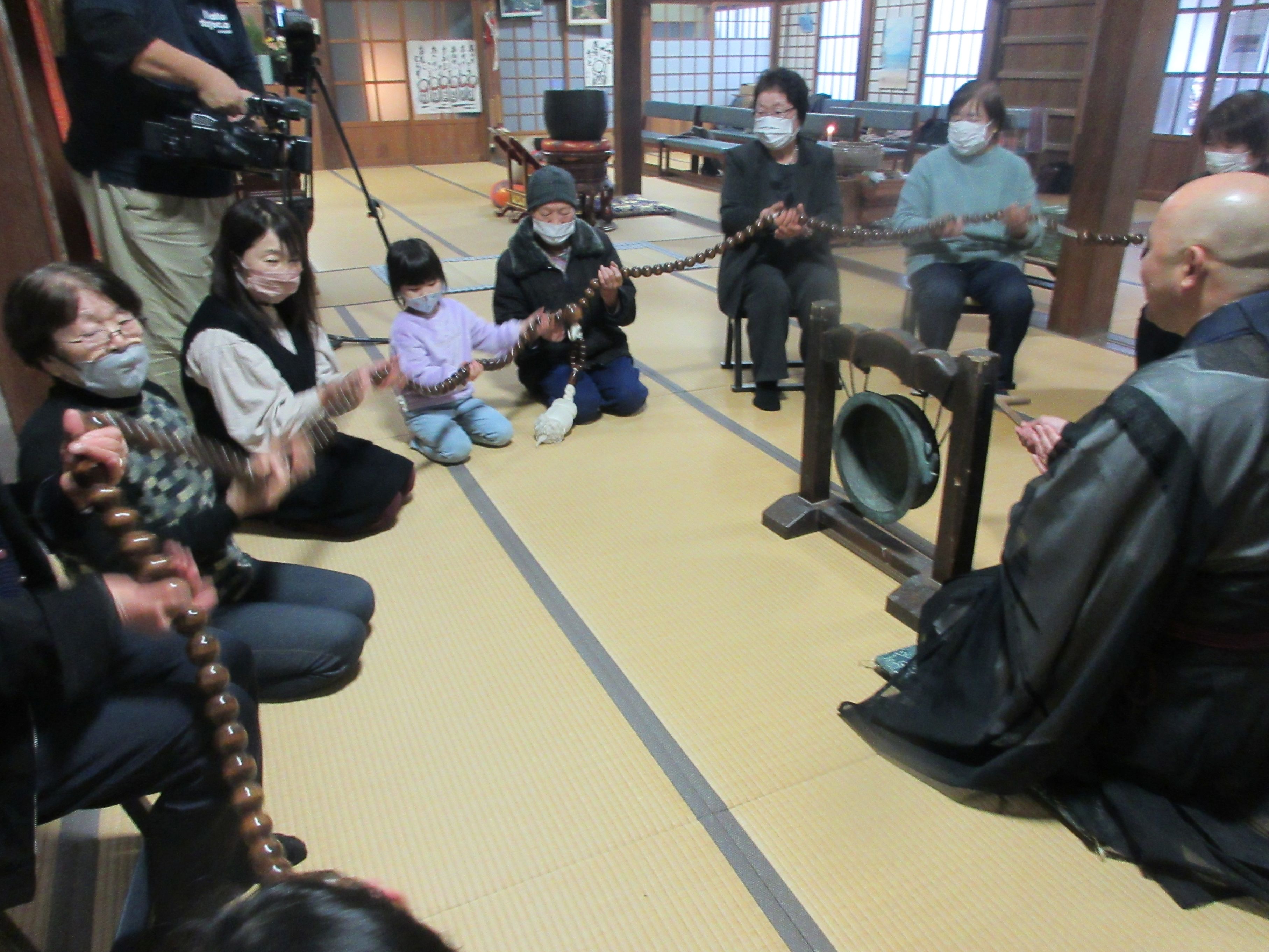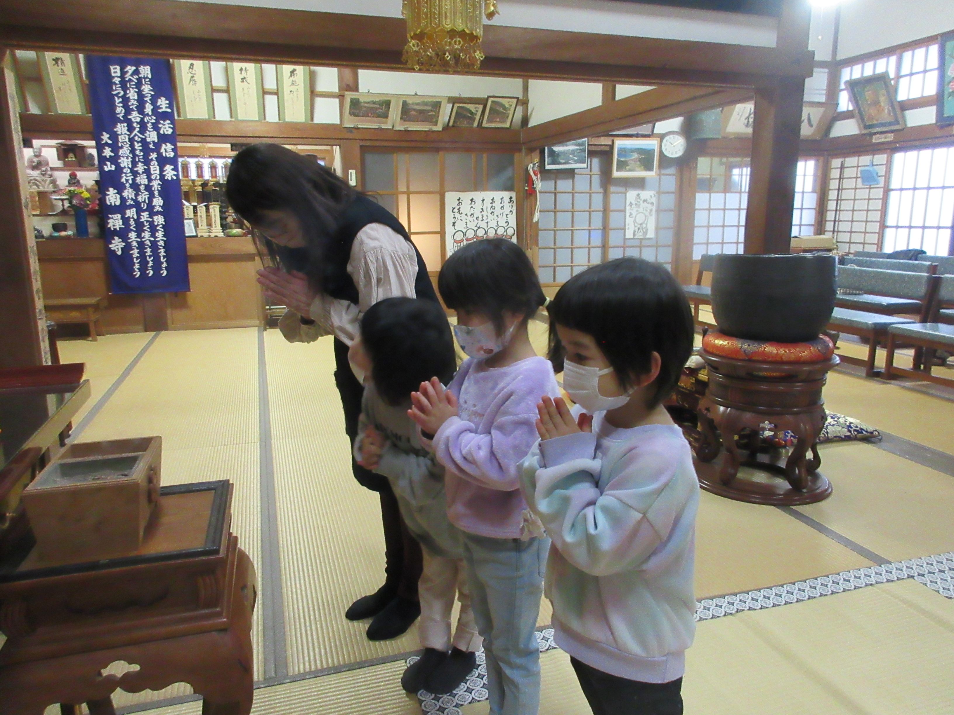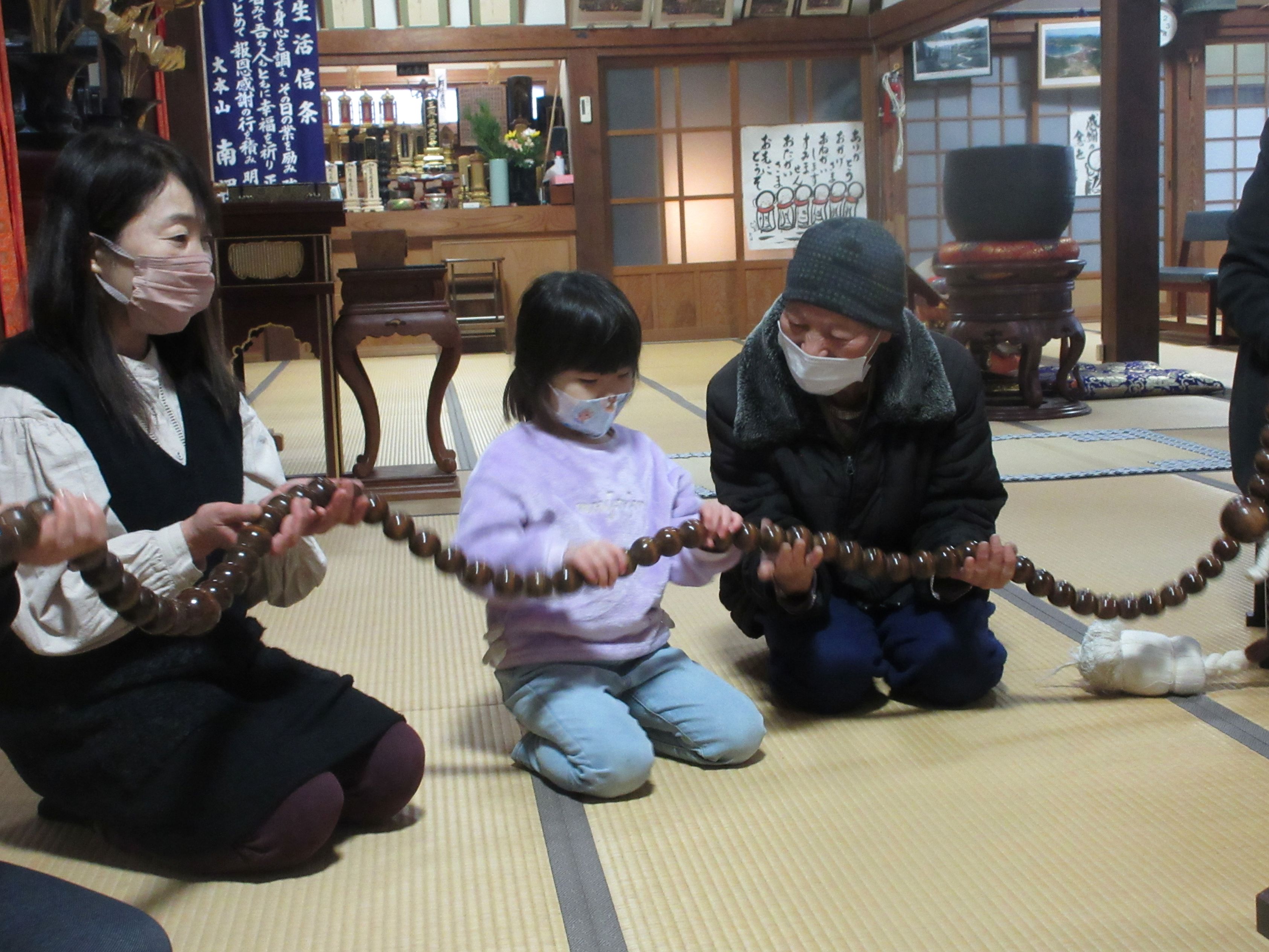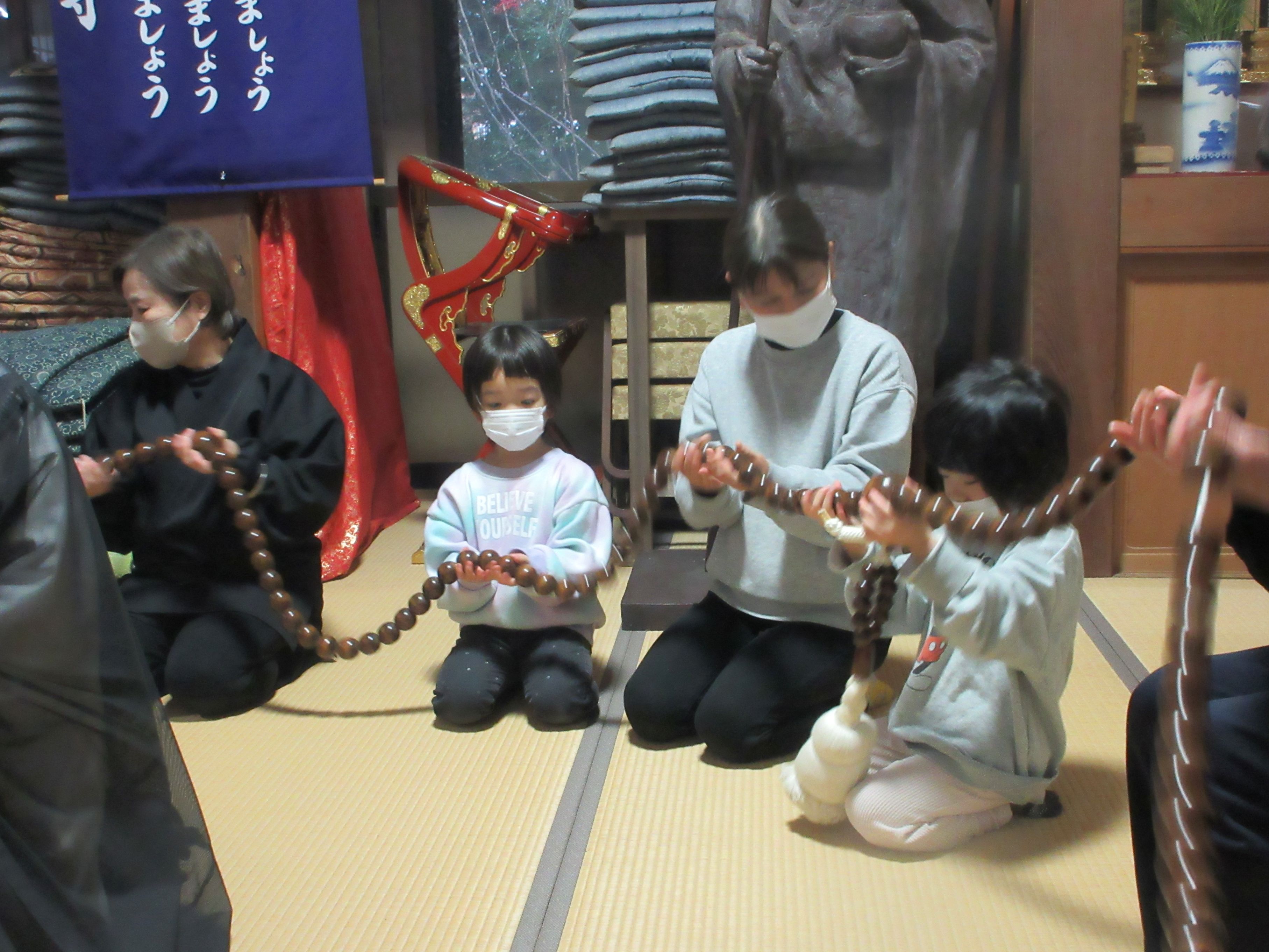 お寺に入ると、静かな雰囲気に始めは少し緊張した表情のこども達でしたが、一緒に輪になり数珠を回しながら「なんまいだ」と唱えることや、大きい数珠の玉が手元に来た時にはおでこに当てることなどを教えてもらい、優しい声かけに表情もいつの間にか和らいでいました。地域の方の温かさに包まれ、穏やかな気持ちになりました。地域行事として大切にされている数珠繰りをこれからも、こども達の心の中にしっかりと残していってもらいたいと思いました。