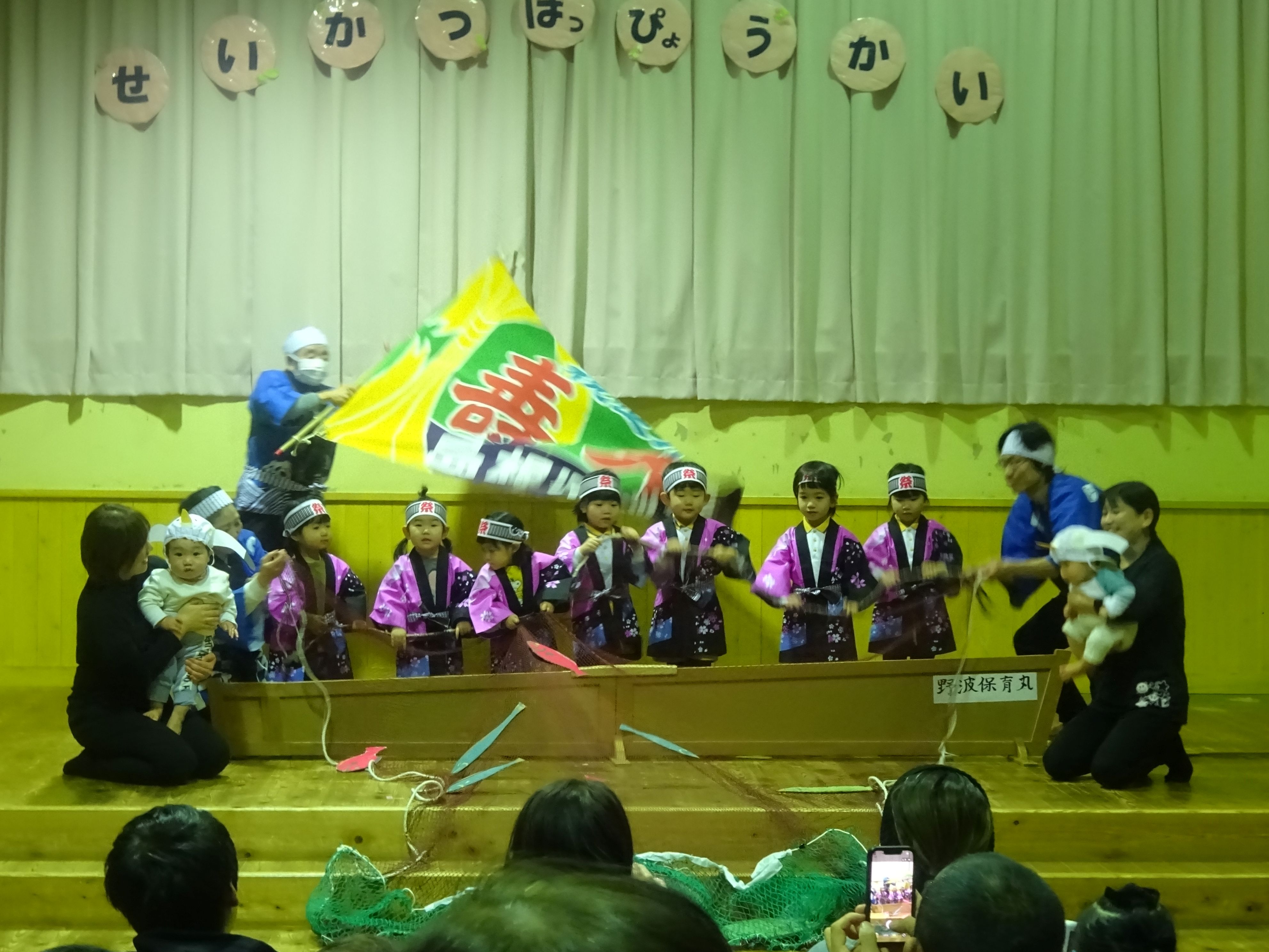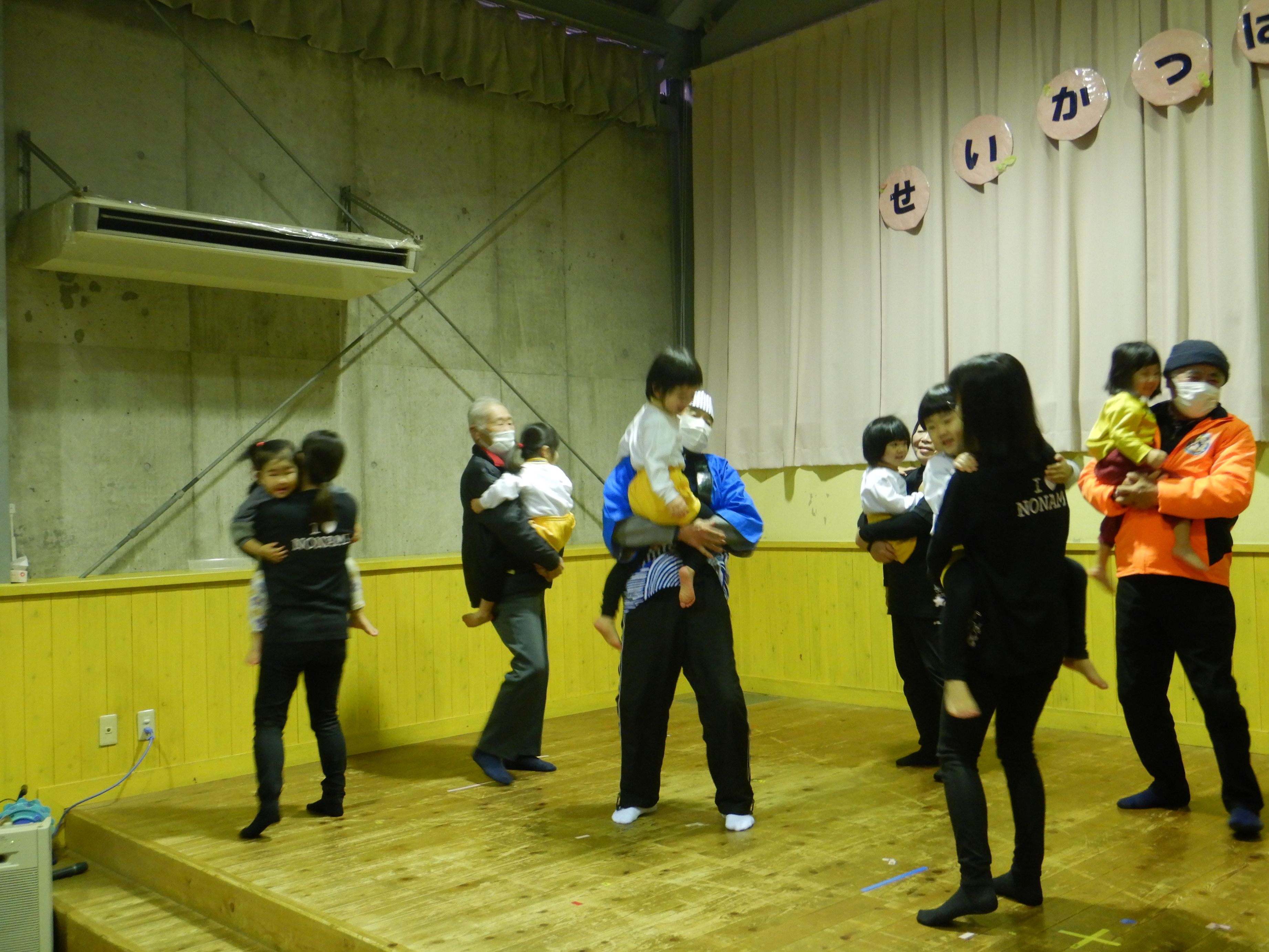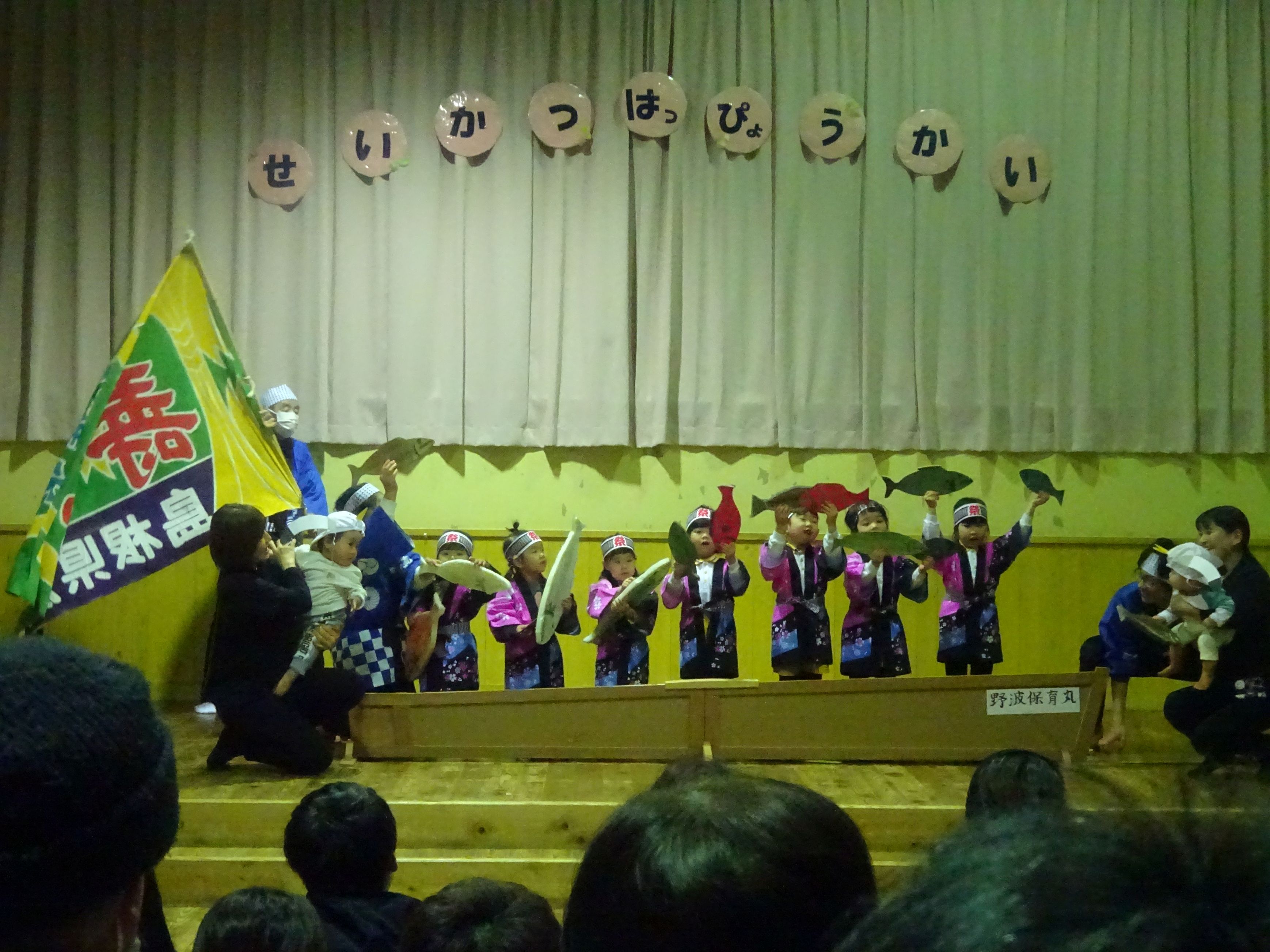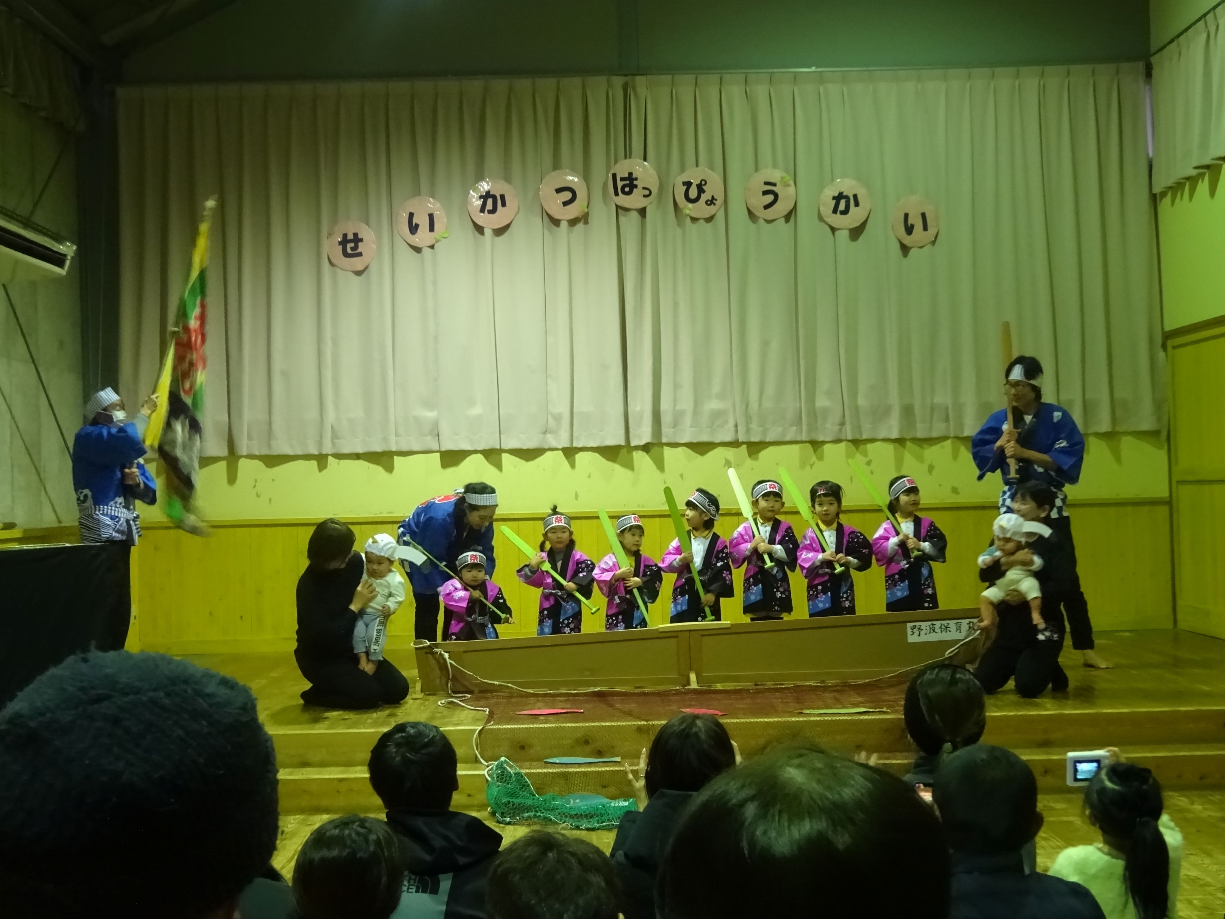 朝から冷たいみぞれが降る中でしたが、生活発表会を行いました。一人の欠席もなく、全員が元気に参加できたことが何より嬉しいことでした。こども達は本当に堂々と舞台に立ち、練習では見せたことのないようなアドリブも飛び出して職員を驚かせてくれました。オープニングの『大漁節』からフィナーレまで、一人一人が持っている力、全てを出し切った素敵な発表会になりました。フィナーレでは今までこども達に沢山の愛情を注ぎ、様々なことを教えてくださった地域の方々との思い出をスライドショーで振り返りました。スライドショーの後は地域講師さんにもステージに上がっていただき、一緒にふれあい歌を楽しみました。最後は会場の全員で輪になって『のなみほいくしょのうた』を歌い、野波らしい温かな雰囲気の中で発表会を終えました。