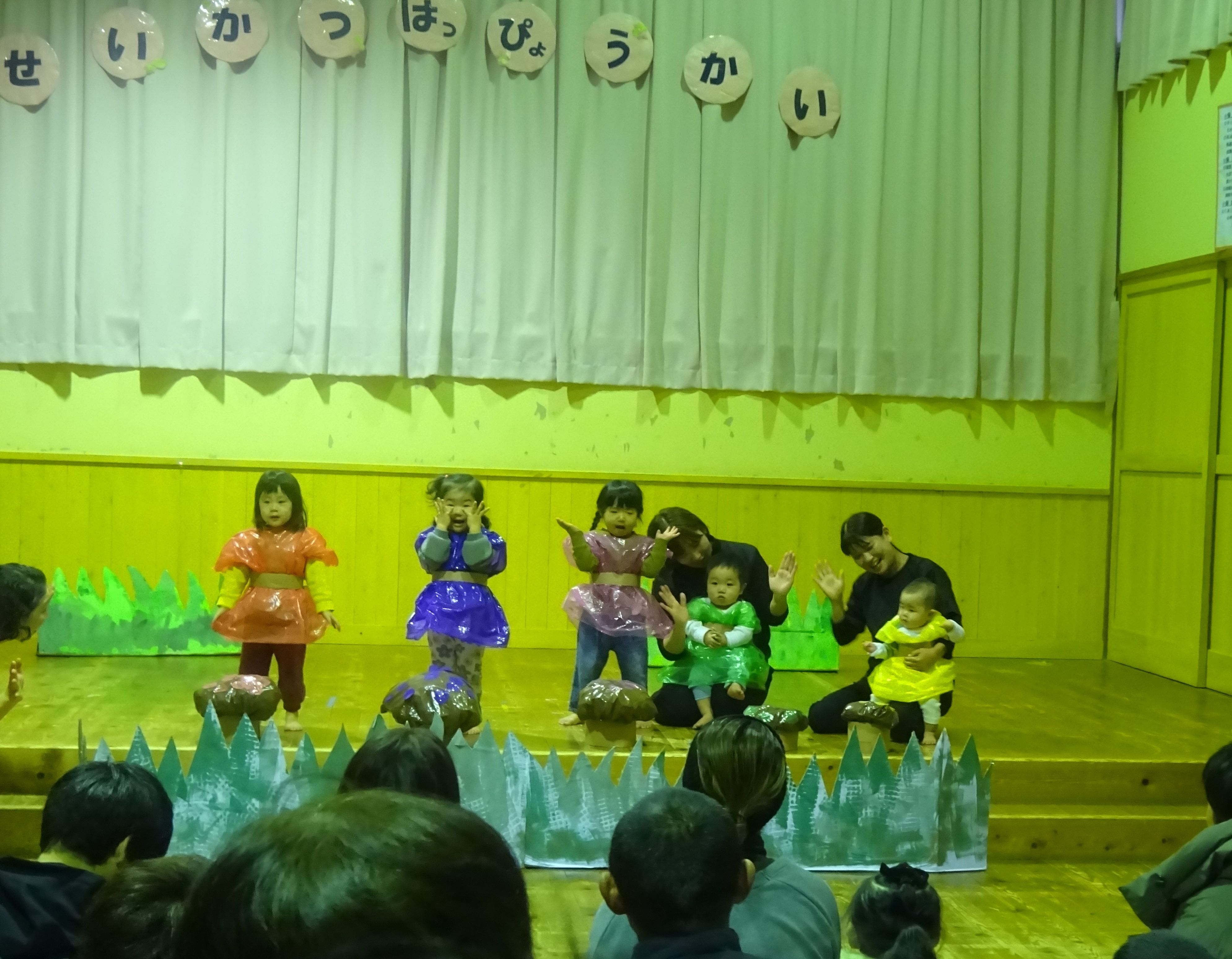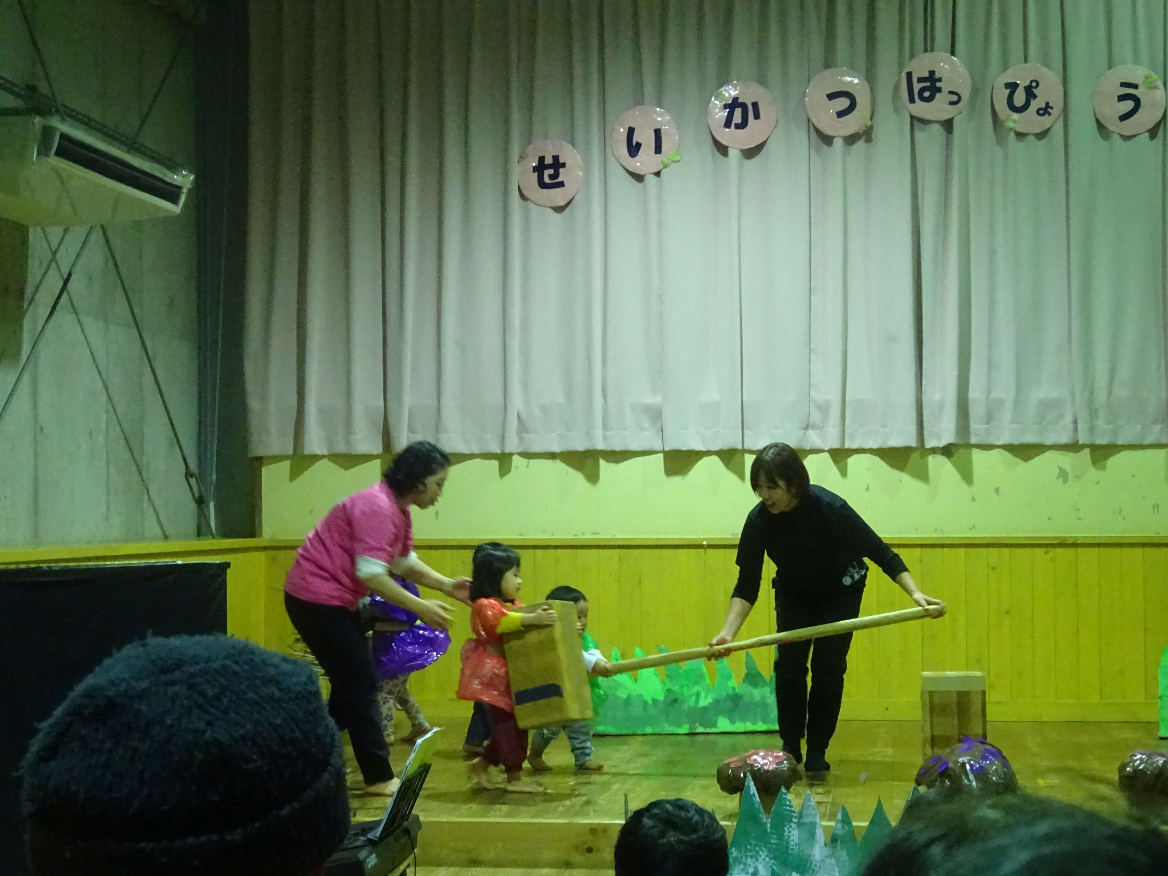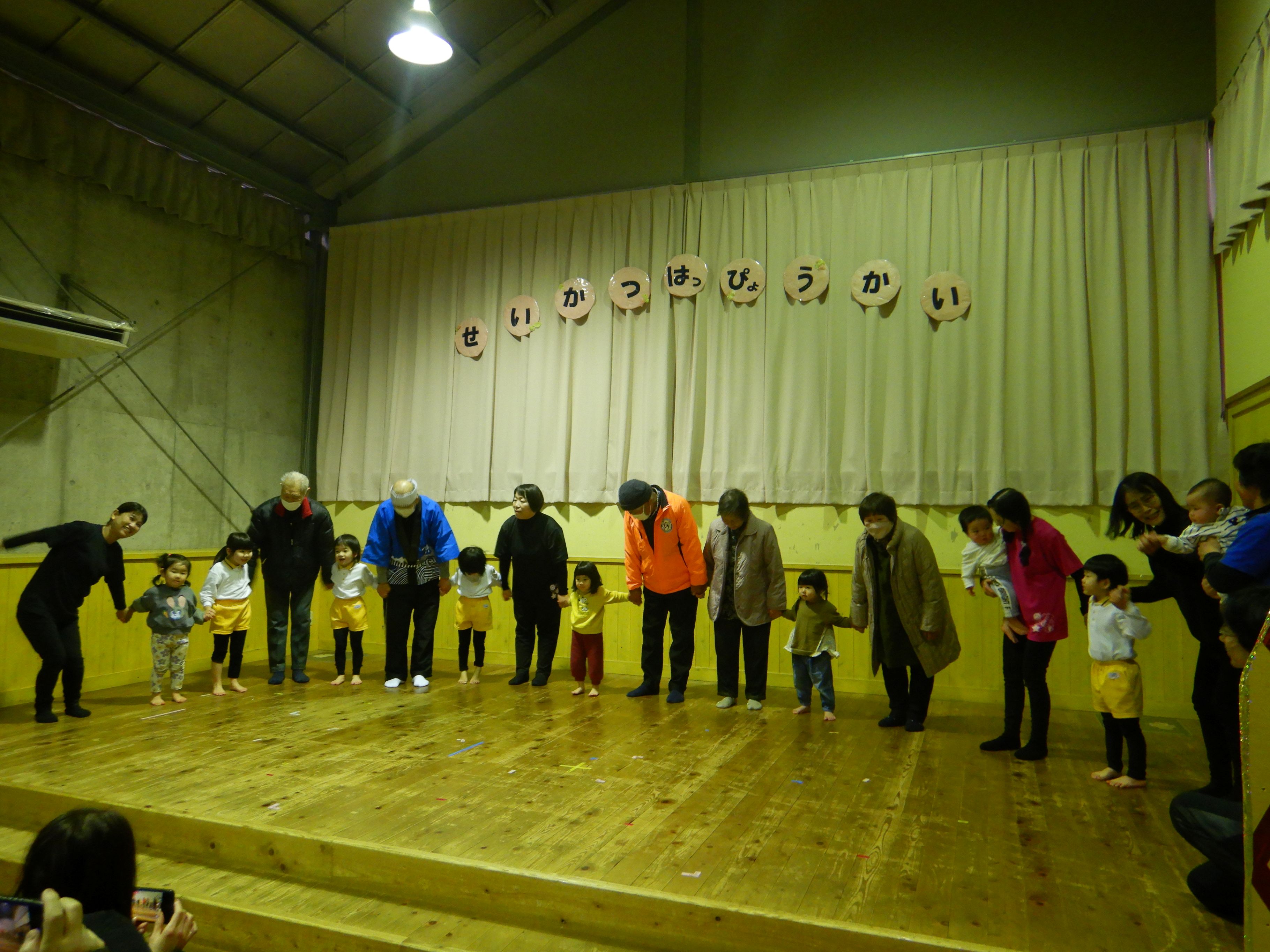 朝から冷たいみぞれが降る中でしたが、生活発表会を行いました。一人の欠席もなく、全員が元気に参加できたことが何より嬉しいことでした。こども達は本当に堂々と舞台に立ち、練習では見せたことのないようなアドリブも飛び出して職員を驚かせてくれました。オープニングの『大漁節』からフィナーレまで、一人一人が持っている力、全てを出し切った素敵な発表会になりました。フィナーレでは今までこども達に沢山の愛情を注ぎ、様々なことを教えてくださった地域の方々との思い出をスライドショーで振り返りました。スライドショーの後は地域講師さんにもステージに上がっていただき、一緒にふれあい歌を楽しみました。最後は会場の全員で輪になって『のなみほいくしょのうた』を歌い、野波らしい温かな雰囲気の中で発表会を終えました。