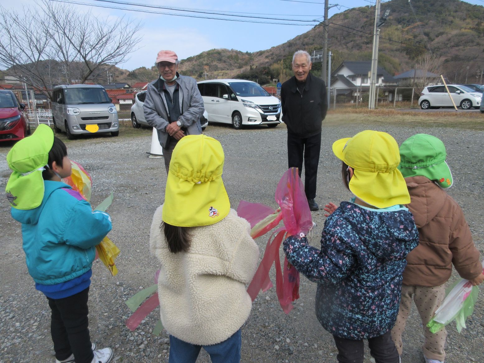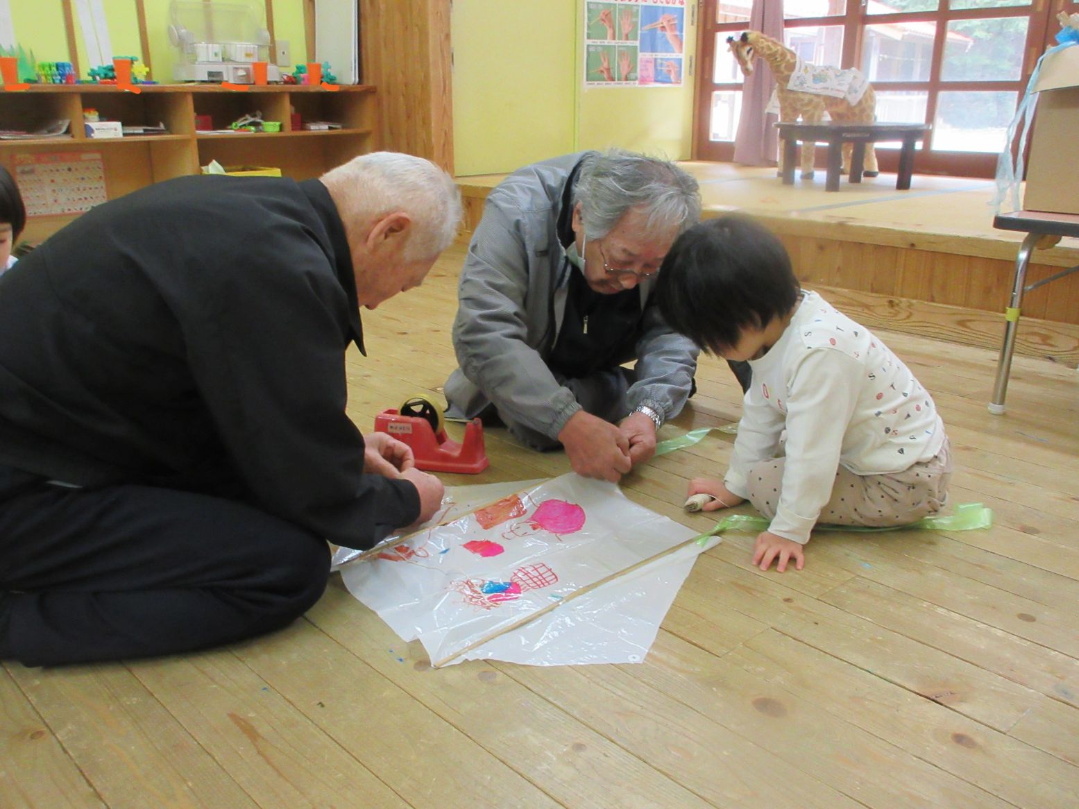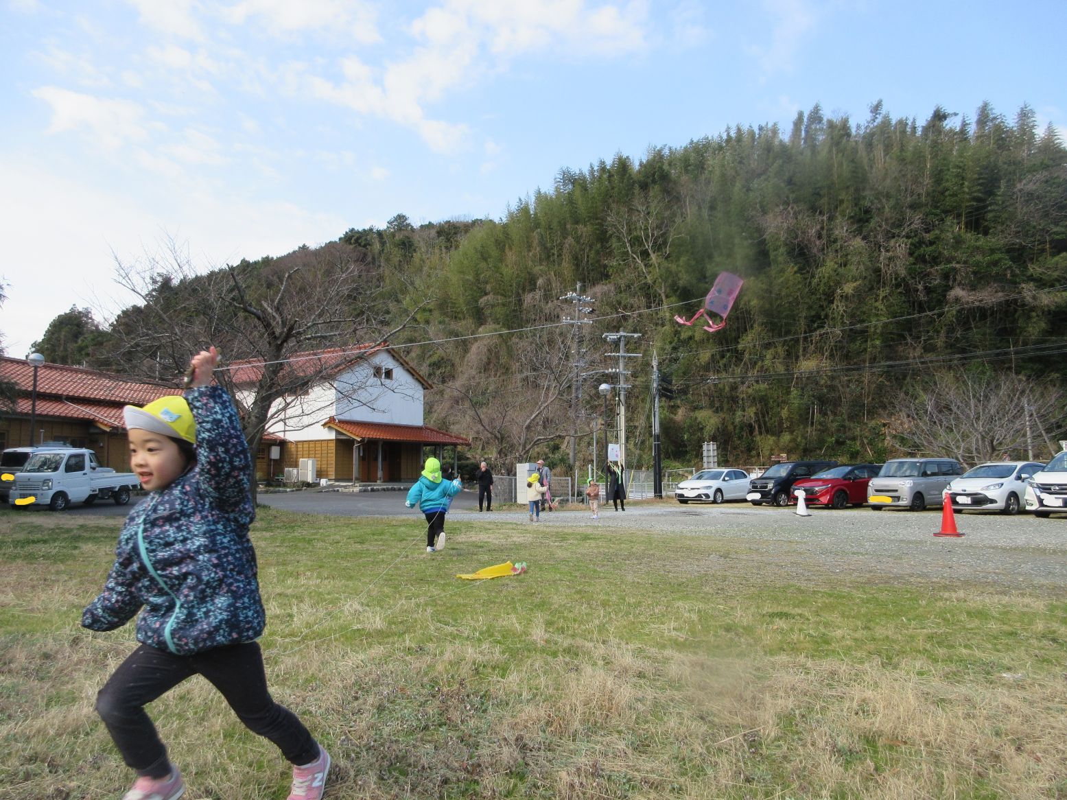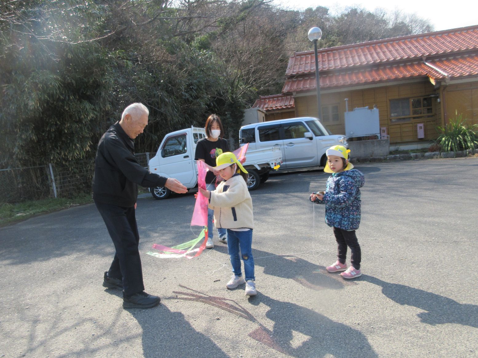 出来上がった凧は安全管理をしながら保育所の駐車場で揚げました。今日の風は色々な方角から吹いており風を捕まえることが難しかったですが、凧作り・凧揚げ名人のおじちゃん達が「向こうに向かって、走ってごらん」とアドバイスして下さり、その通りに走ると見事に揚がりました。最後は、凧の片付け方まで丁寧に教えてくださいました。