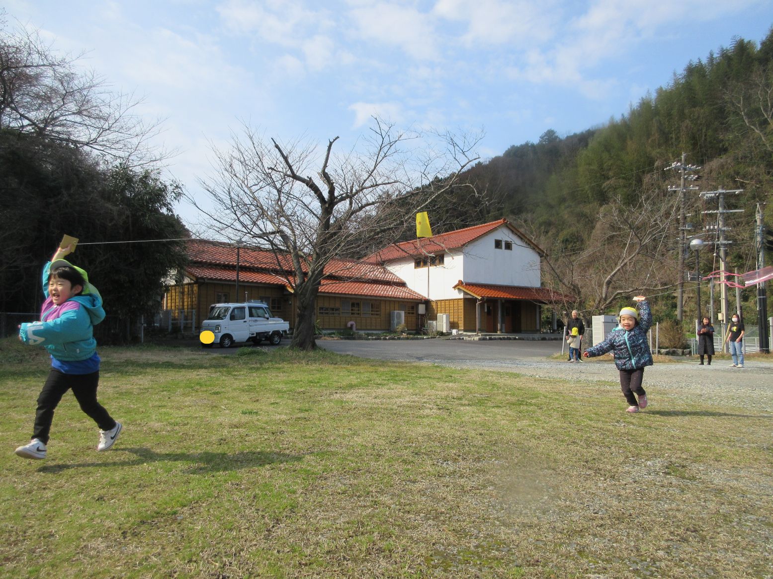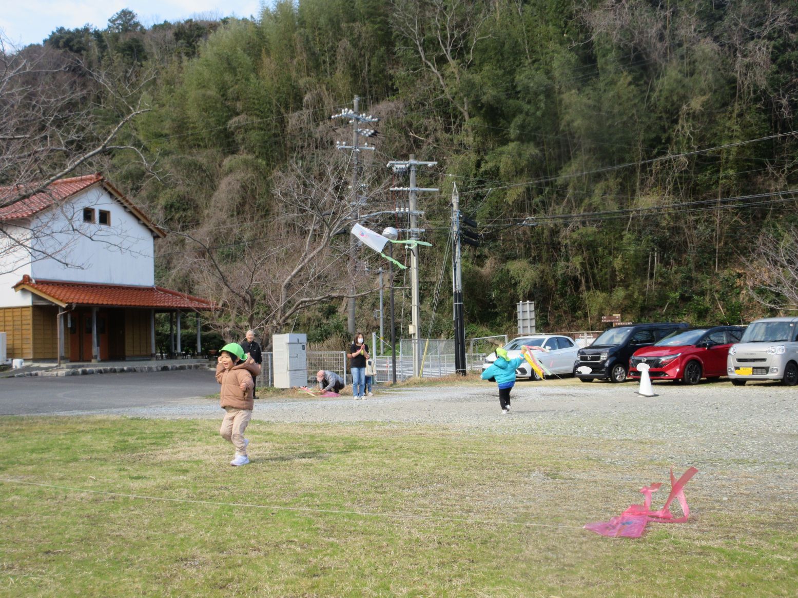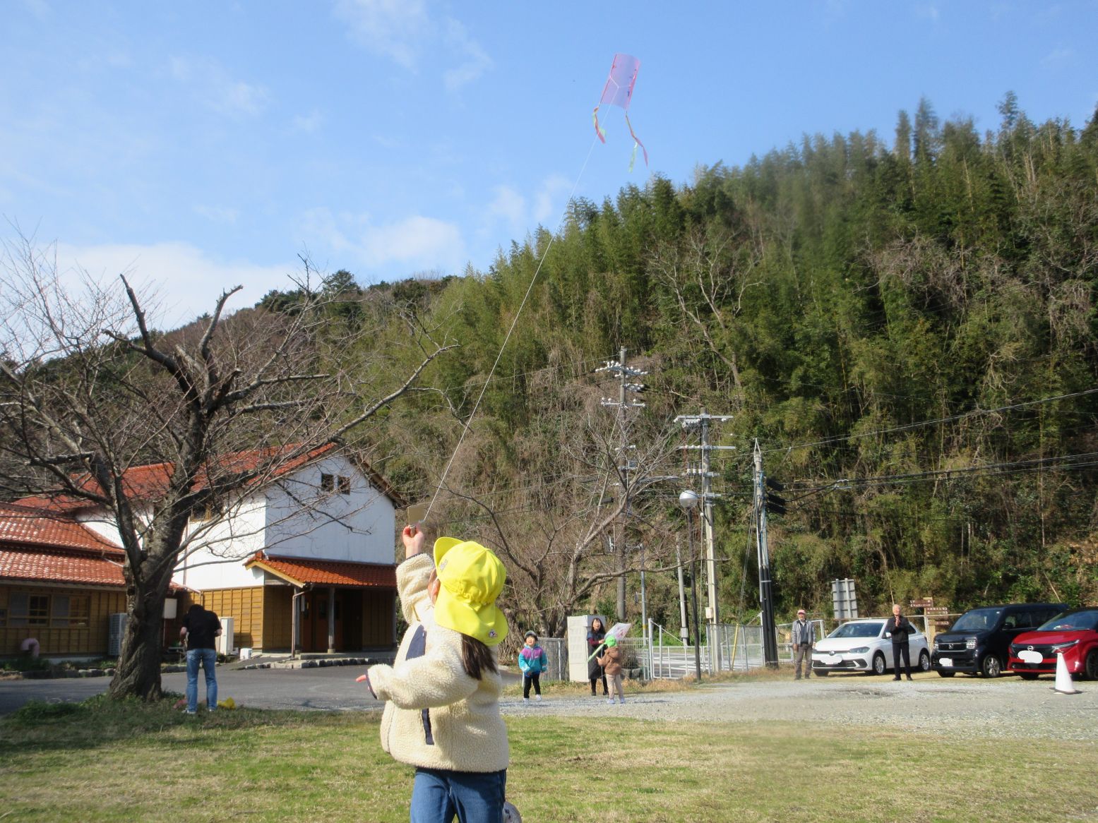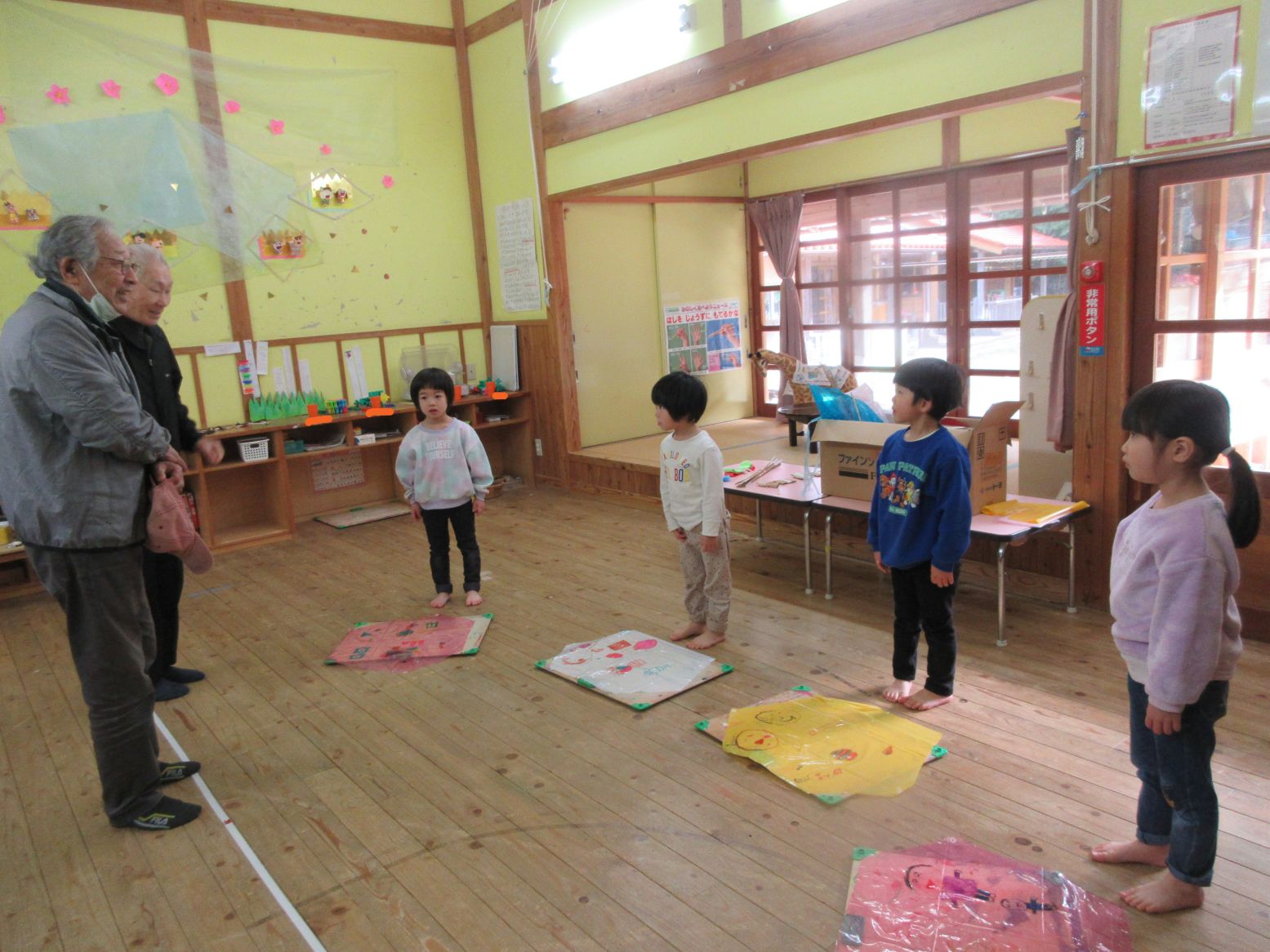 出来上がった凧は安全管理をしながら保育所の駐車場で揚げました。今日の風は色々な方角から吹いており風を捕まえることが難しかったですが、凧作り・凧揚げ名人のおじちゃん達が「向こうに向かって、走ってごらん」とアドバイスして下さり、その通りに走ると見事に揚がりました。最後は、凧の片付け方まで丁寧に教えてくださいました。