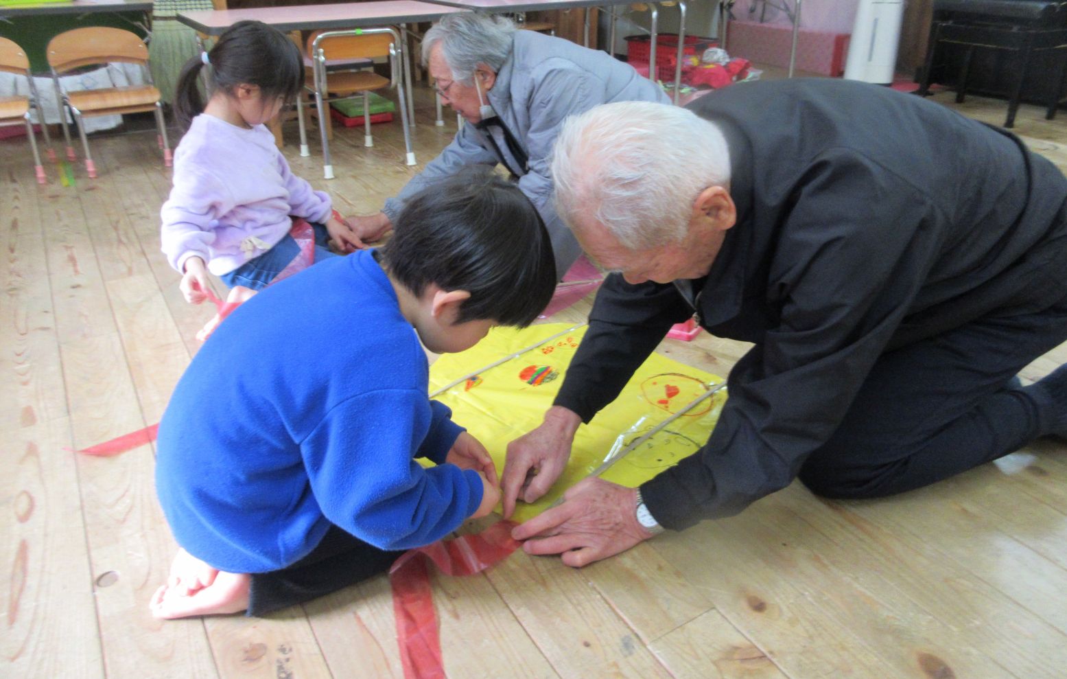 竹ひごを真っすぐに付けることや、凧の足は飛ぶ時にバランスをとる重要な役割をしていることを教わりました。丁寧に優しく教えてくださり、おじちゃん達と楽しく作りました。