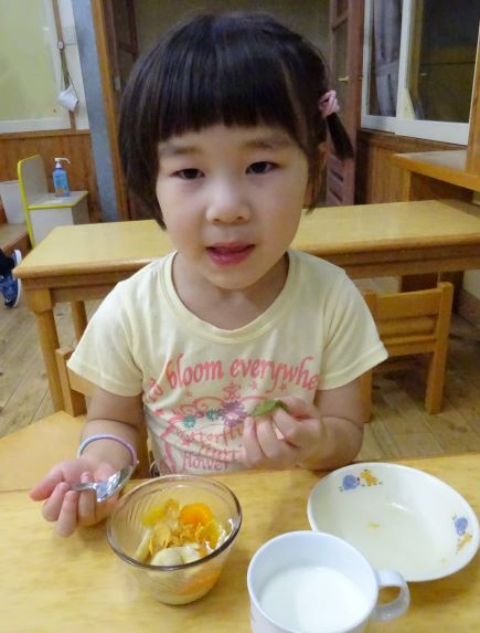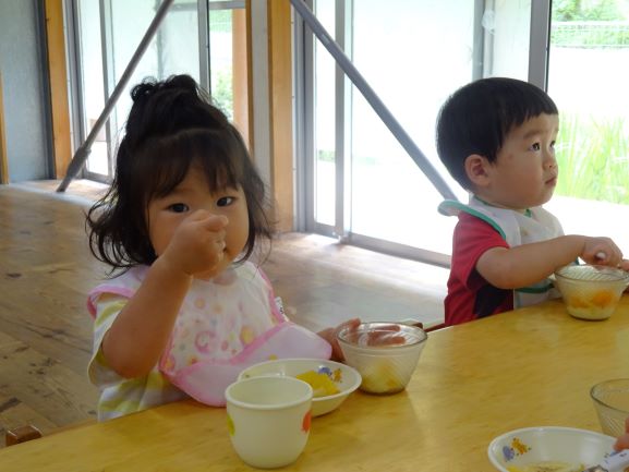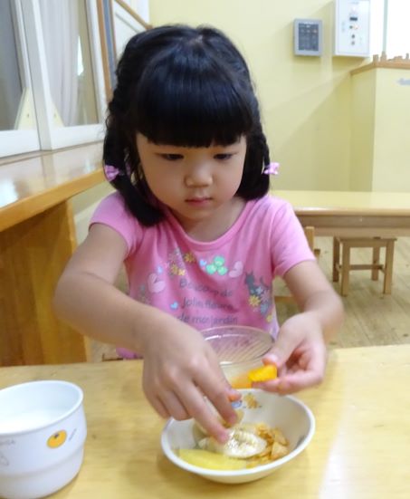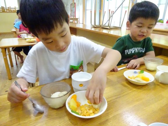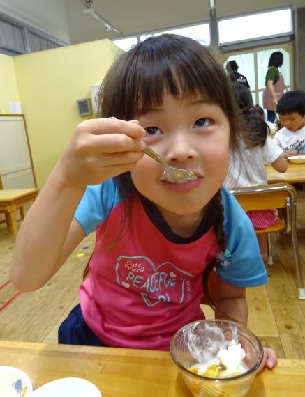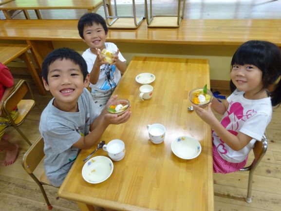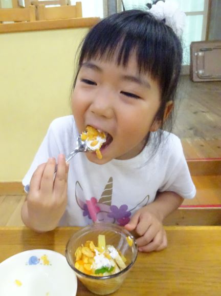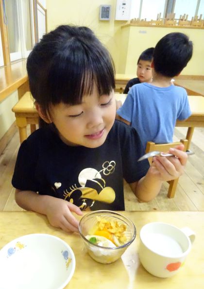 7月9日、この日は午前中に、夏祭りごっこを楽しんだ子ども達。お昼寝後のお楽しみがもう一つありました。この日のおやつは、フルーツパフェでした。
