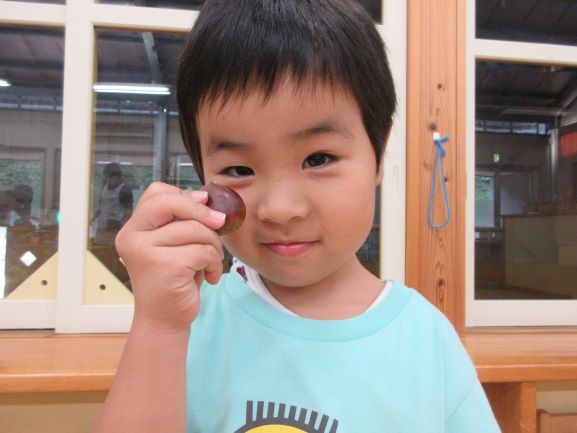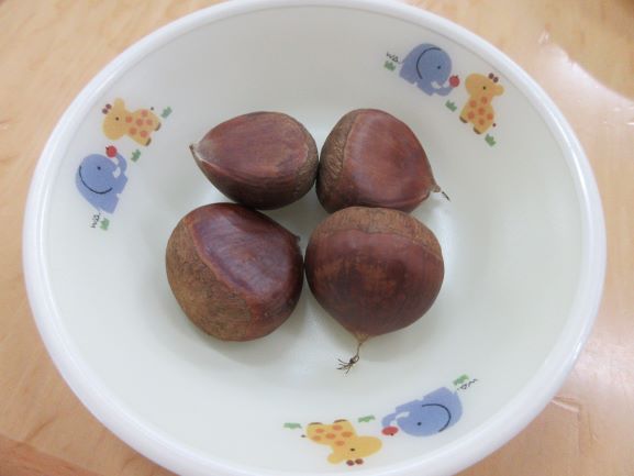 前日に、子ども達に栗を見せると、「栗拾いしたことあるよ~」「栗のトゲトゲは見たことあるけど、中を見たのは、はじめてだよ」と教えてくれました。ほし・ゆめの子ども達は、「大きな栗の木の下での歌だね」と教えると、身振り手振り口ずさむ子もいました。