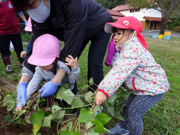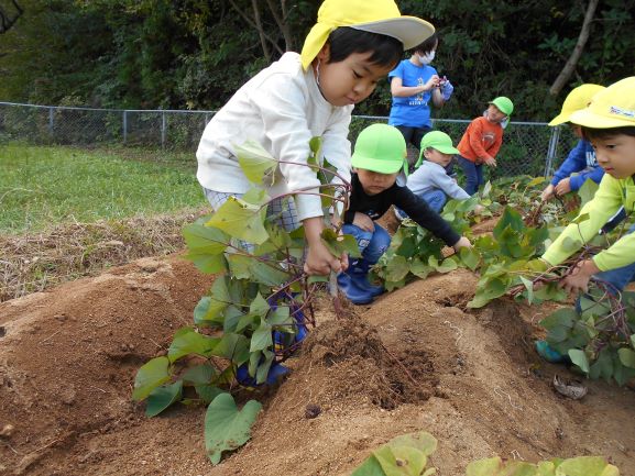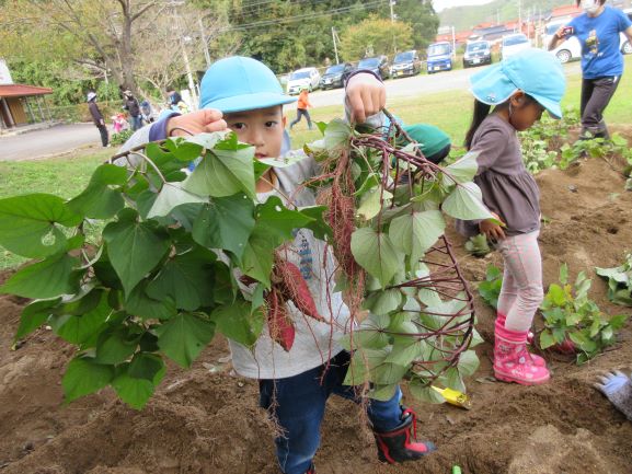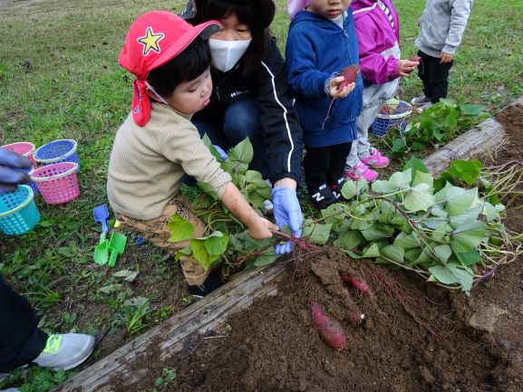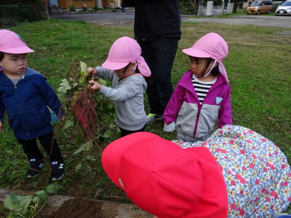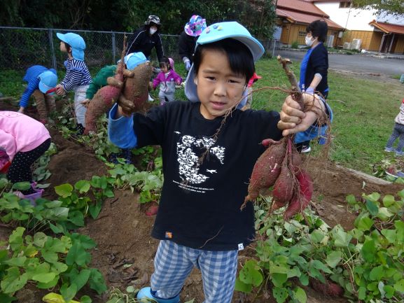 今年は、コロナウイルス感染症防止のため地域講師さんと一緒にお芋掘りができず残念でしたが、6月に苗を植え「おおきくなってね」と楽しみにしていた子どもたちは、「よいしょ、よいしょ」と力いっぱいお芋のつるを引っ張っていました。大きいお芋に「うわ~」と驚いたり、小さいお芋を見つけて「かわいい」と喜んだりして、お芋ほりを楽しむことができました。