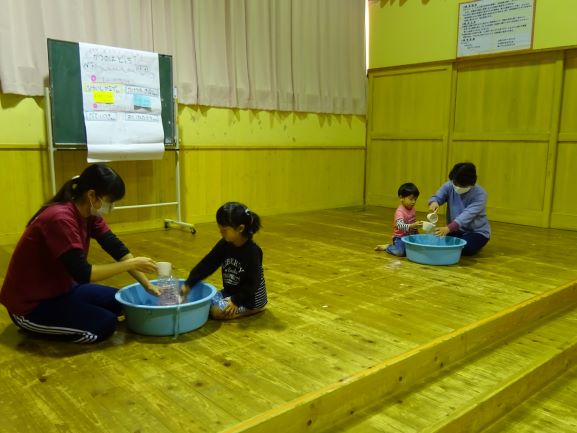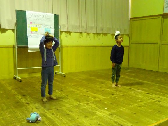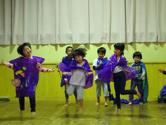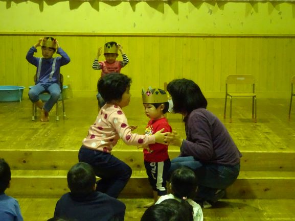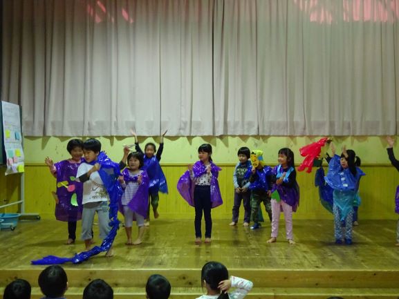 お楽しみ会では、誕生児の友だちや先生たちの対決ゲーム『勝つのはどっち?』とにじ組さんの踊りでした。ハロウィン用に作った衣装を身に付けて可愛らしく、かっこよく踊ってくれました。