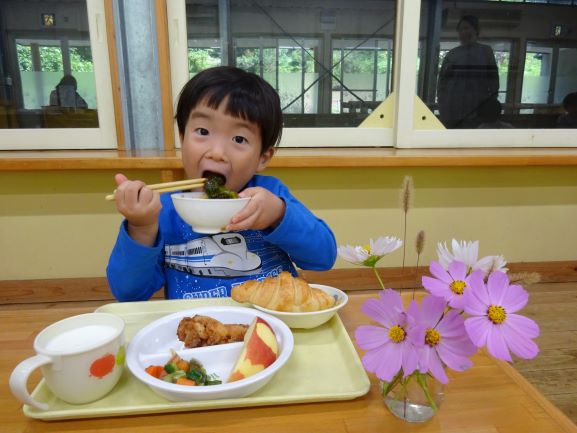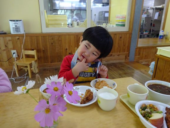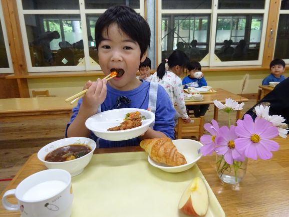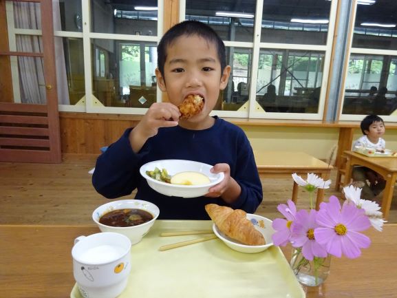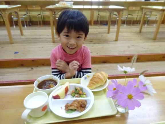 給食も誕生会用の特別メニューで「わあ、おいしそう!」「これ、おかわりしよう」とみんな笑顔でおかわりをして食べていました。