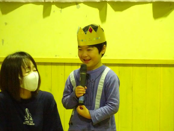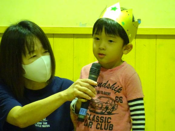 6人の誕生児の誕生会をしました。インタビューでは、好きな食べ物や、遊びを発表しました。