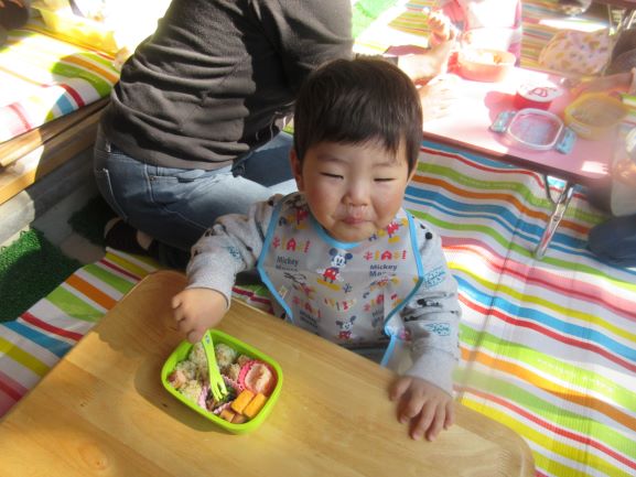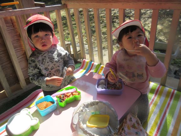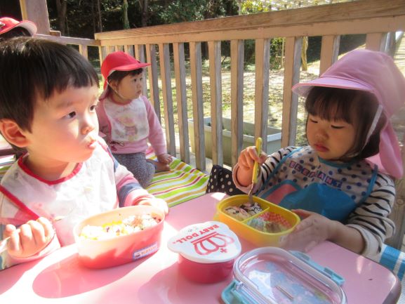 保育所に帰ってから、テラスでお弁当を食べました。